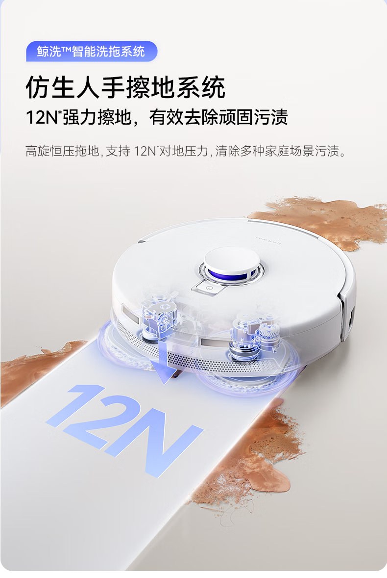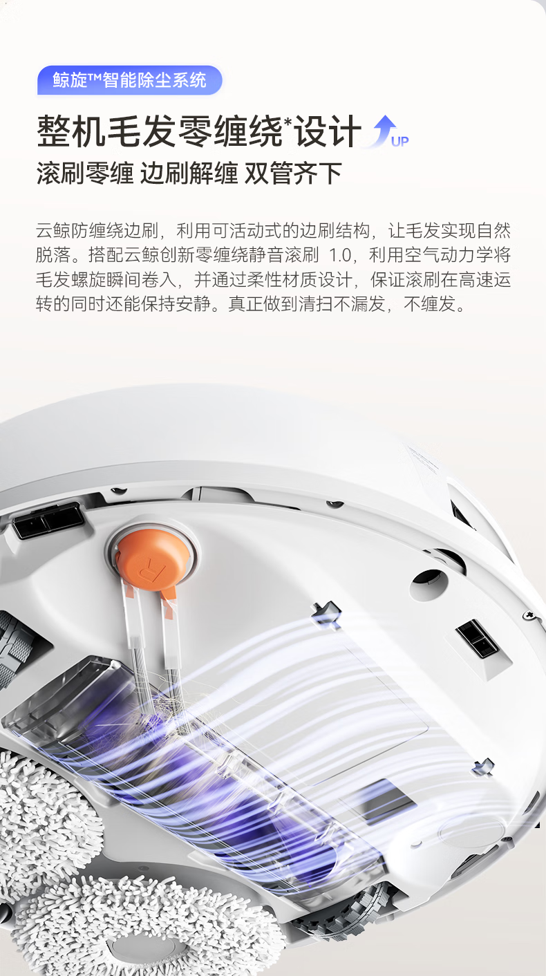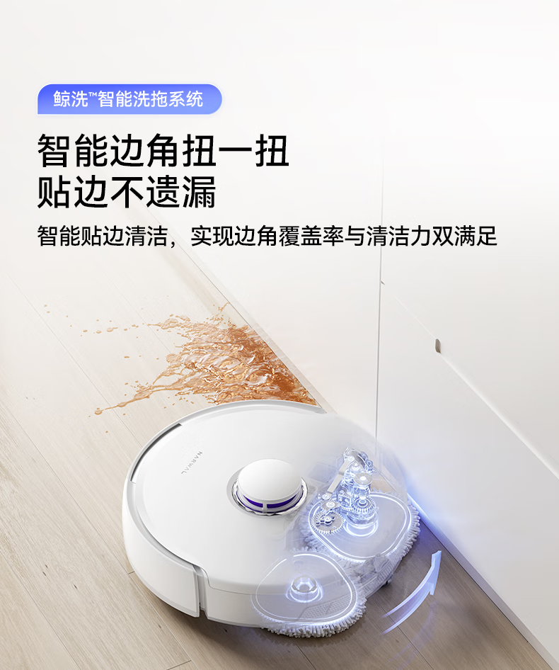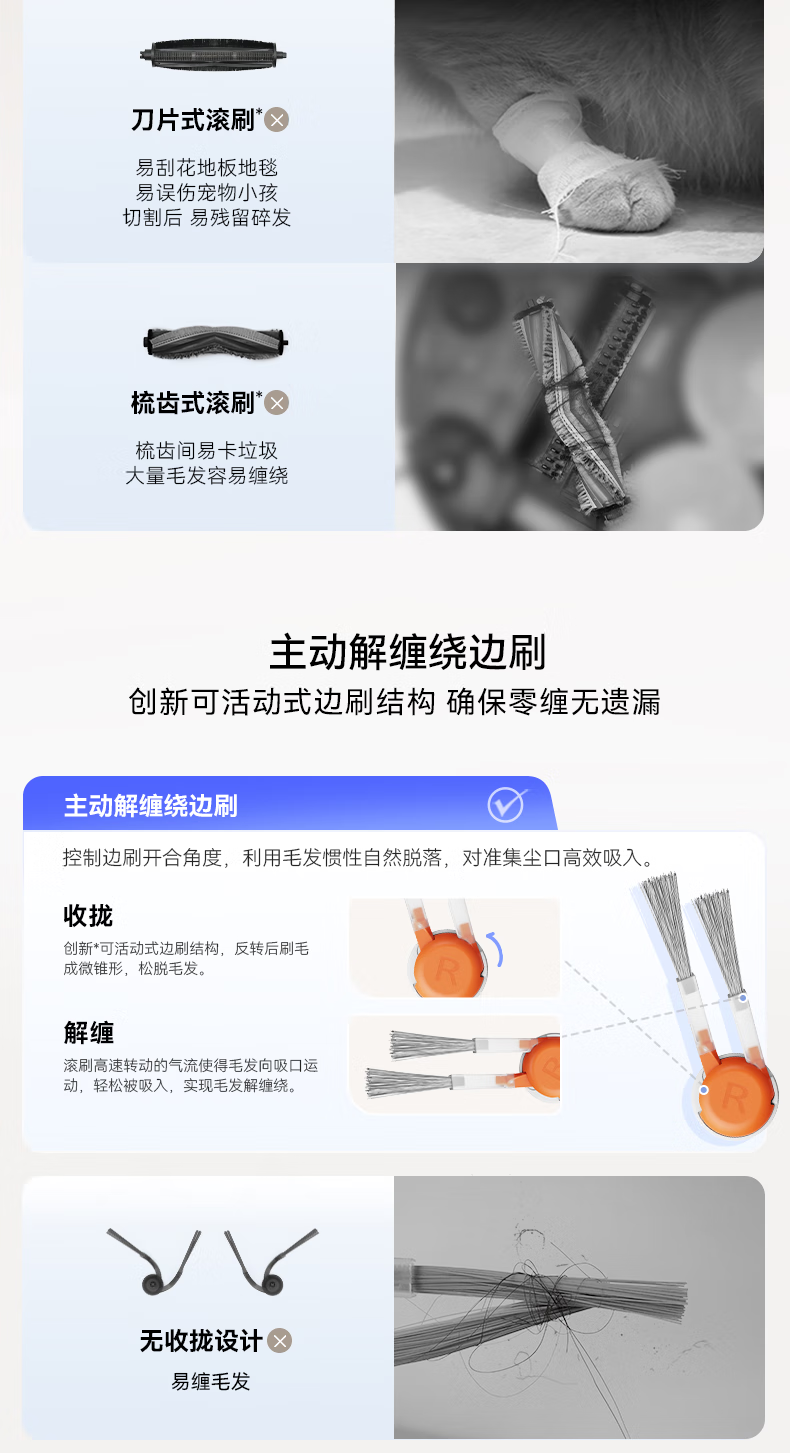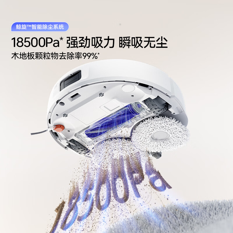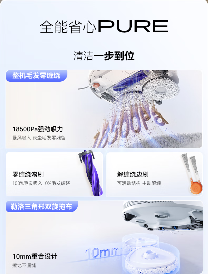 18500Pa强劲吸力;解缠绕边刷 ,可活动结构主动解缠;智能扭一扭贴边