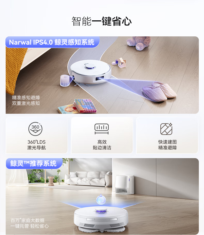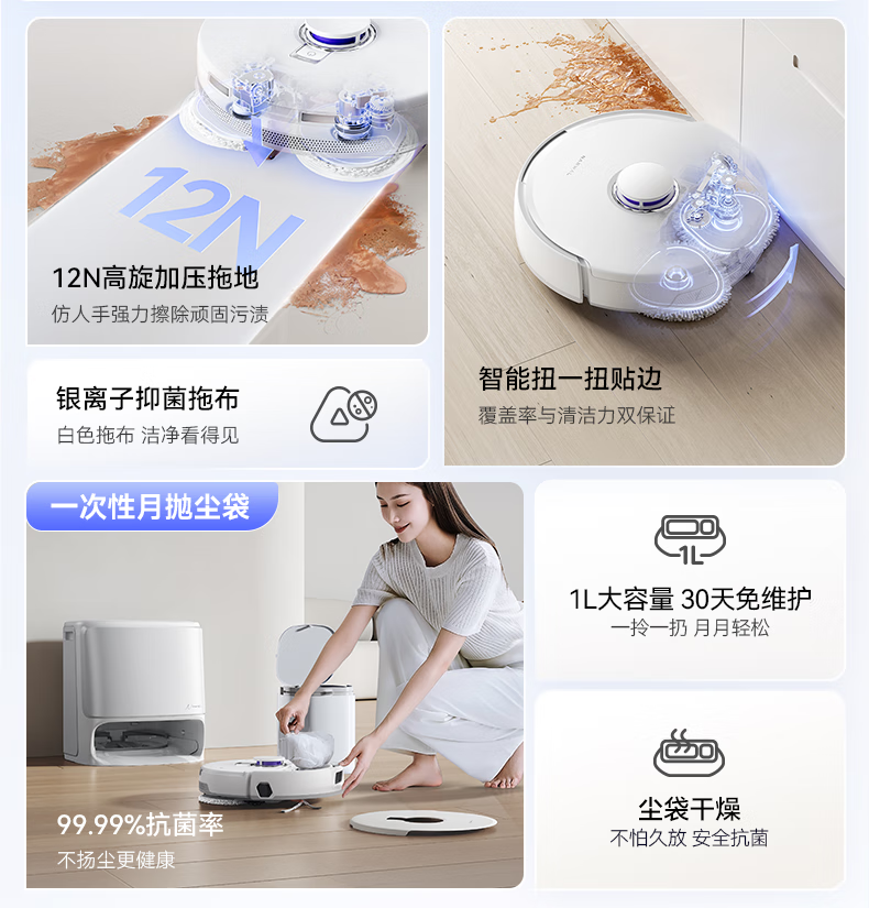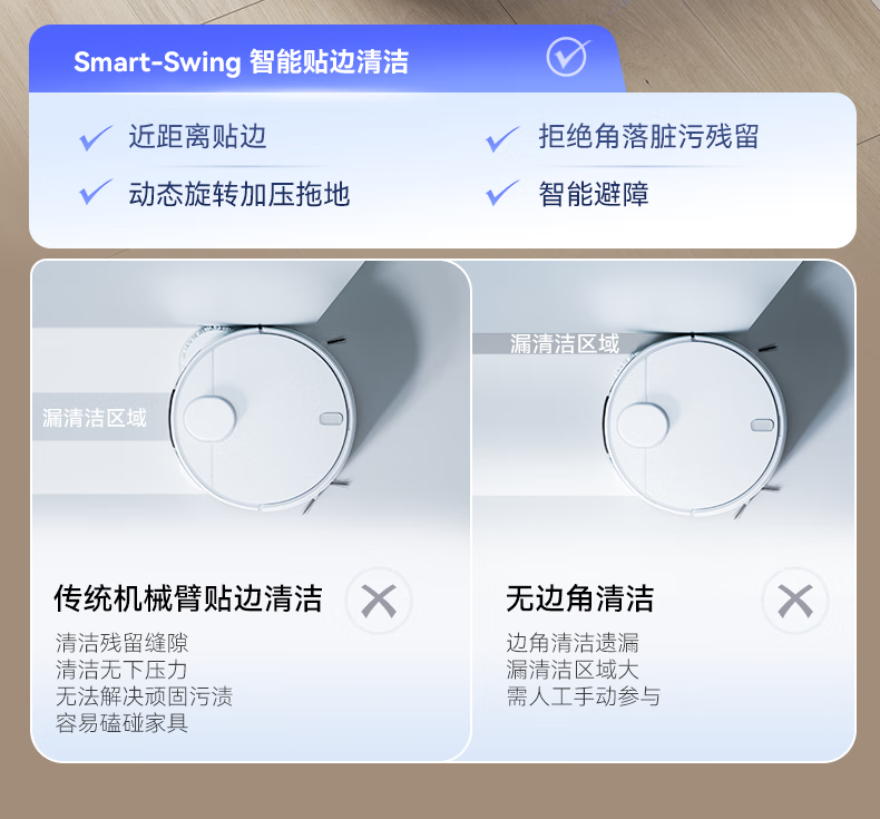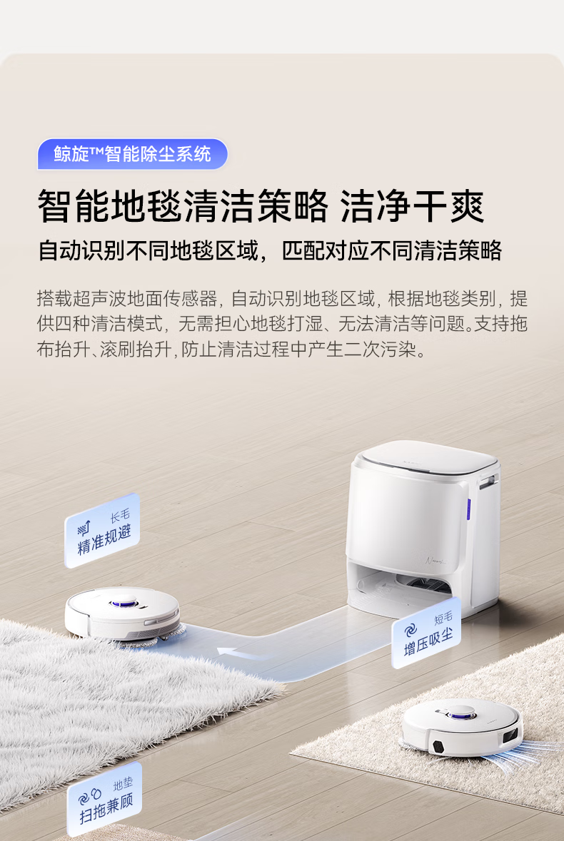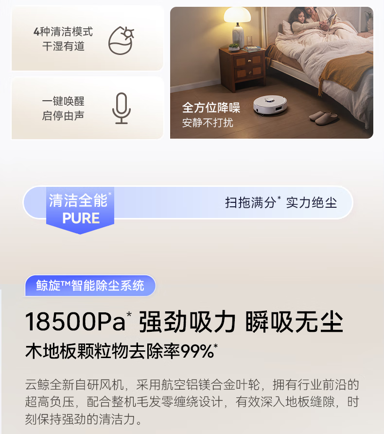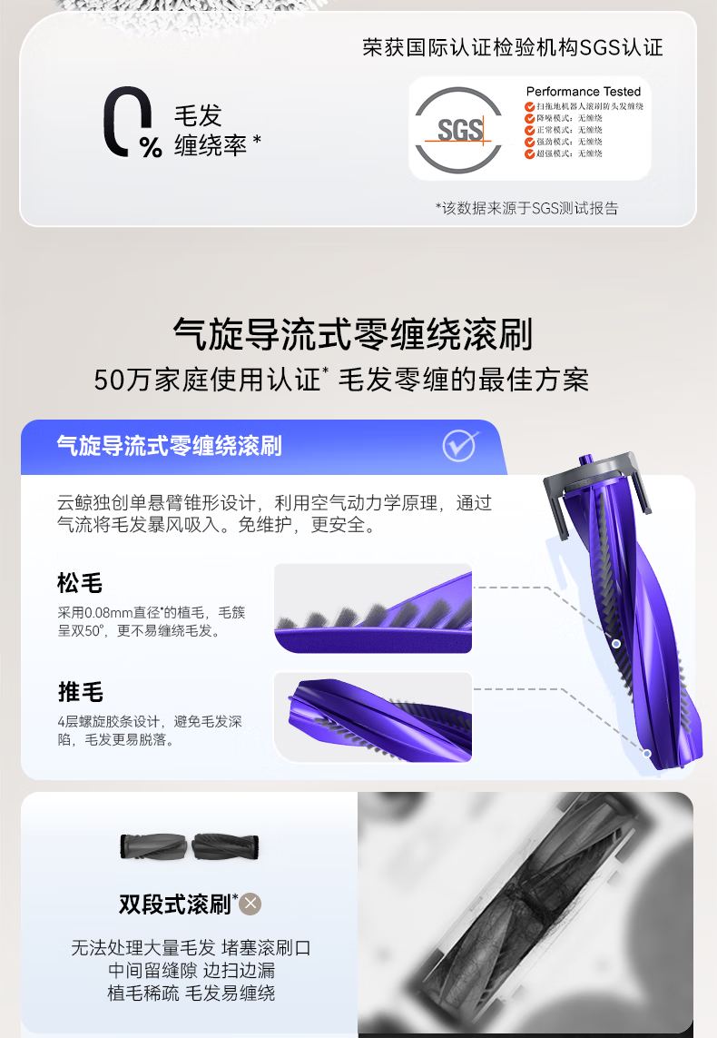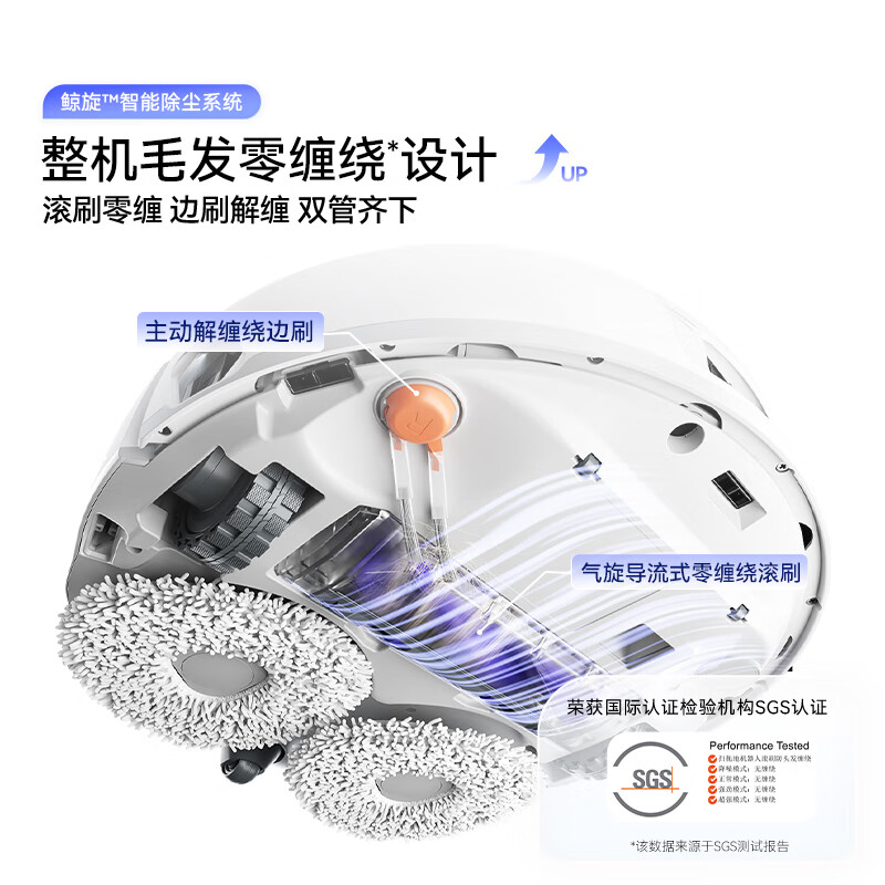 18500Pa强劲吸力;解缠绕边刷 ,可活动结构主动解缠;智能扭一扭贴边