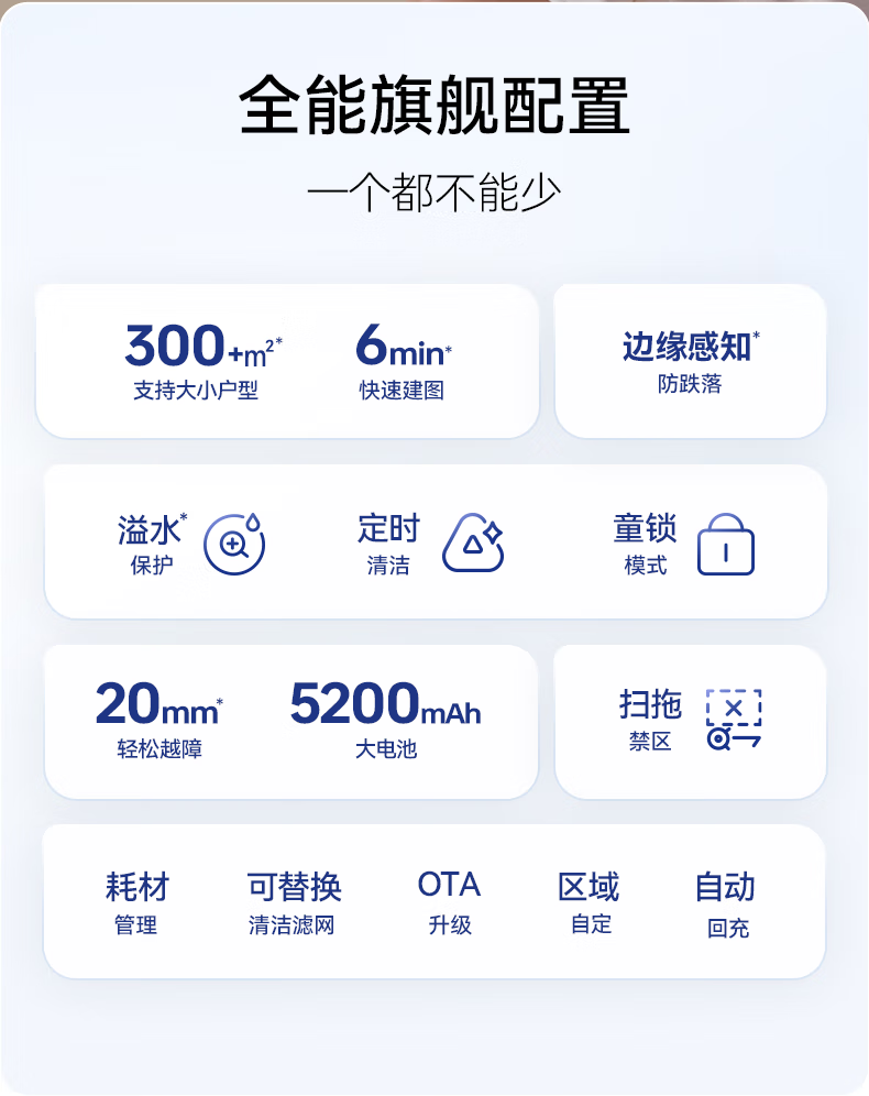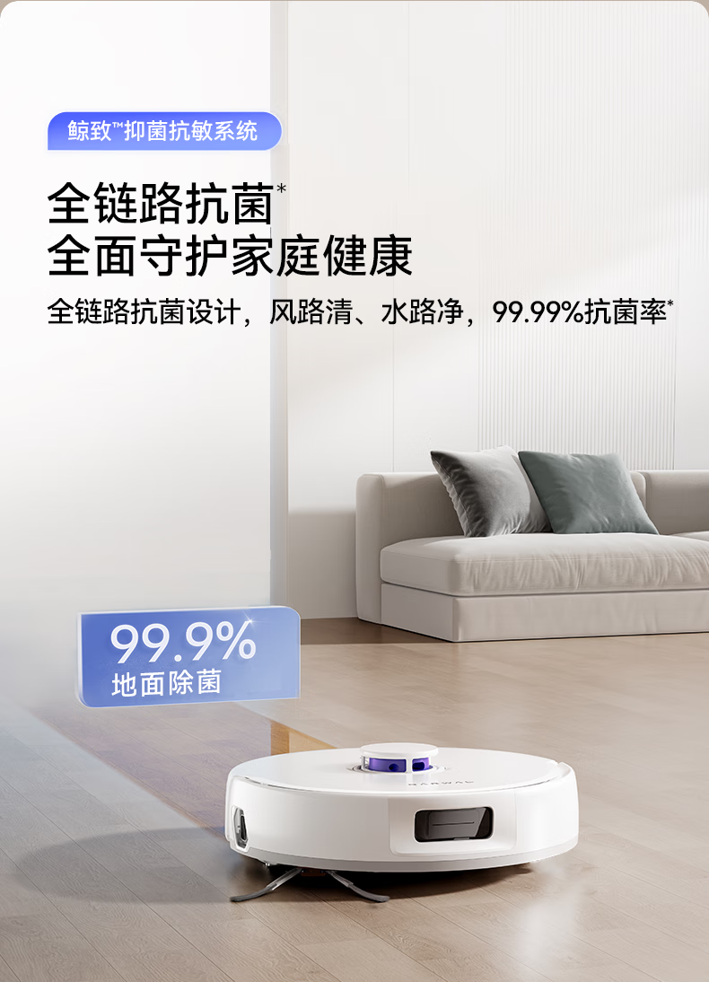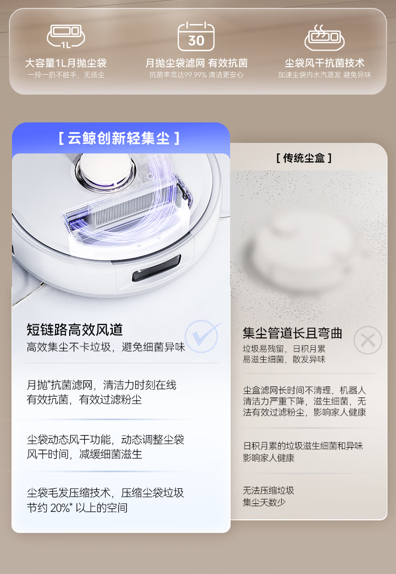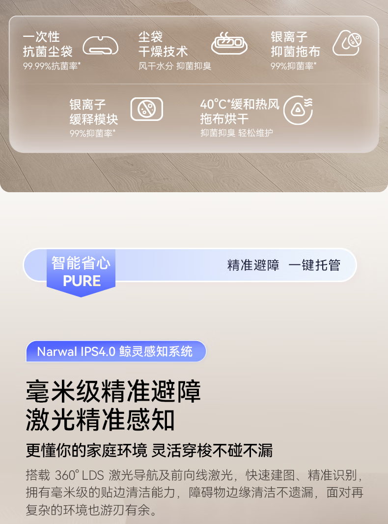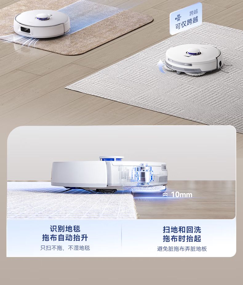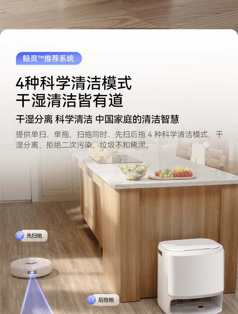 18500Pa强劲吸力;解缠绕边刷 ,可活动结构主动解缠;智能扭一扭贴边