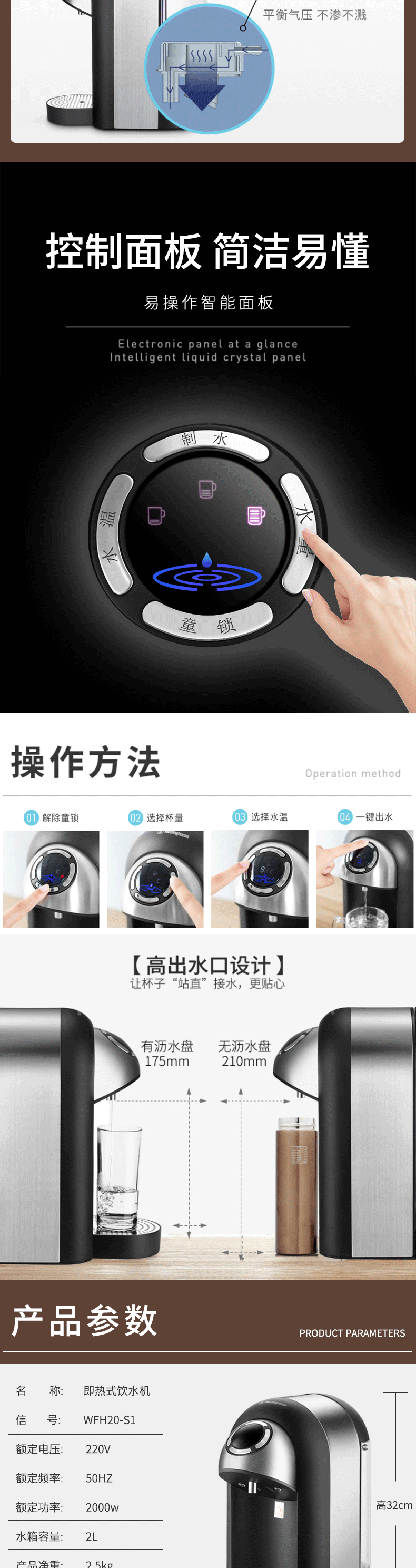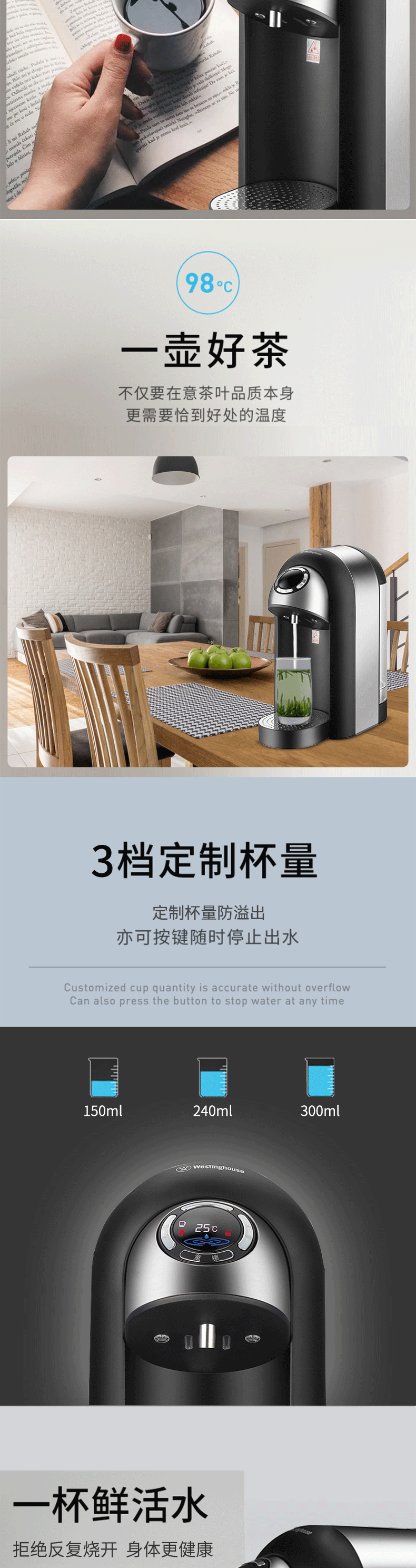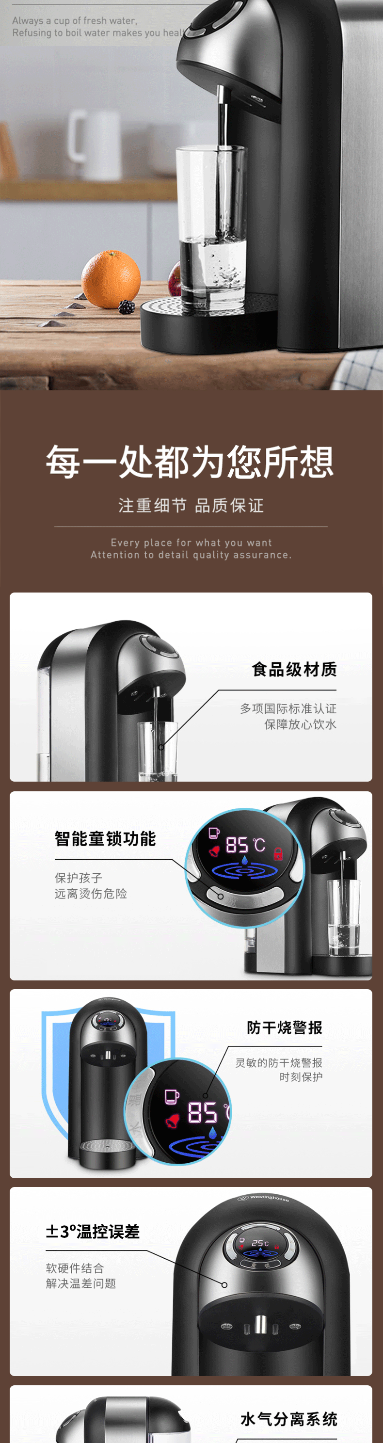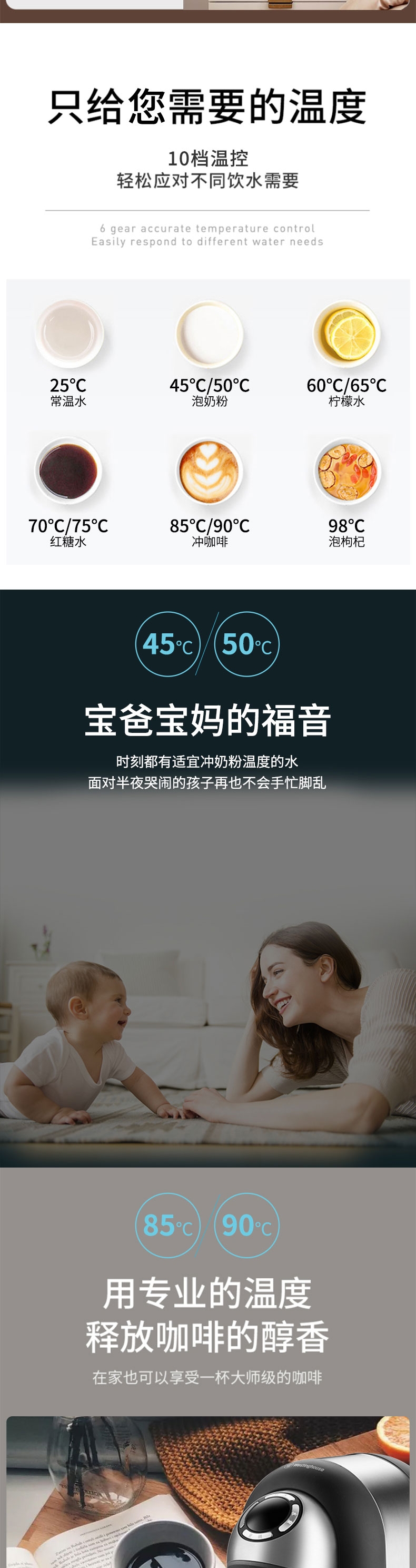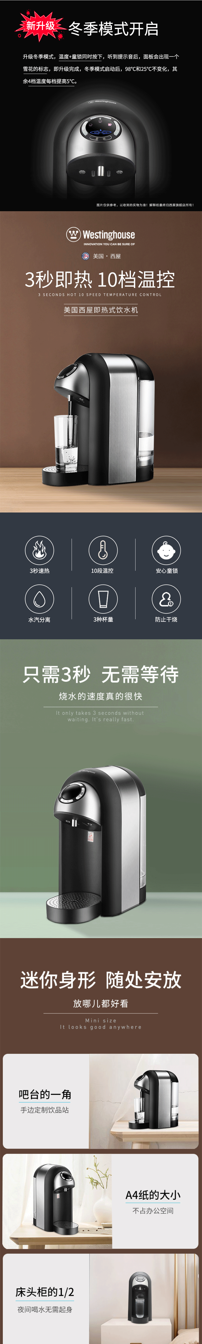 免安装,迷你身形,适用多场景;采用厚膜速热技术,3S速热,即开即饮,新鲜健康,杜;8档温度调整,泡奶、热饮、咖啡等随心所欲;灵敏防干烧+童锁保障安全,专注每个安全细节;涉水部件全部食品级材料,安全不减料