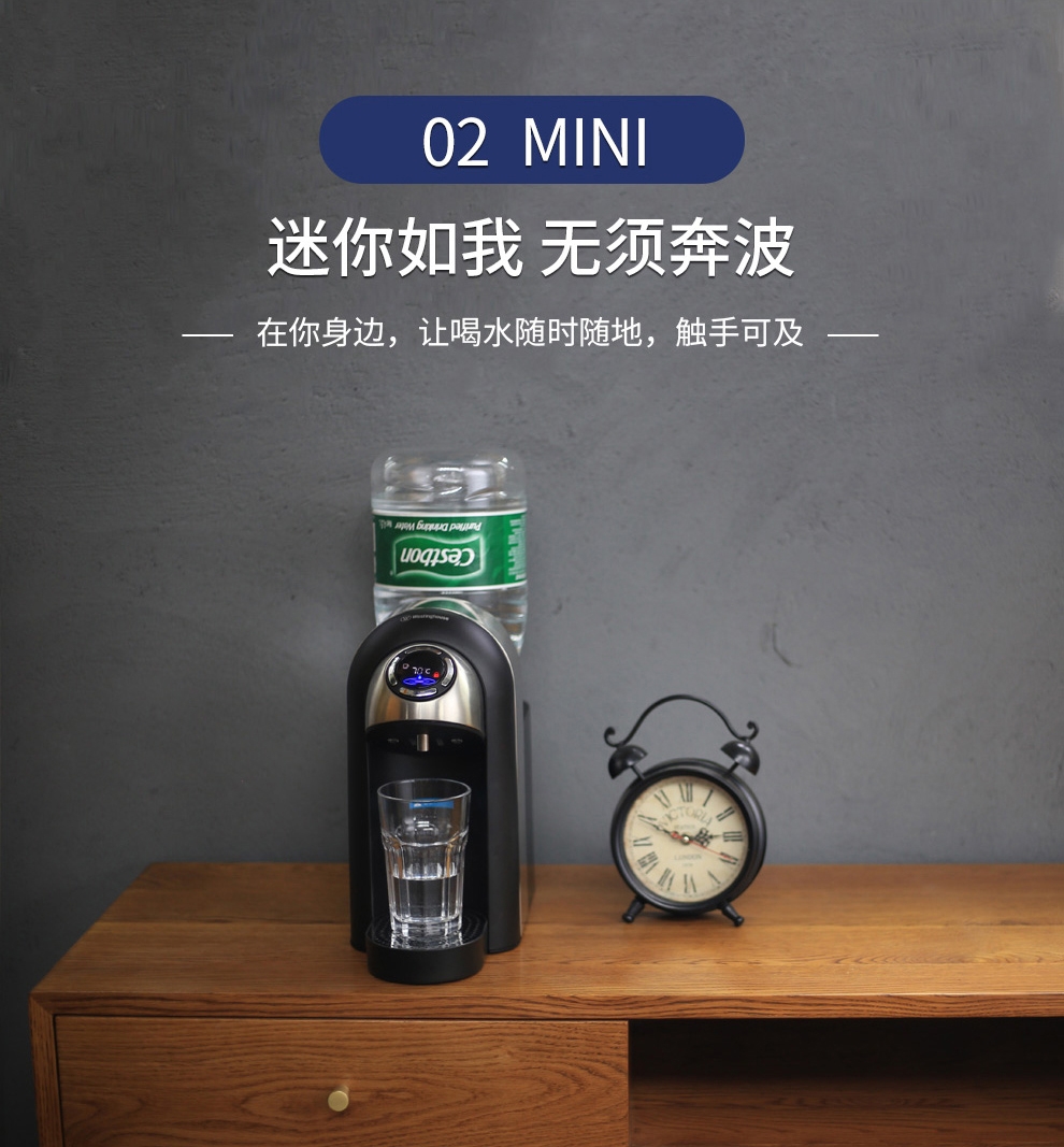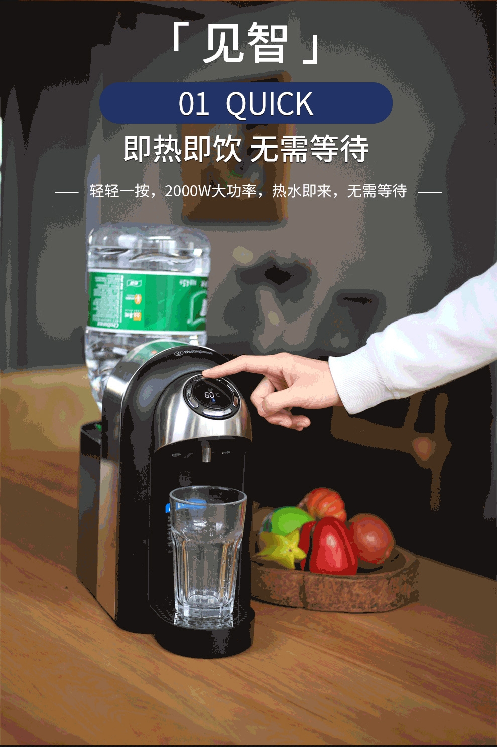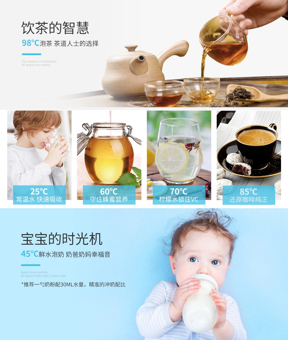 小巧免安装,任意安装,不让喝水打扰您的灵感;采用厚膜速热技术,3S速热,即开即饮,新鲜健康,杜;6档温度调整,泡奶、蜂蜜、热饮、咖啡、 茶,随心所;童锁保障安全,专注每个安全细节;;涉水部件全部食品级材料,安全不减料