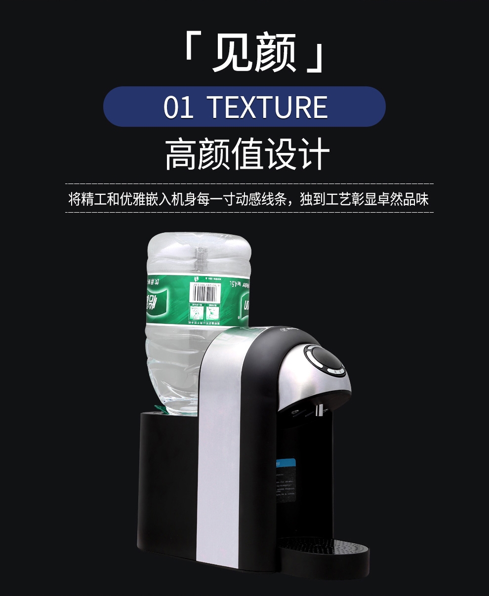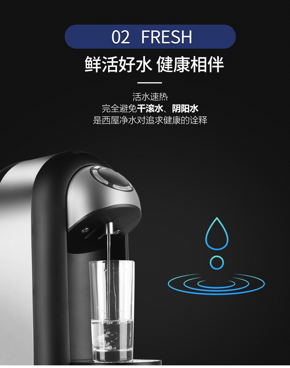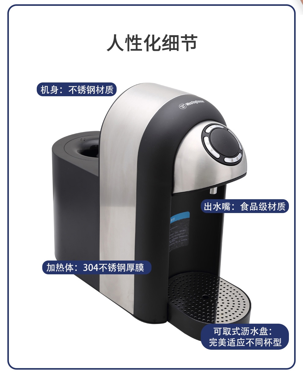 小巧免安装,任意安装,不让喝水打扰您的灵感;采用厚膜速热技术,3S速热,即开即饮,新鲜健康,杜;6档温度调整,泡奶、蜂蜜、热饮、咖啡、 茶,随心所;童锁保障安全,专注每个安全细节;;涉水部件全部食品级材料,安全不减料