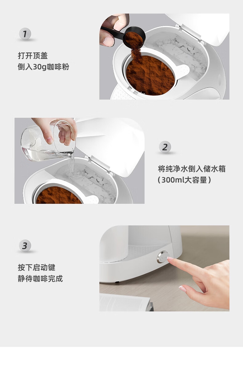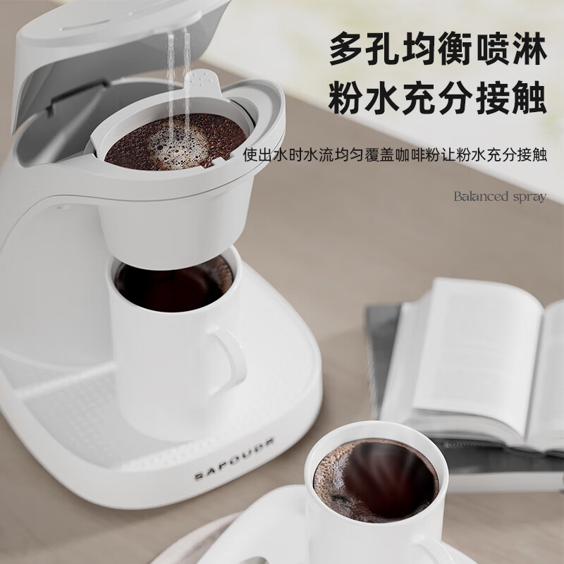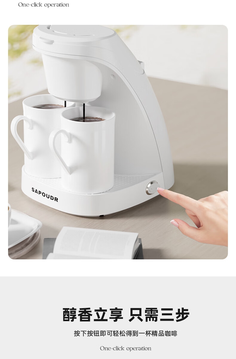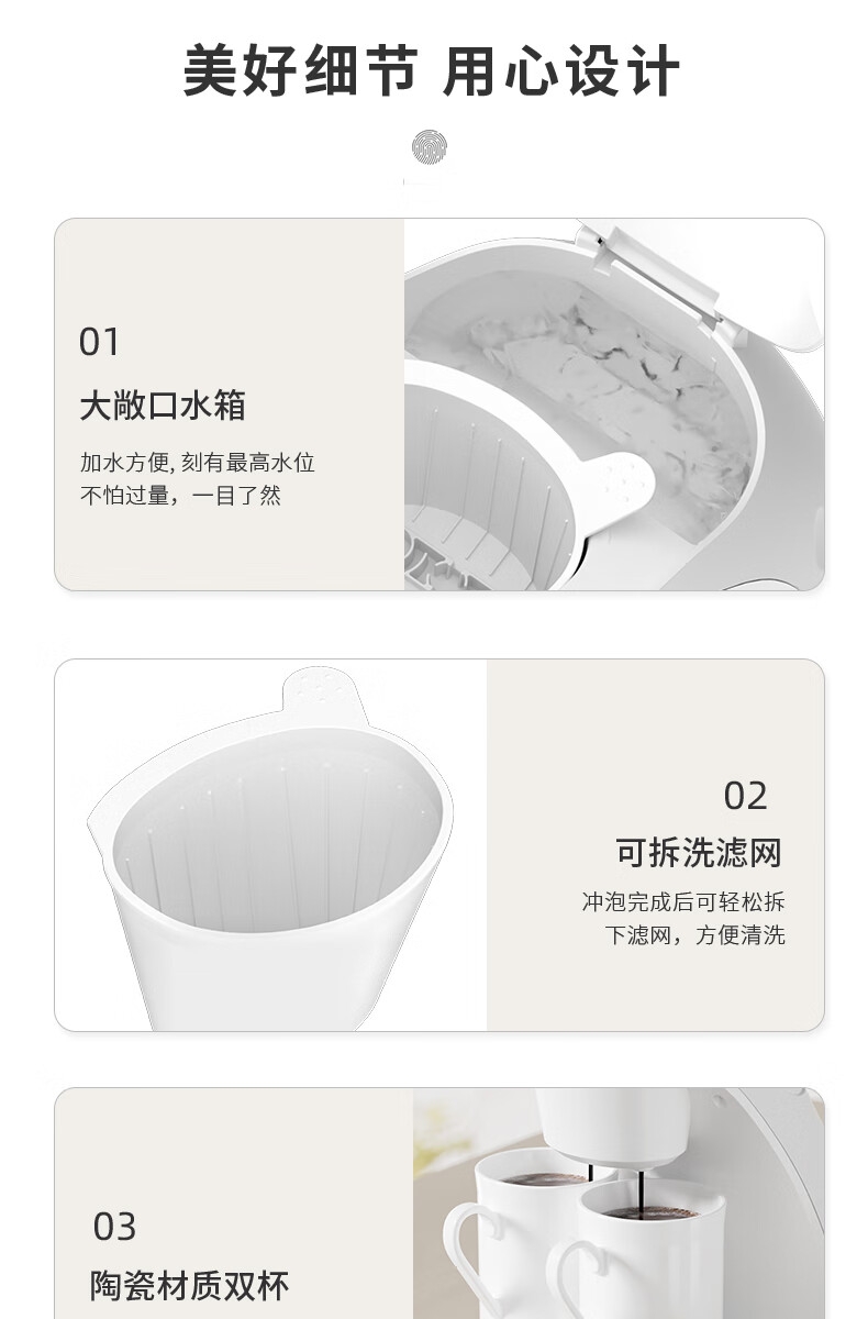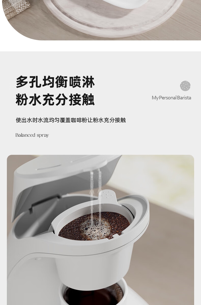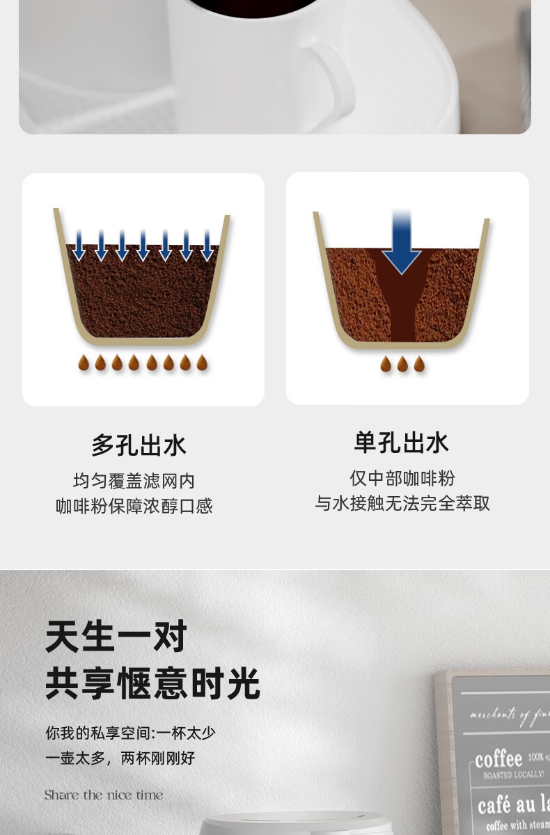 多孔均衡喷淋,粉水充分接触;一键式操作,轻松畅享咖啡时刻;可拆洗滤网,冲泡完成后可轻松拆下滤网