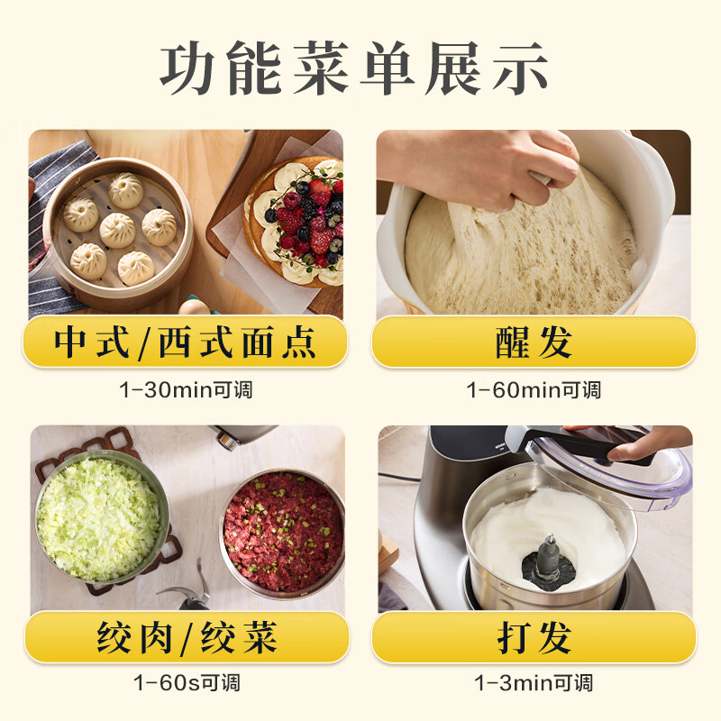 专碗专刀,食材分类不串味;面食一步到位,和面/馅料/发酵/打发;中西式面点双模式,中式筋道&西式柔软