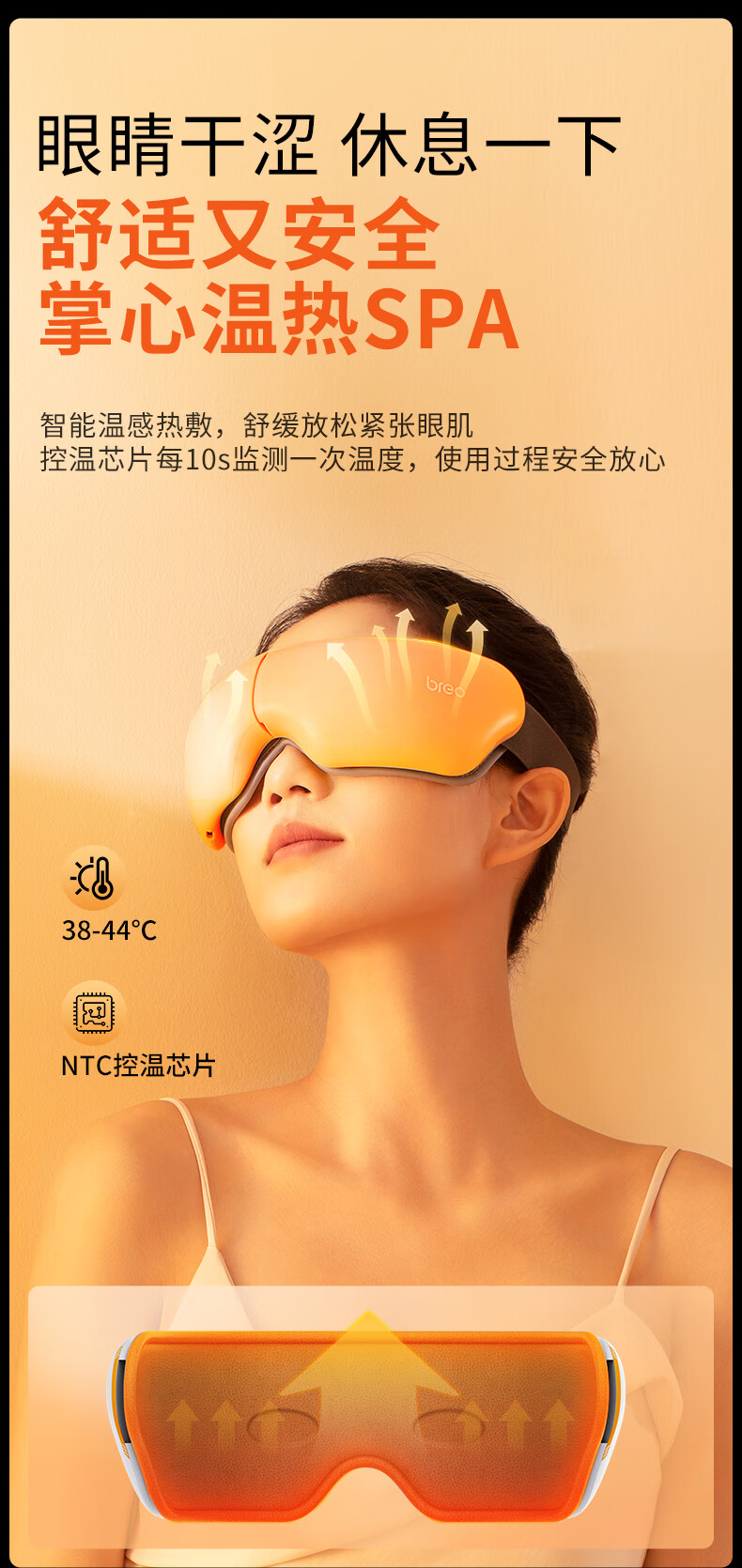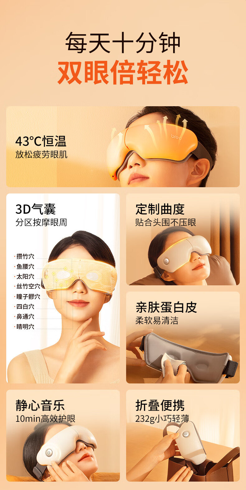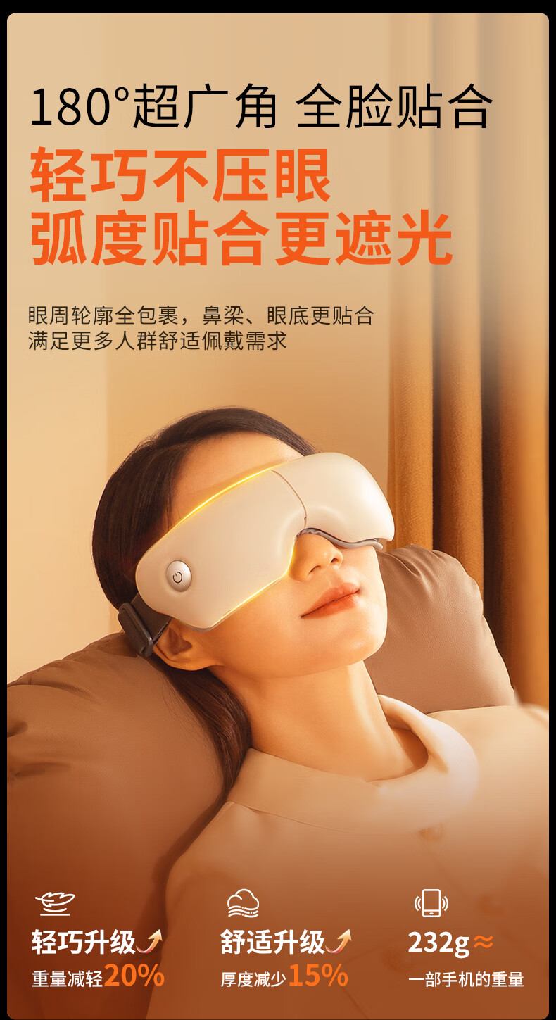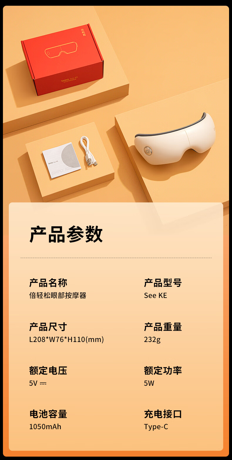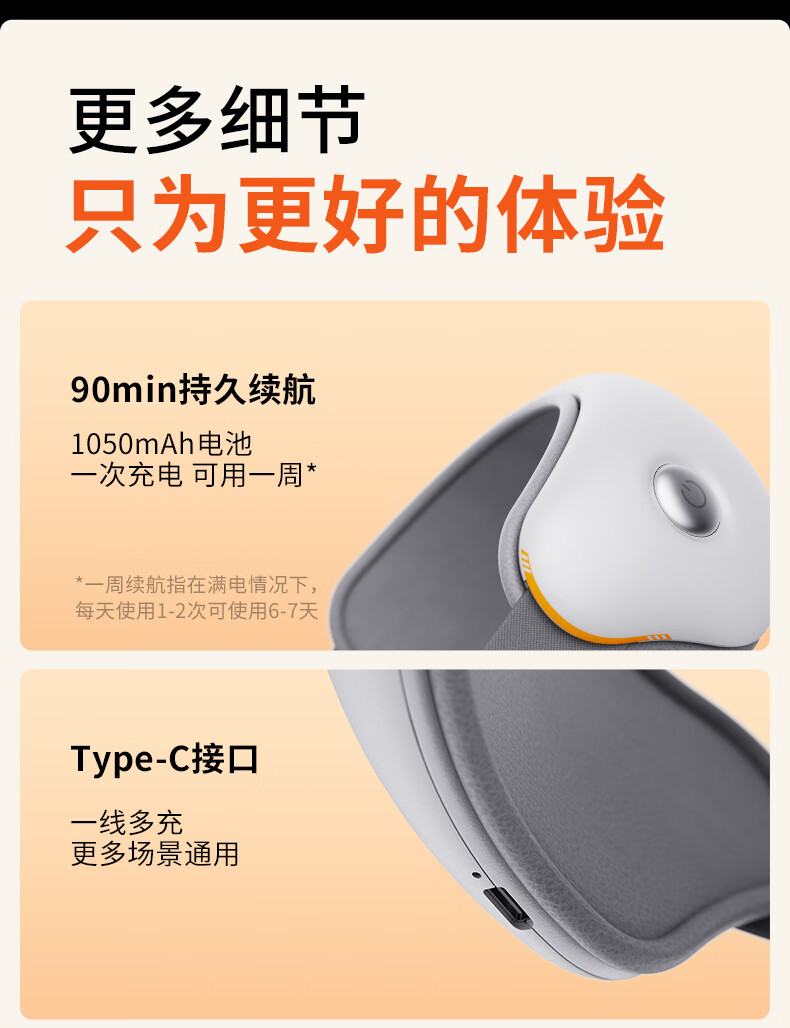 1050mAh电池,续航时间约为90分钟;可折叠,方便携带;三种模式:放松、活力、睡眠。一键切换,操作便捷