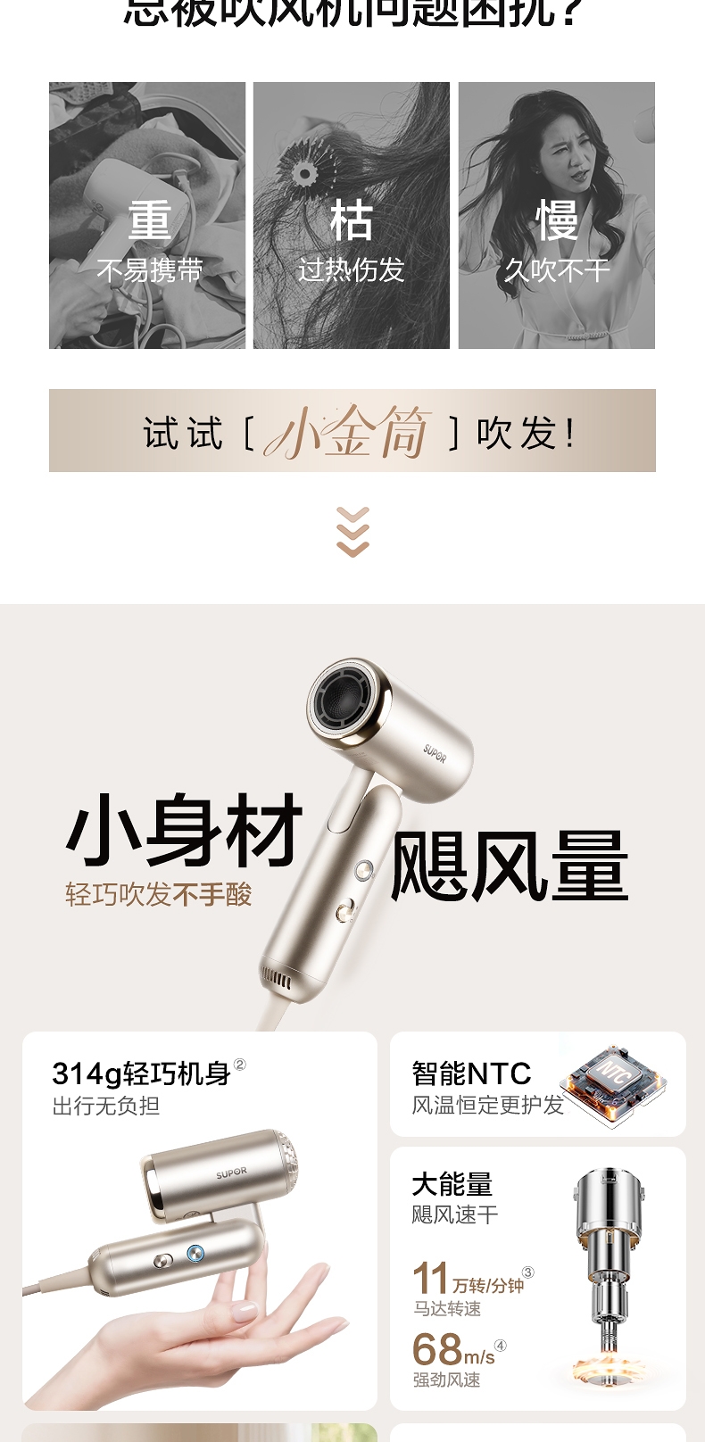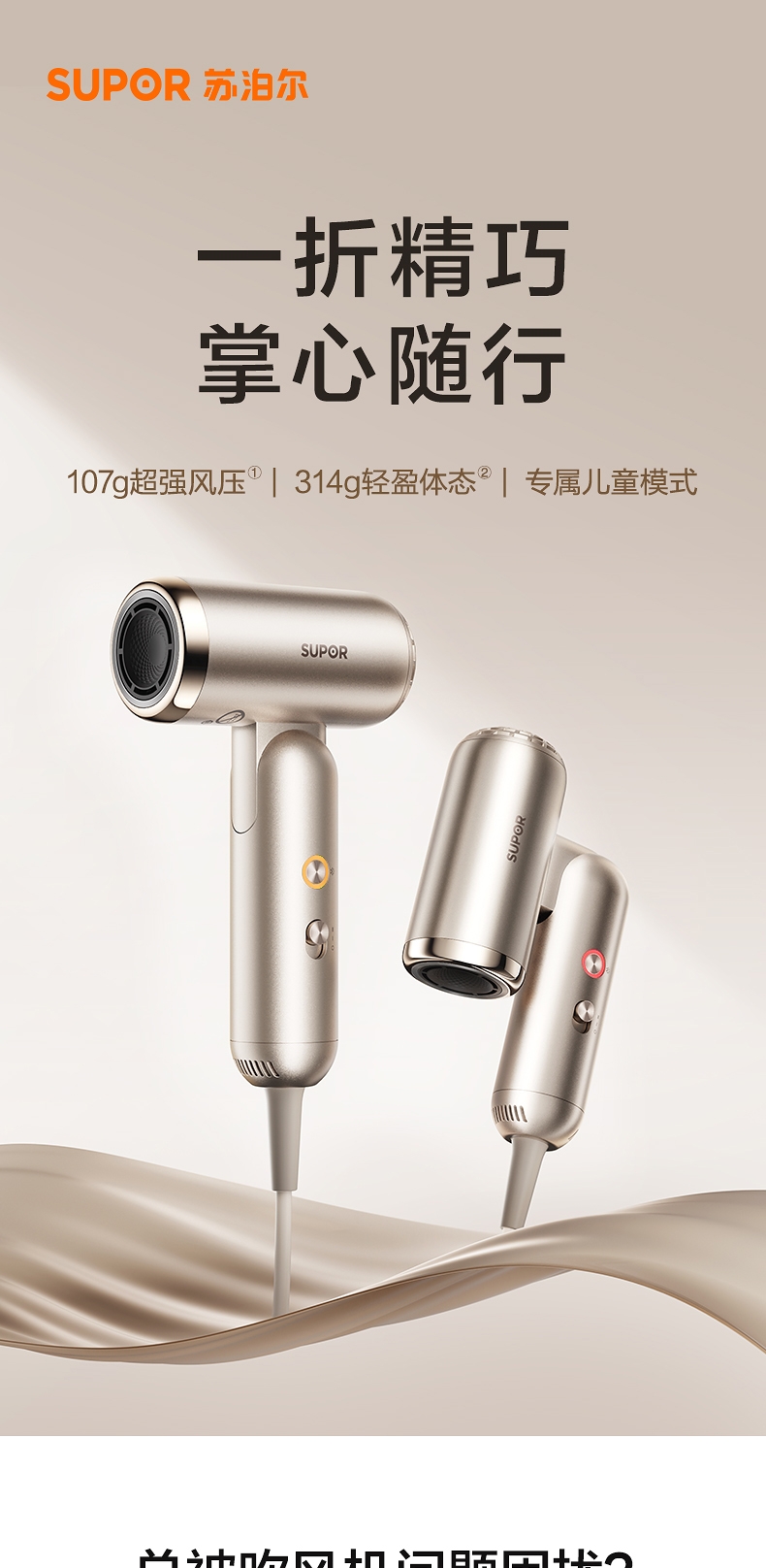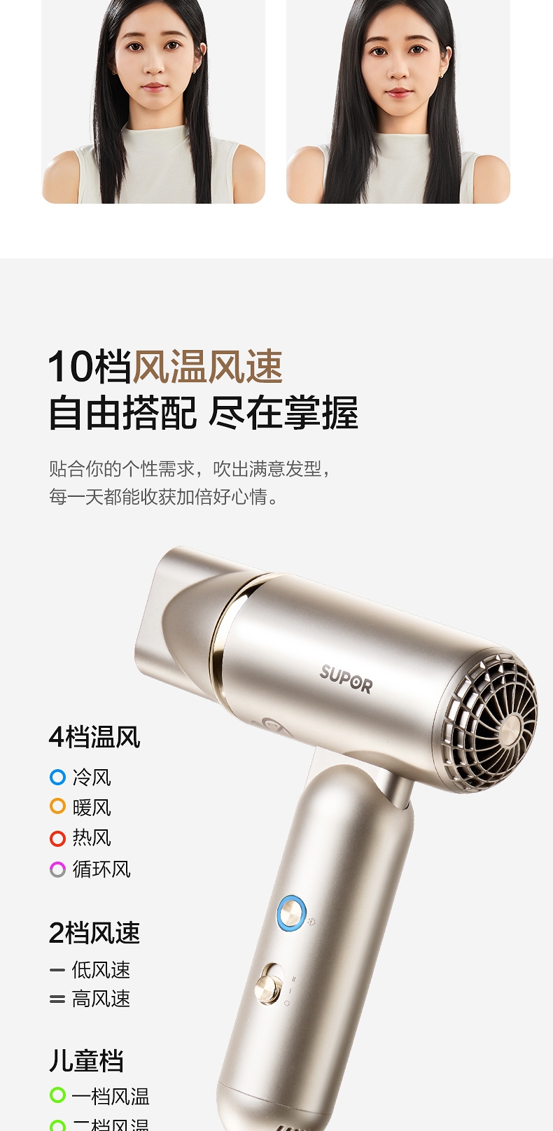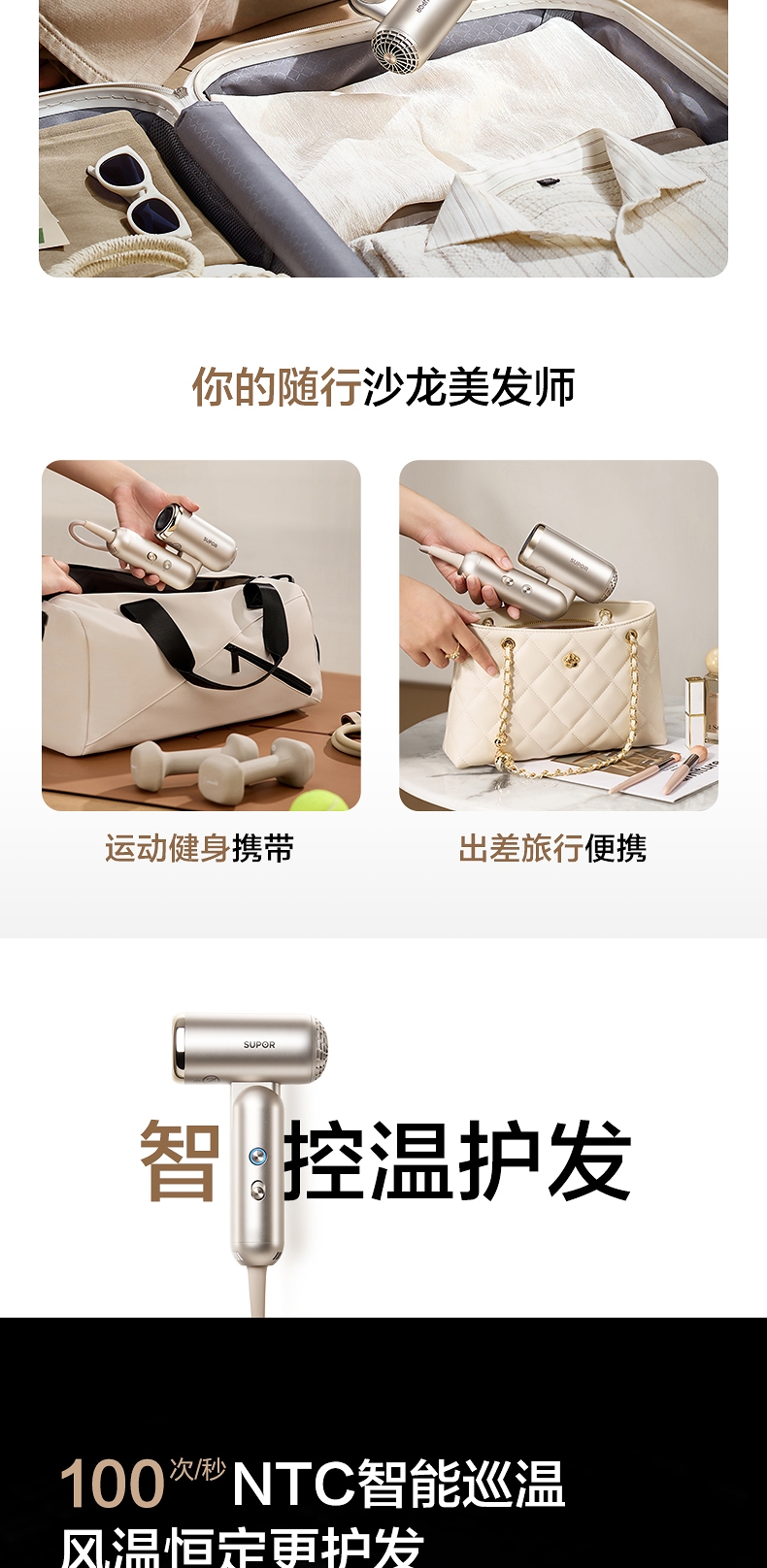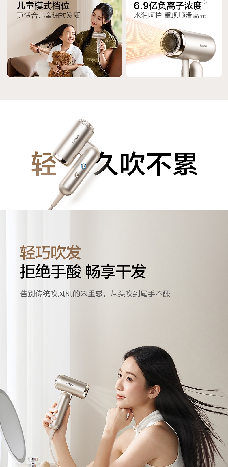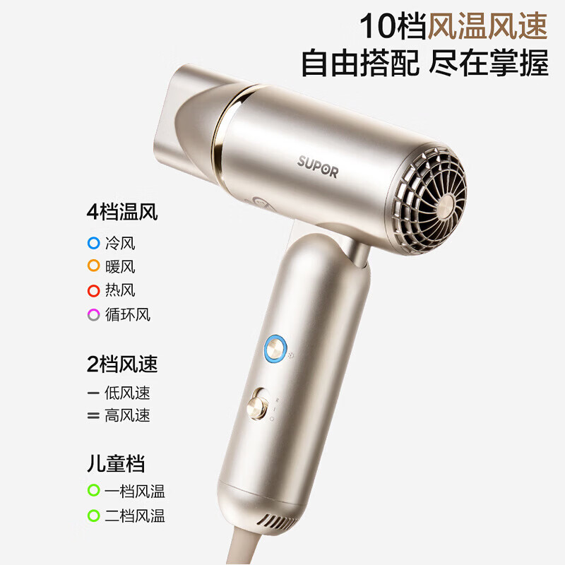 可折叠轻量化;智能 NTC 控温 68m/s 疾风速干;专属儿童模式 6.9 亿超高负离子浓度