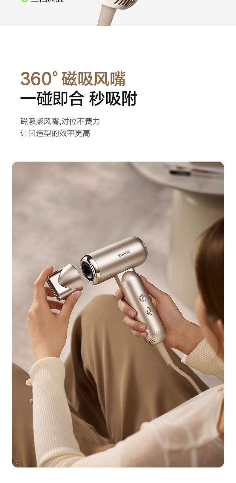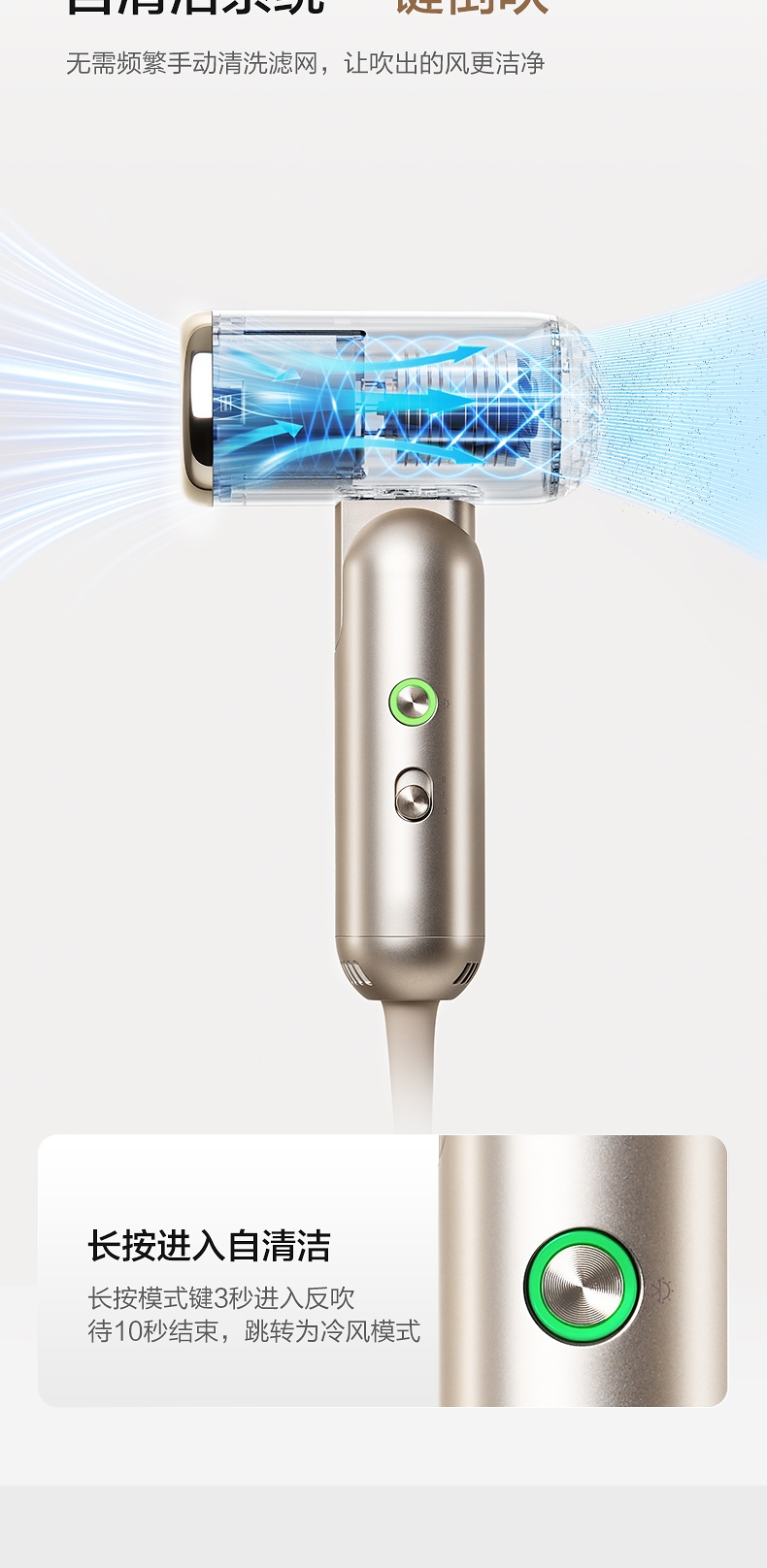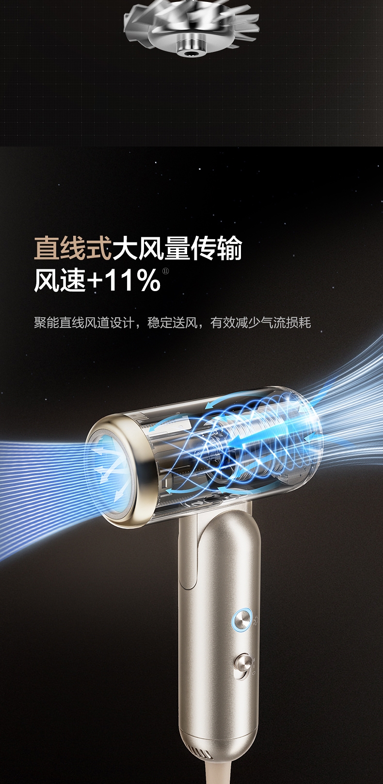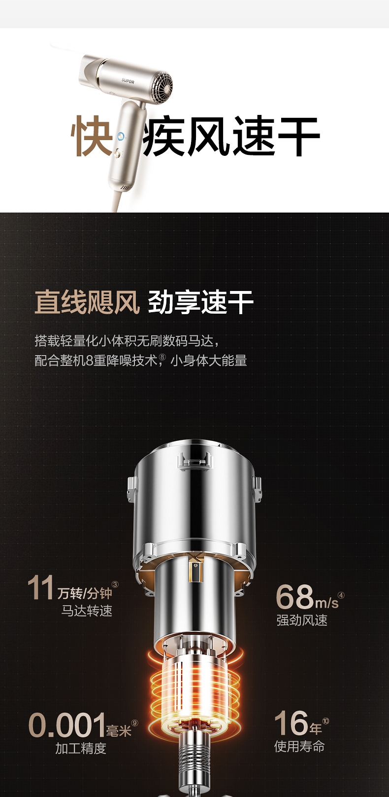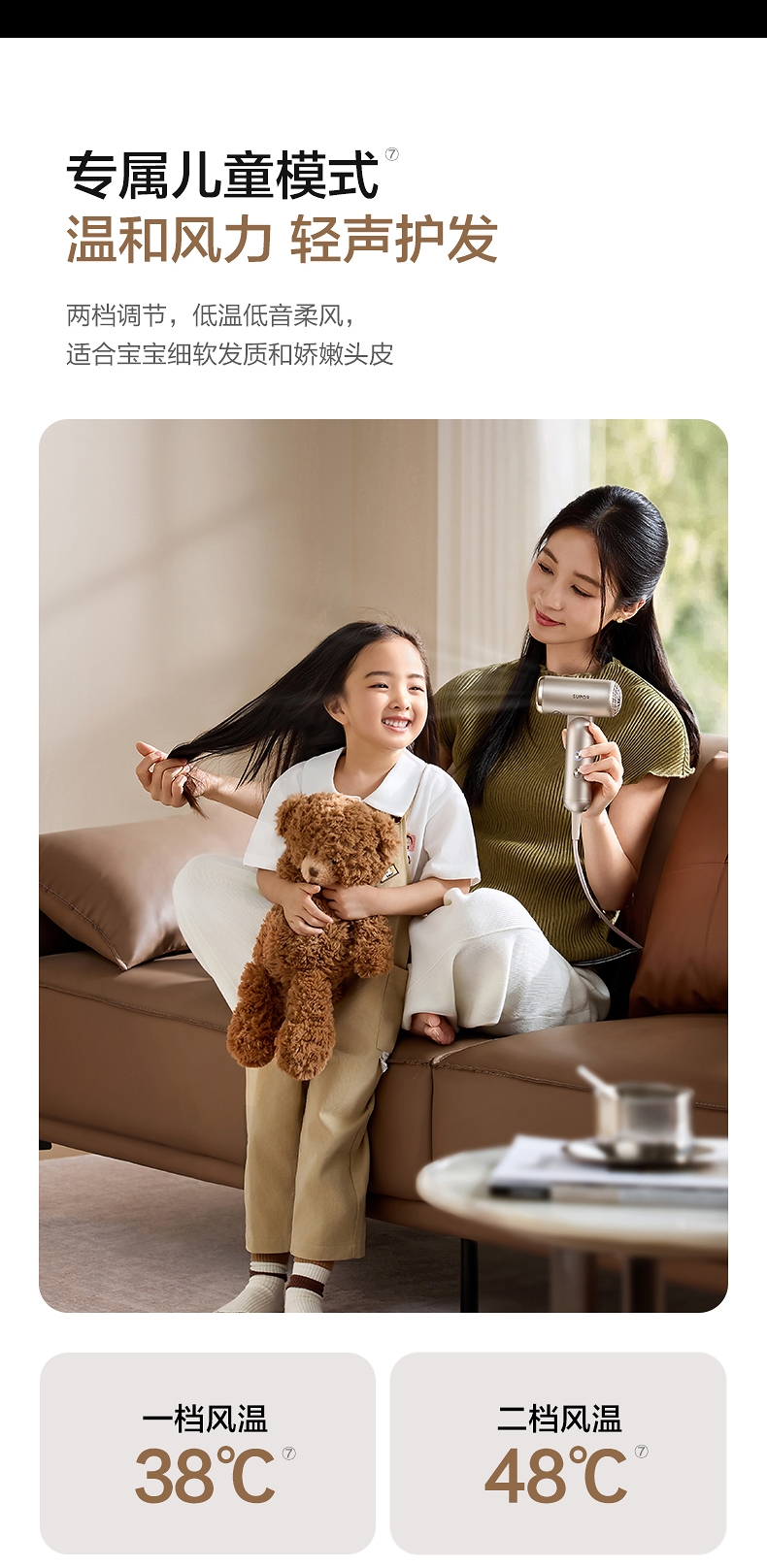 可折叠轻量化;智能 NTC 控温 68m/s 疾风速干;专属儿童模式 6.9 亿超高负离子浓度