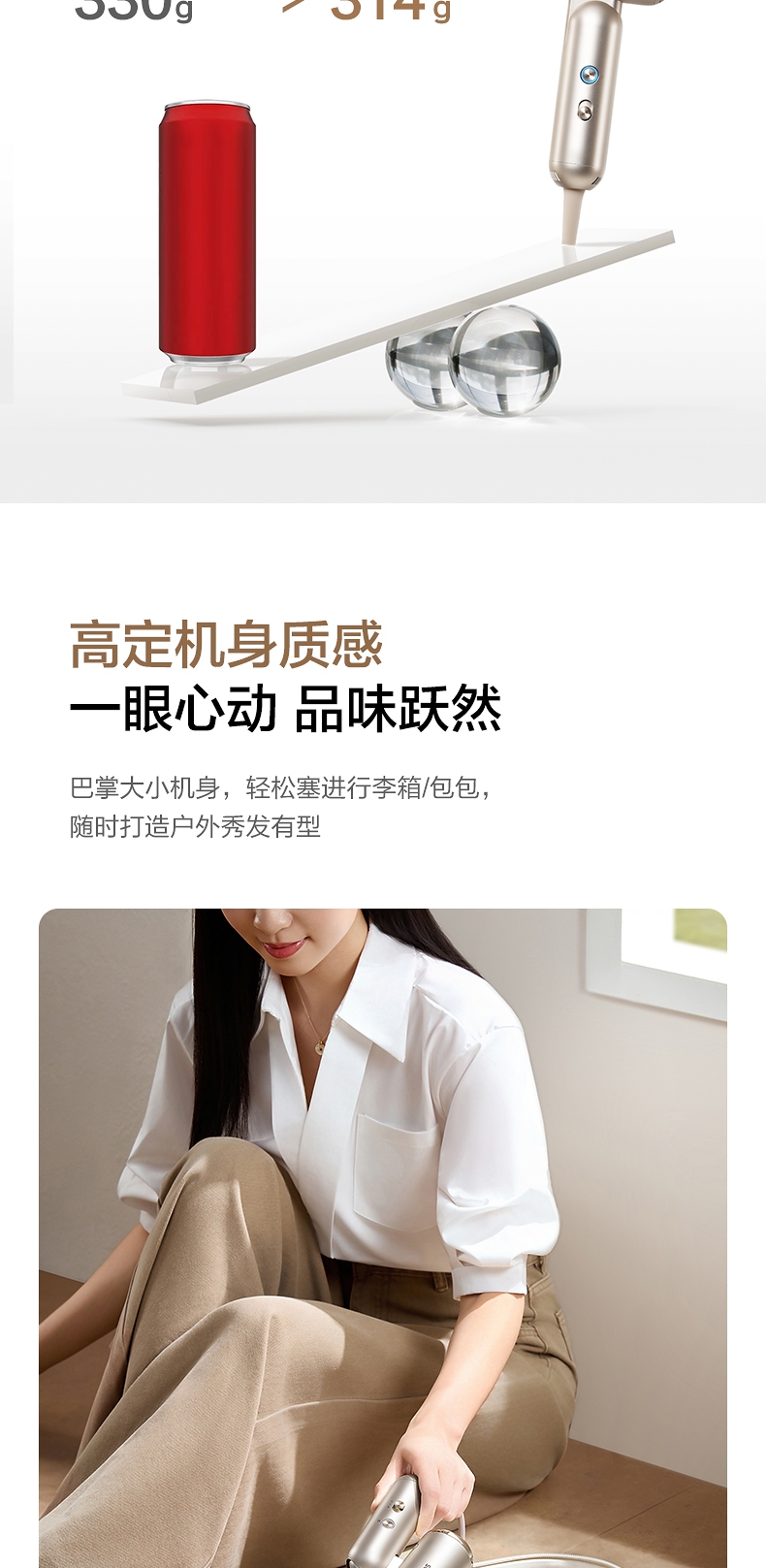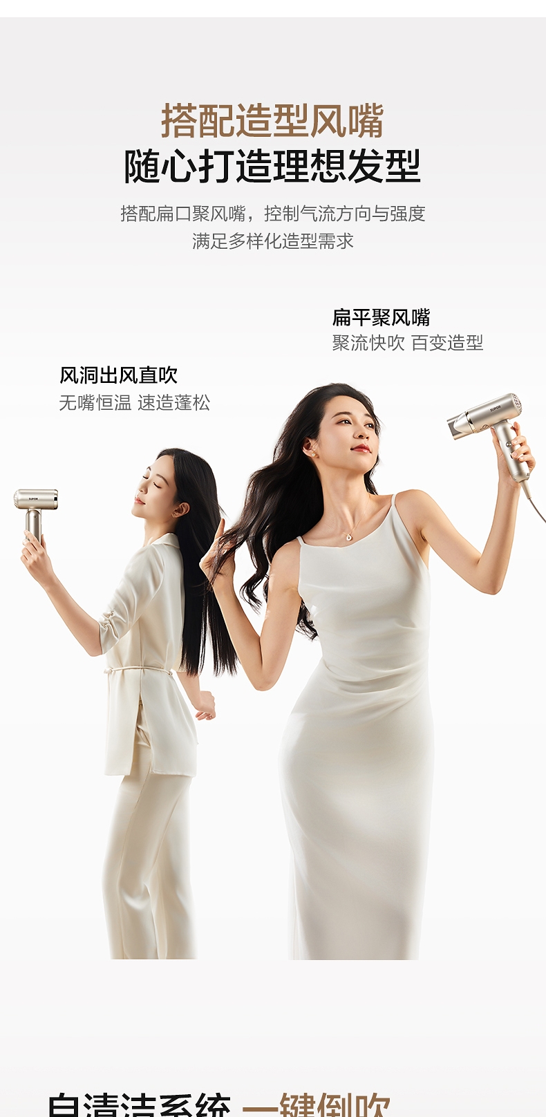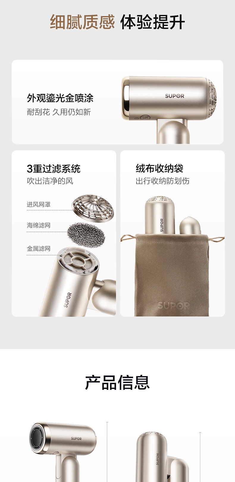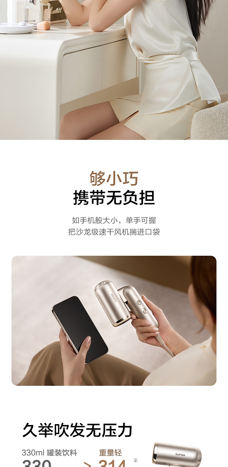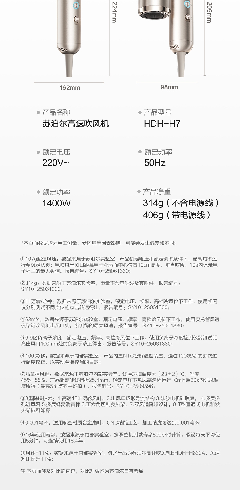 可折叠轻量化;智能 NTC 控温 68m/s 疾风速干;专属儿童模式 6.9 亿超高负离子浓度