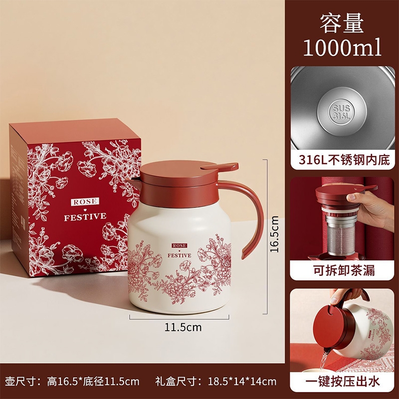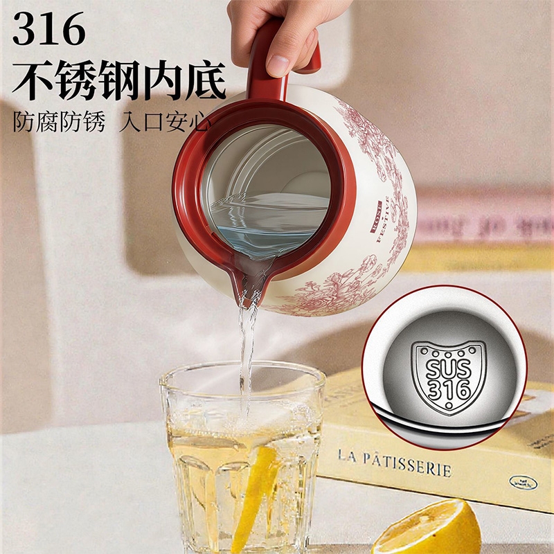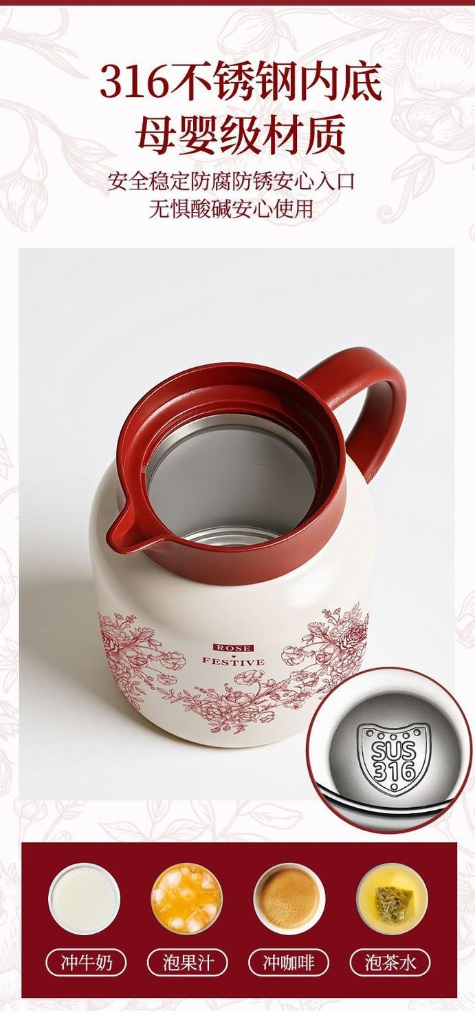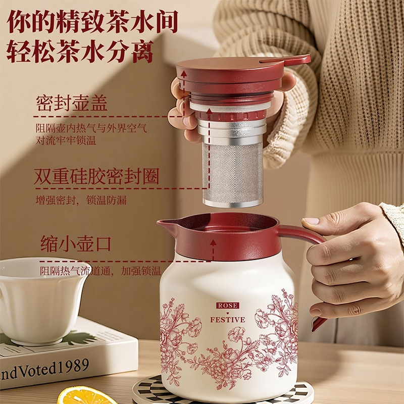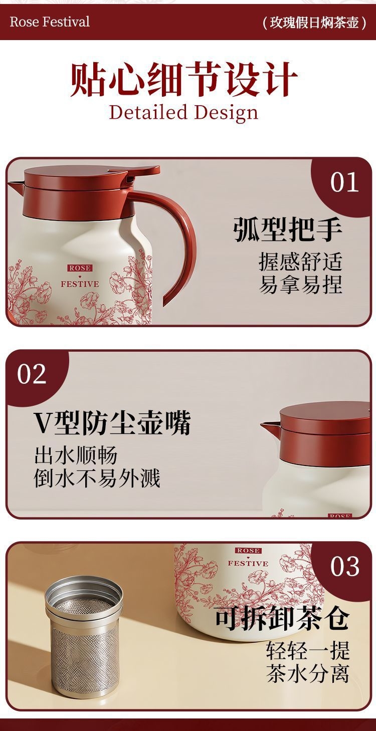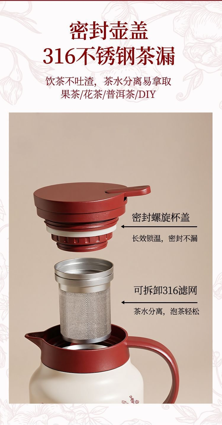 316医用级不锈钢材质;长效保温,密封不漏;V形防尘壶嘴,出水顺畅;可拆卸茶仓,茶会分离
