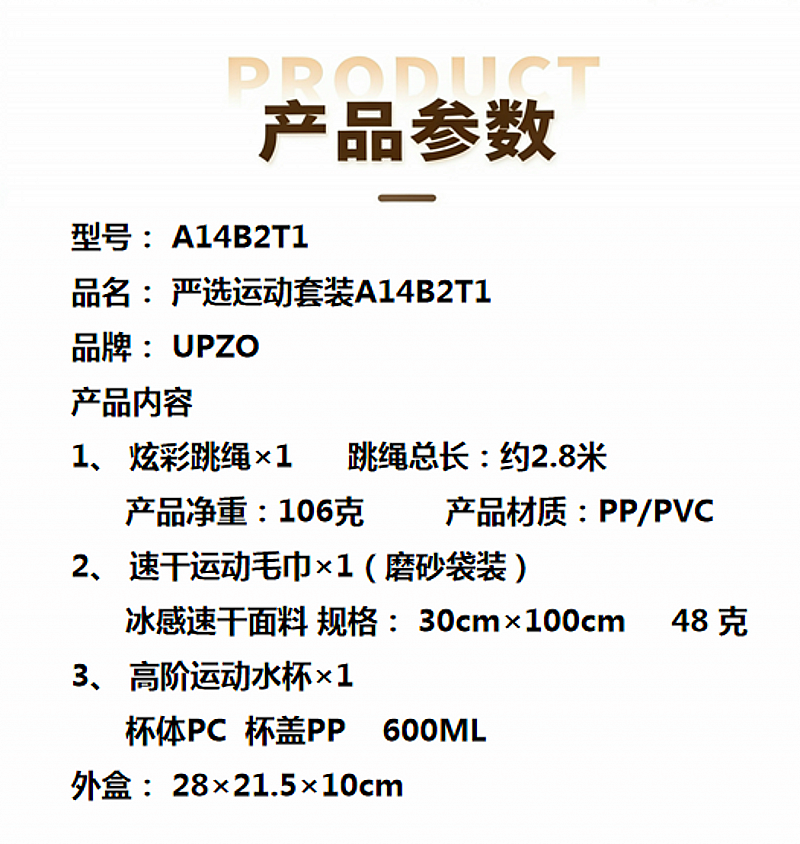 配置清单:炫彩运动杯*1、七彩运动巾*1、炫彩跳绳*1、礼盒*1
