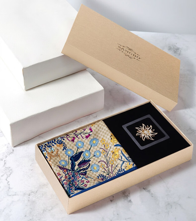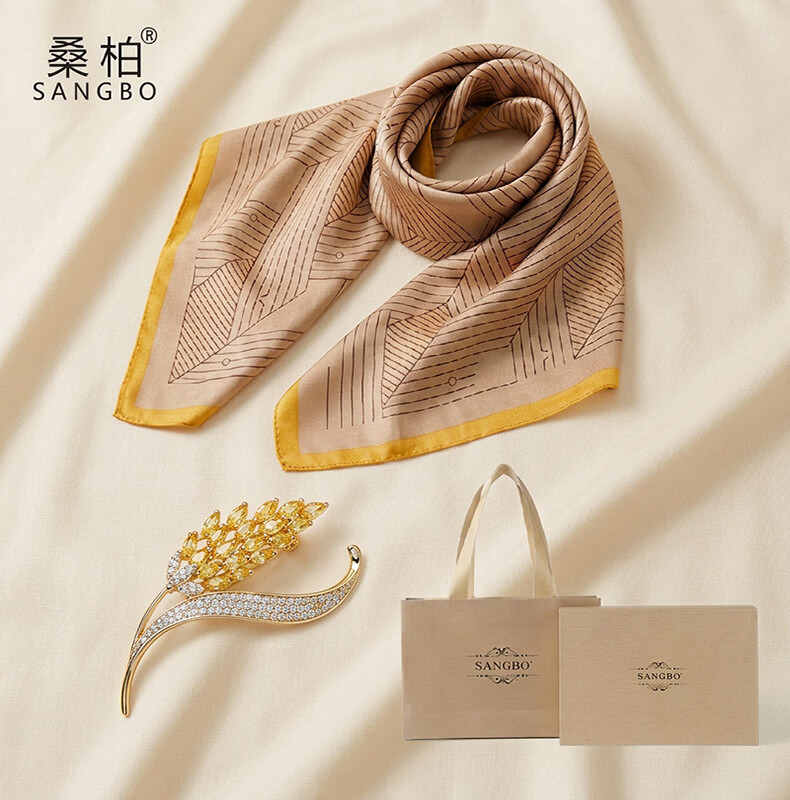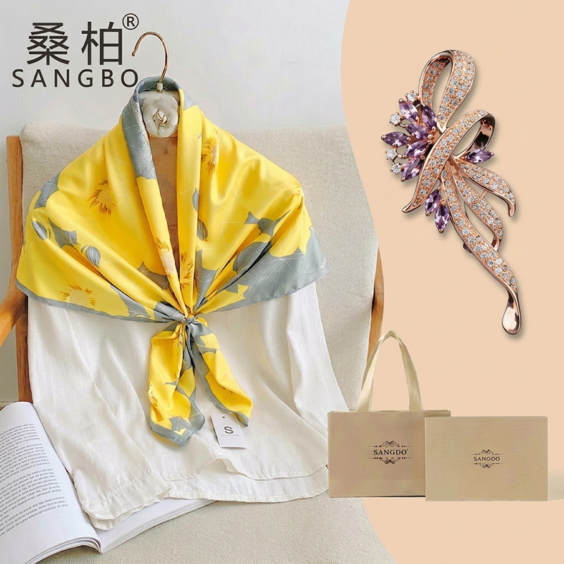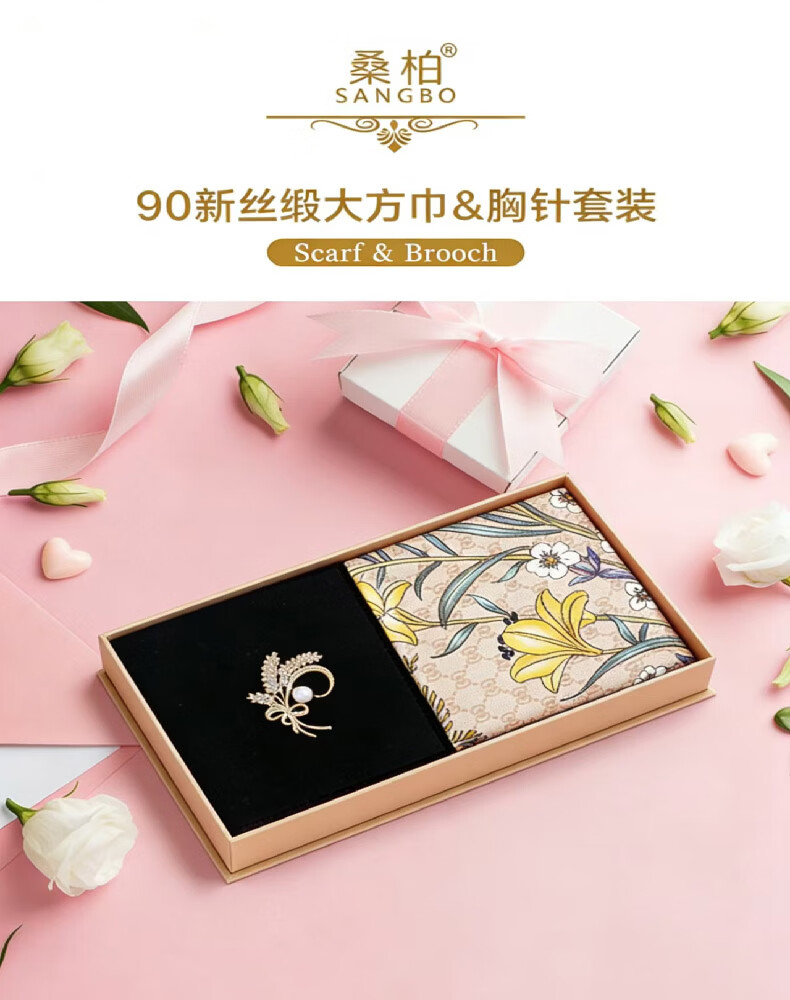 精美礼盒;丝巾花色百搭图案时尚;胸针款式百搭