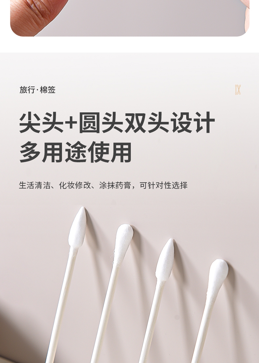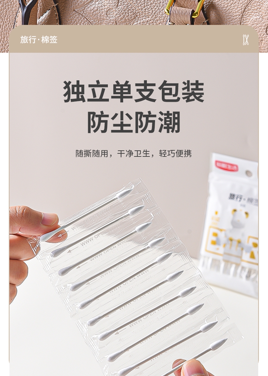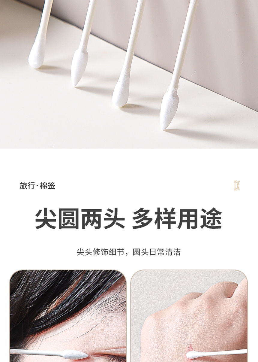便携式双头棉签 满足旅行所需;独立包装 触感柔软 小巧便捷;出差旅行常备 轻巧便捷