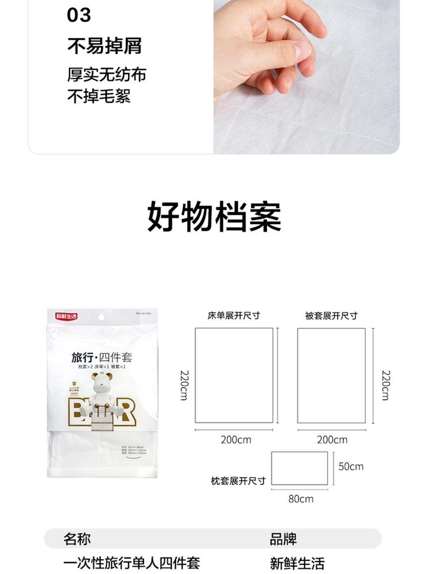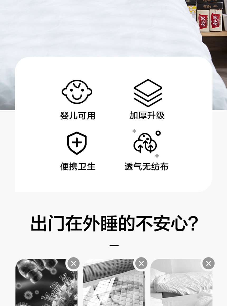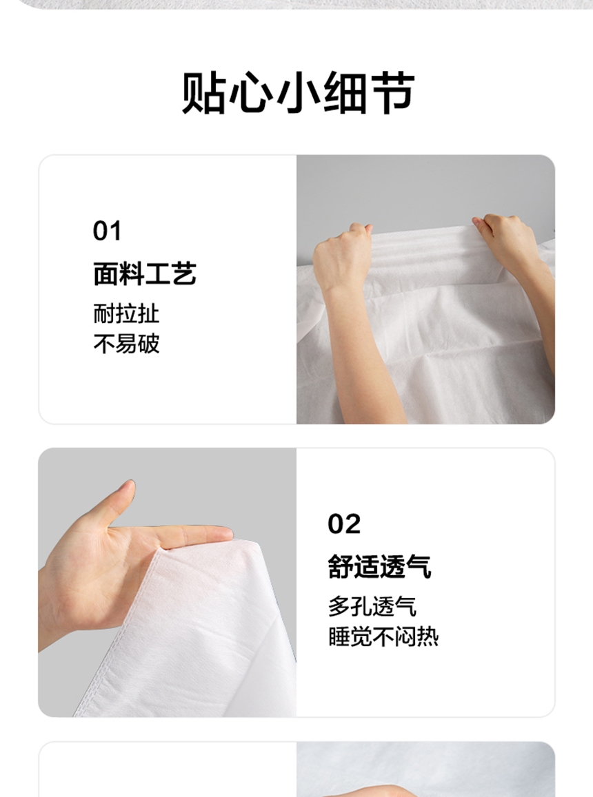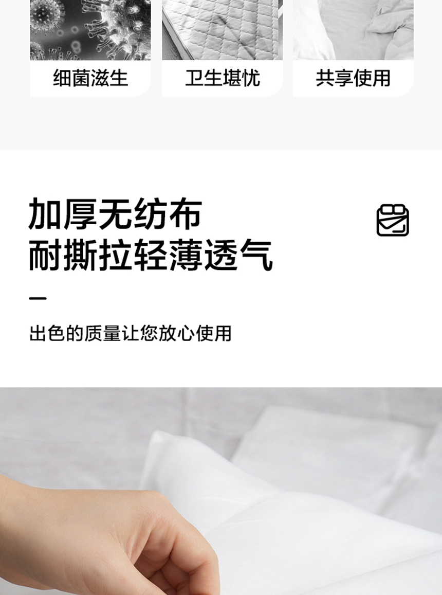 差旅陪伴 舒适好睡眠;加厚无纺布 耐撕拉轻薄透气;出色的质量让您放心使用