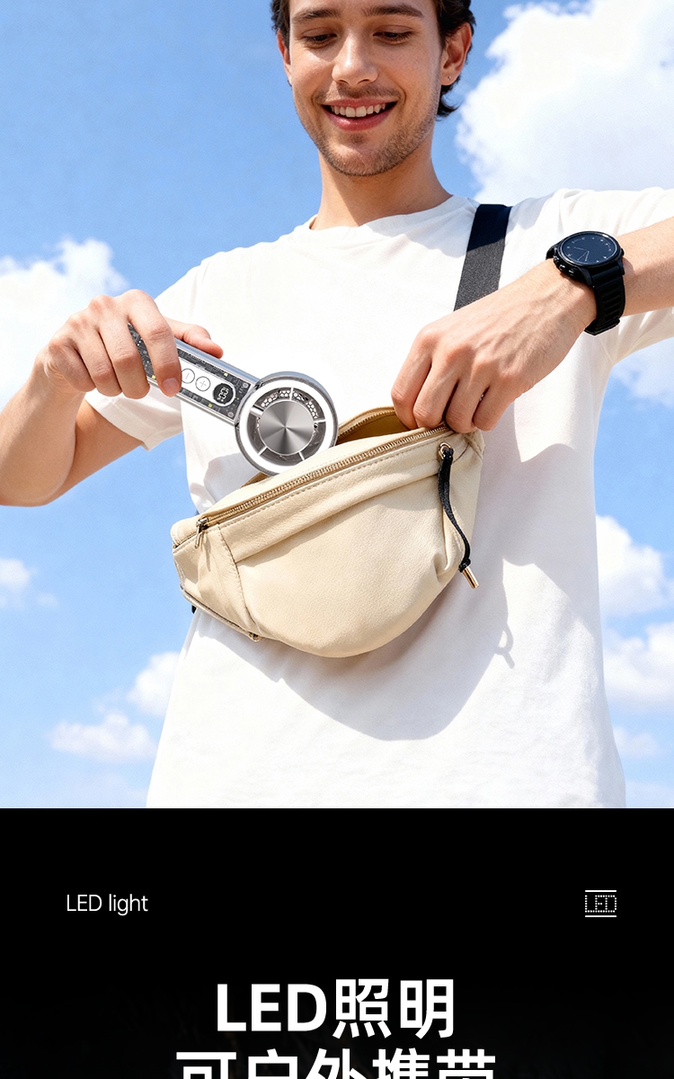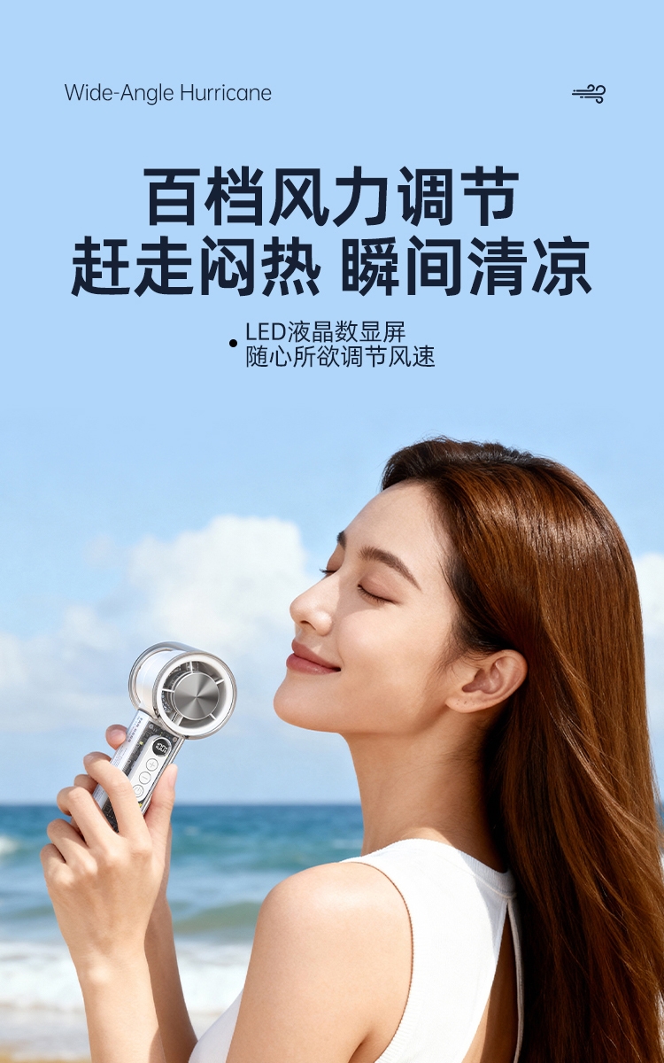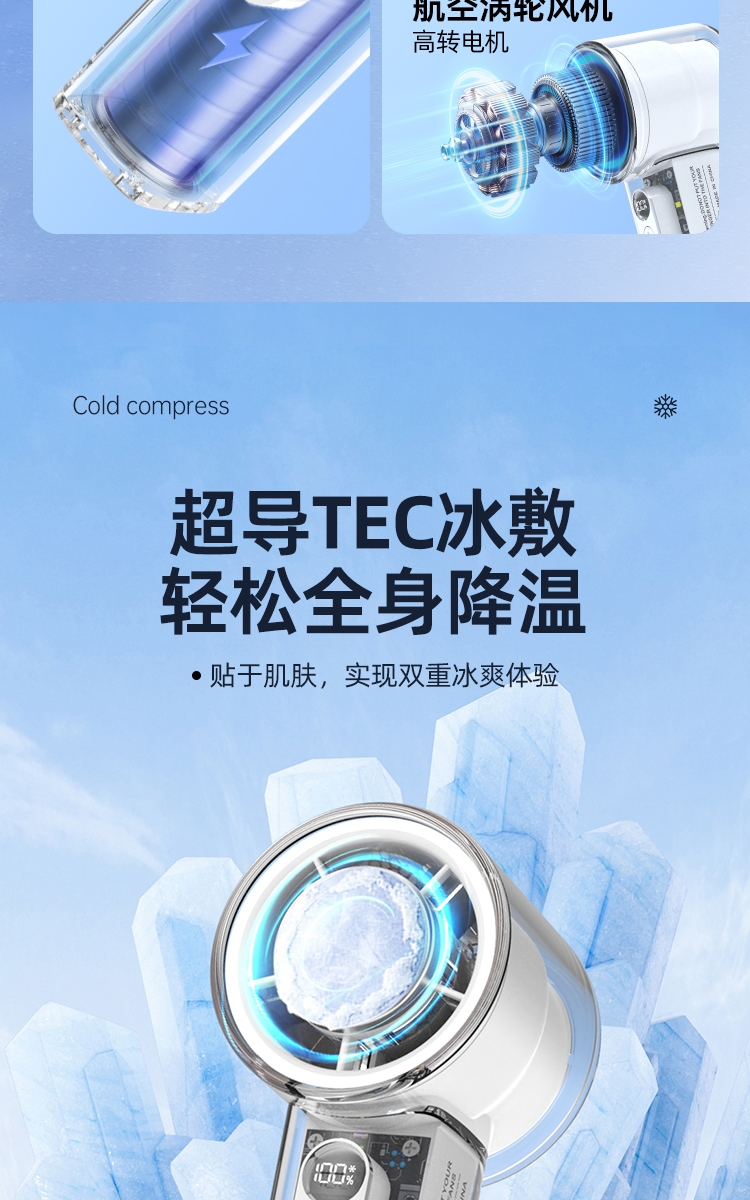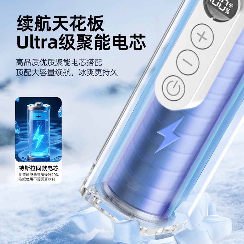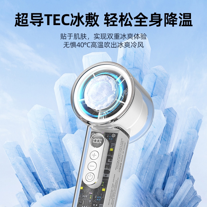 100 档无极调速:精准控风,从极柔风到暴风自由切;LED 智能数显:实时清晰展示电量百分比与风速档位;冰敷 + 吹风双效合一:专业制冷半导体,快速降温
