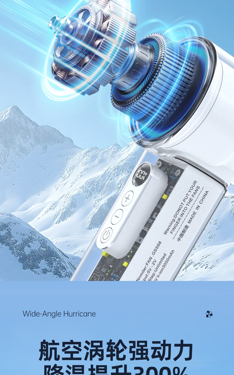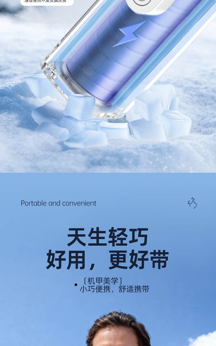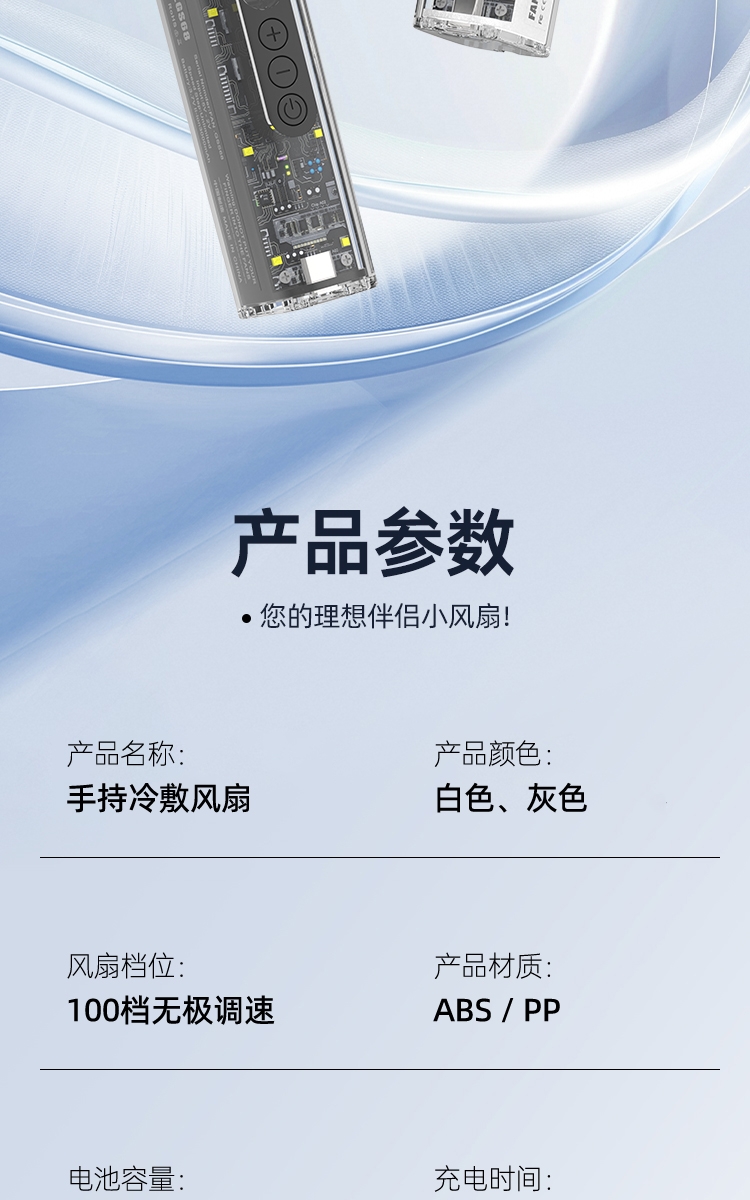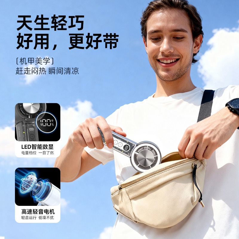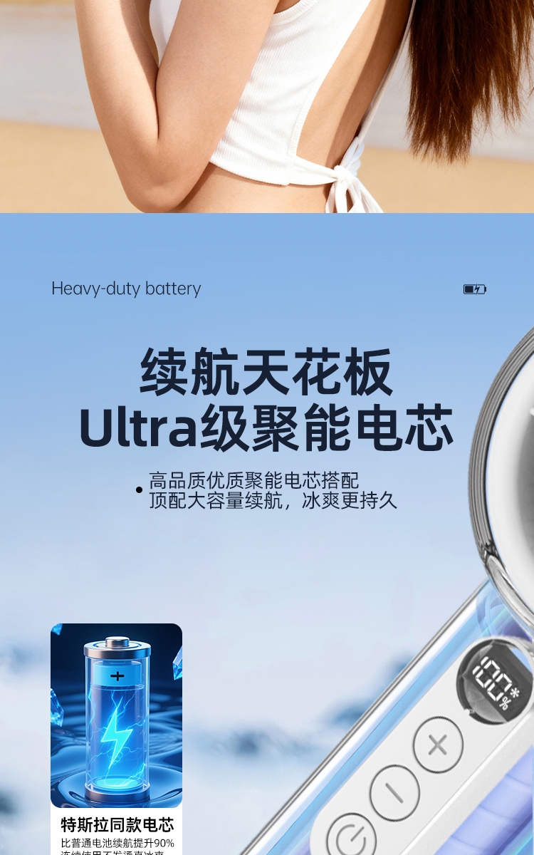 100 档无极调速:精准控风,从极柔风到暴风自由切;LED 智能数显:实时清晰展示电量百分比与风速档位;冰敷 + 吹风双效合一:专业制冷半导体,快速降温