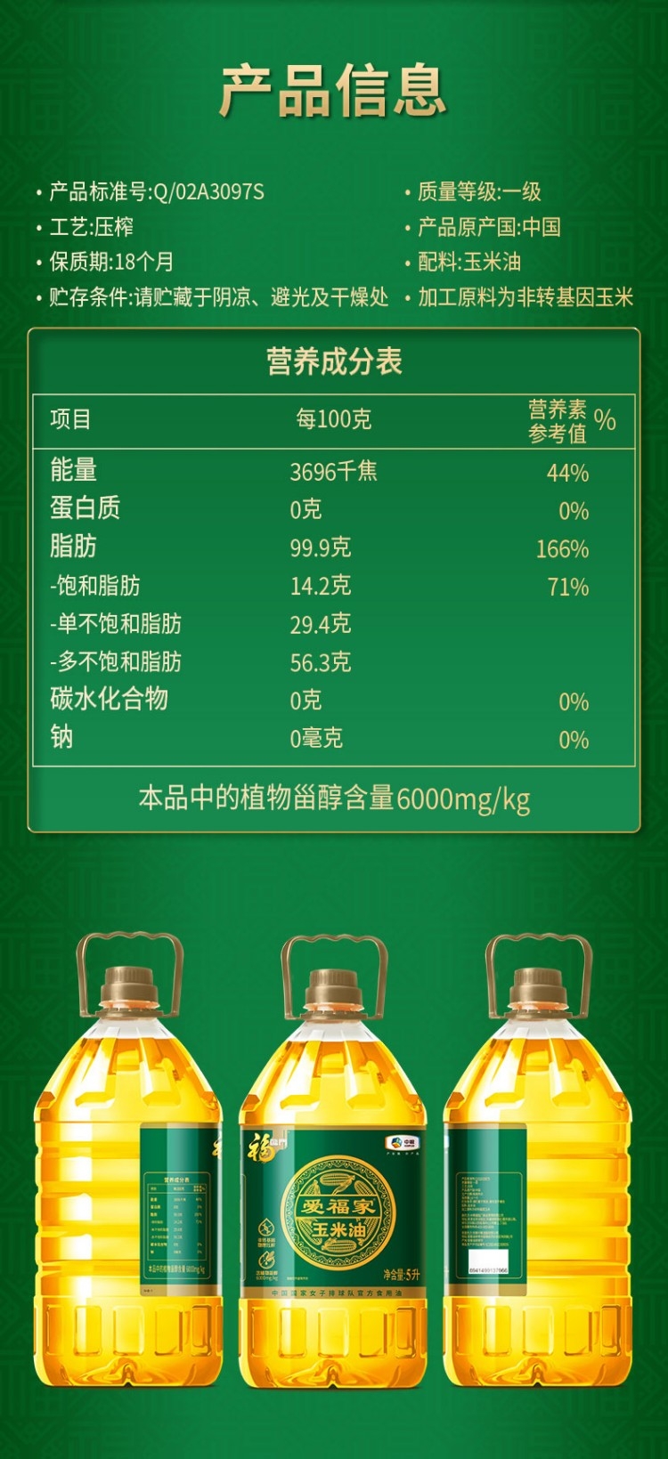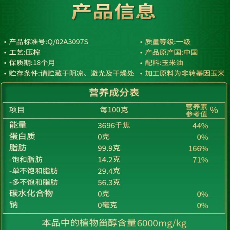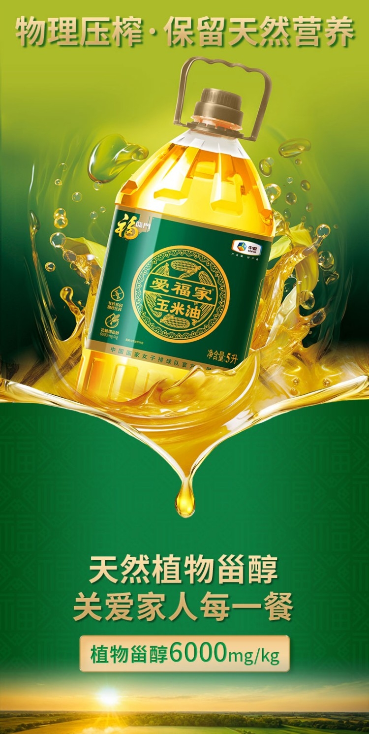 精选非转基因玉米,富含维生素E与植物甾醇;烟点高油烟少,煎炒烹炸皆宜守护家人健康;5升大容量家庭装,清淡爽口不油腻更耐用