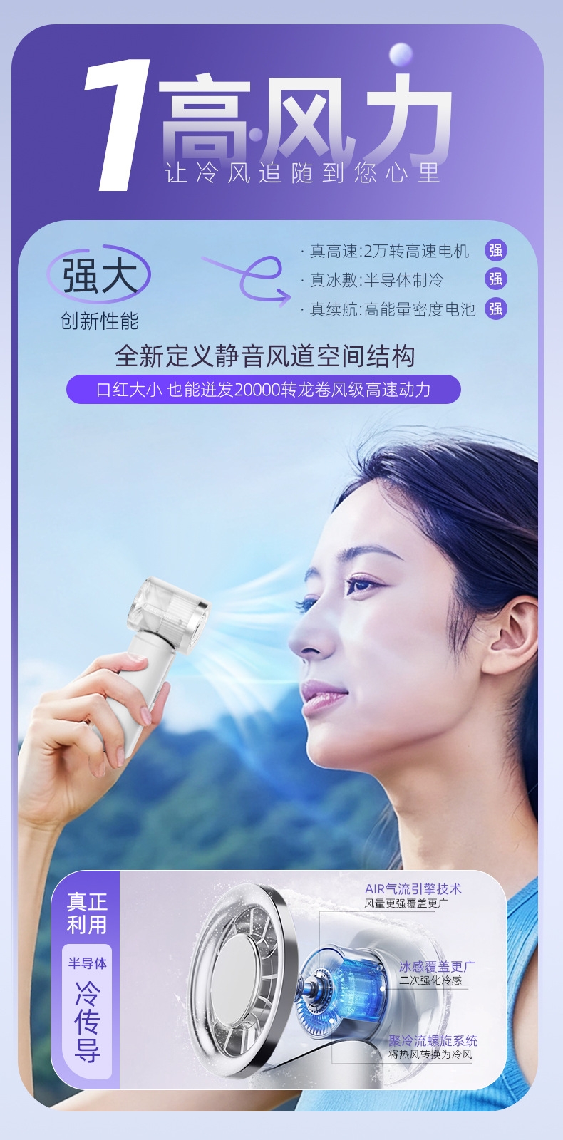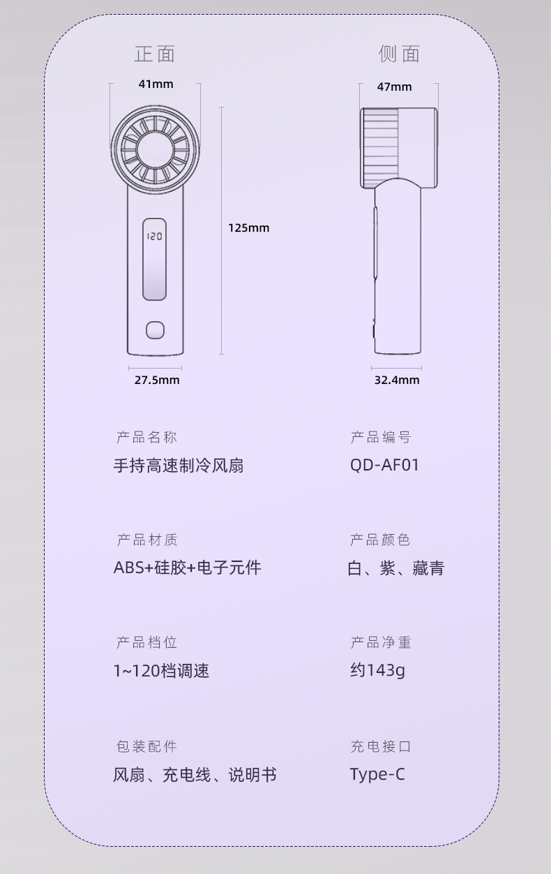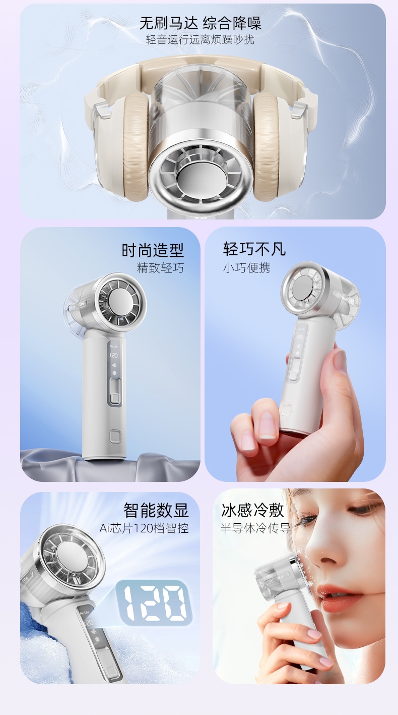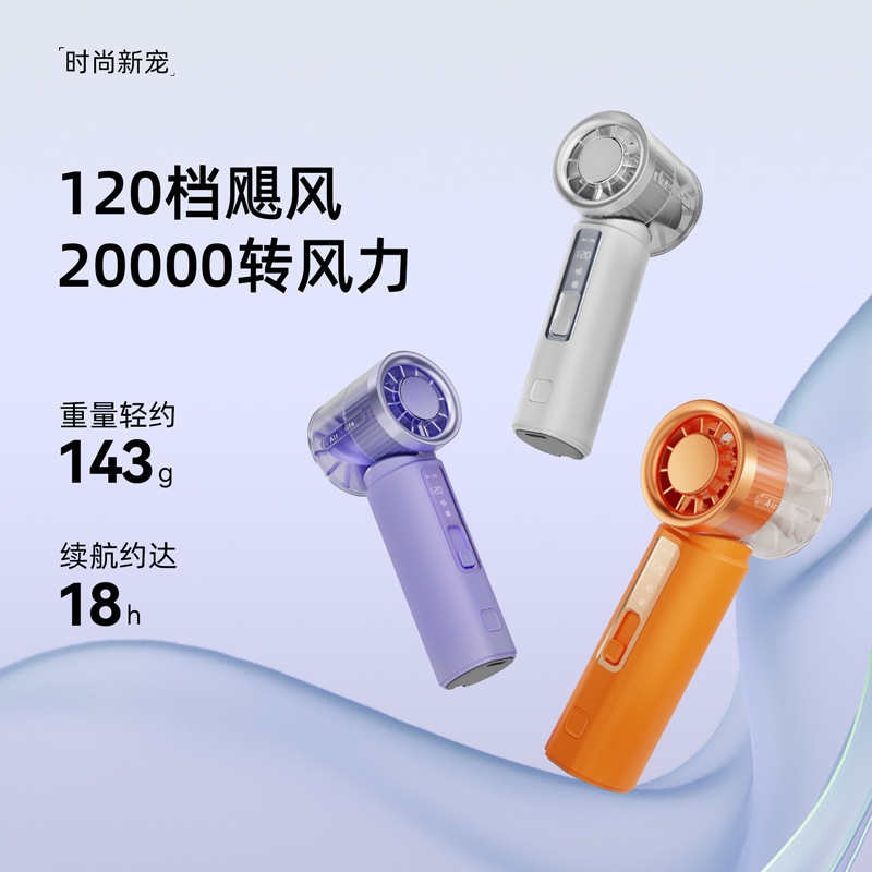 120 档飓风 + 20000 转高转速,快速散热;轻量便携:仅 143g 机身,比手机还轻;智能数显:配备可视化电量 / 档位显示屏