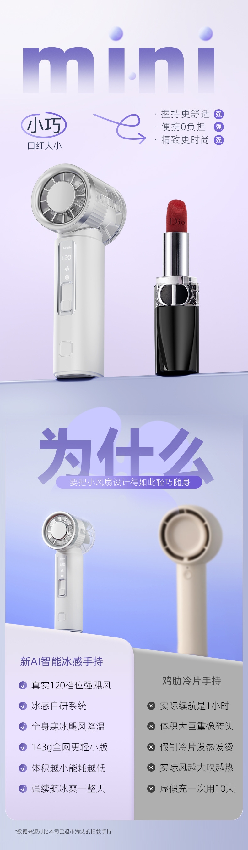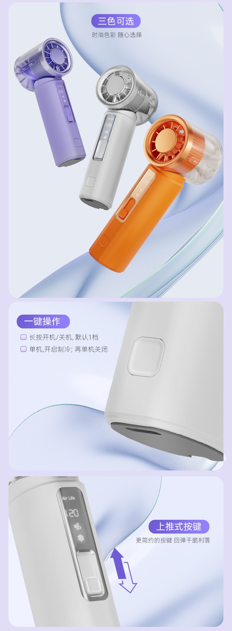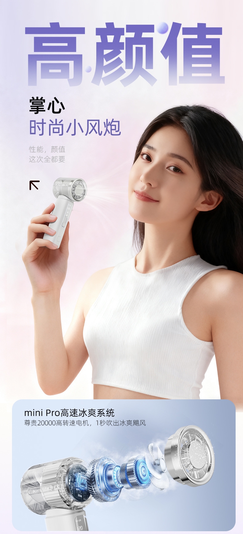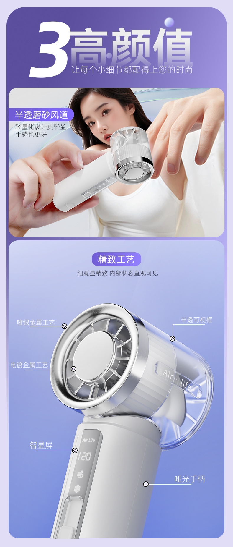 120 档飓风 + 20000 转高转速,快速散热;轻量便携:仅 143g 机身,比手机还轻;智能数显:配备可视化电量 / 档位显示屏