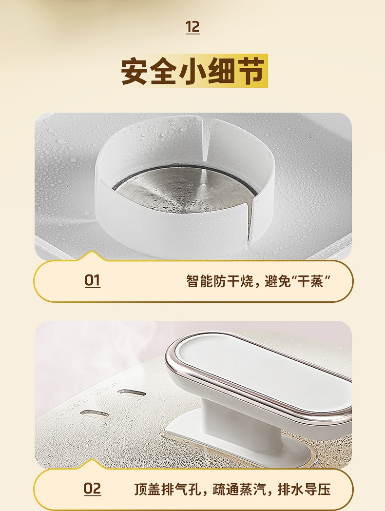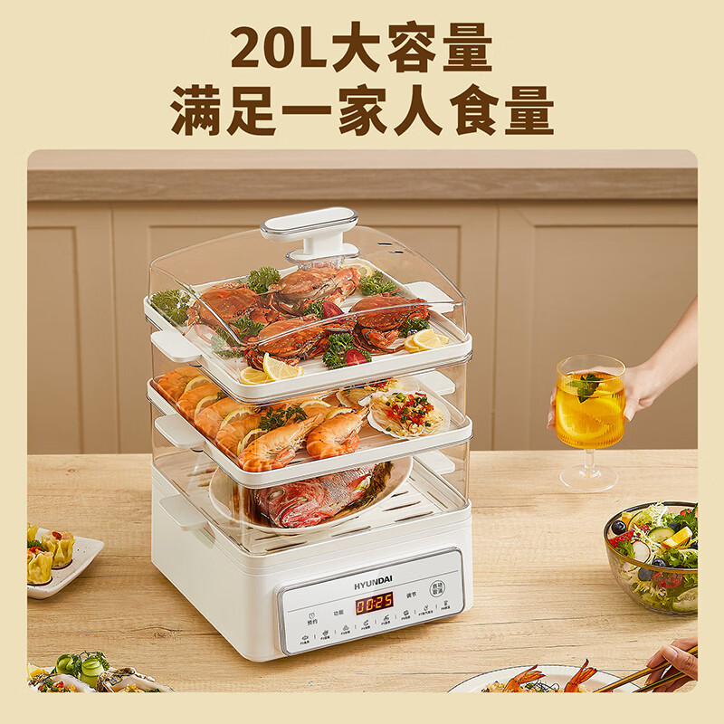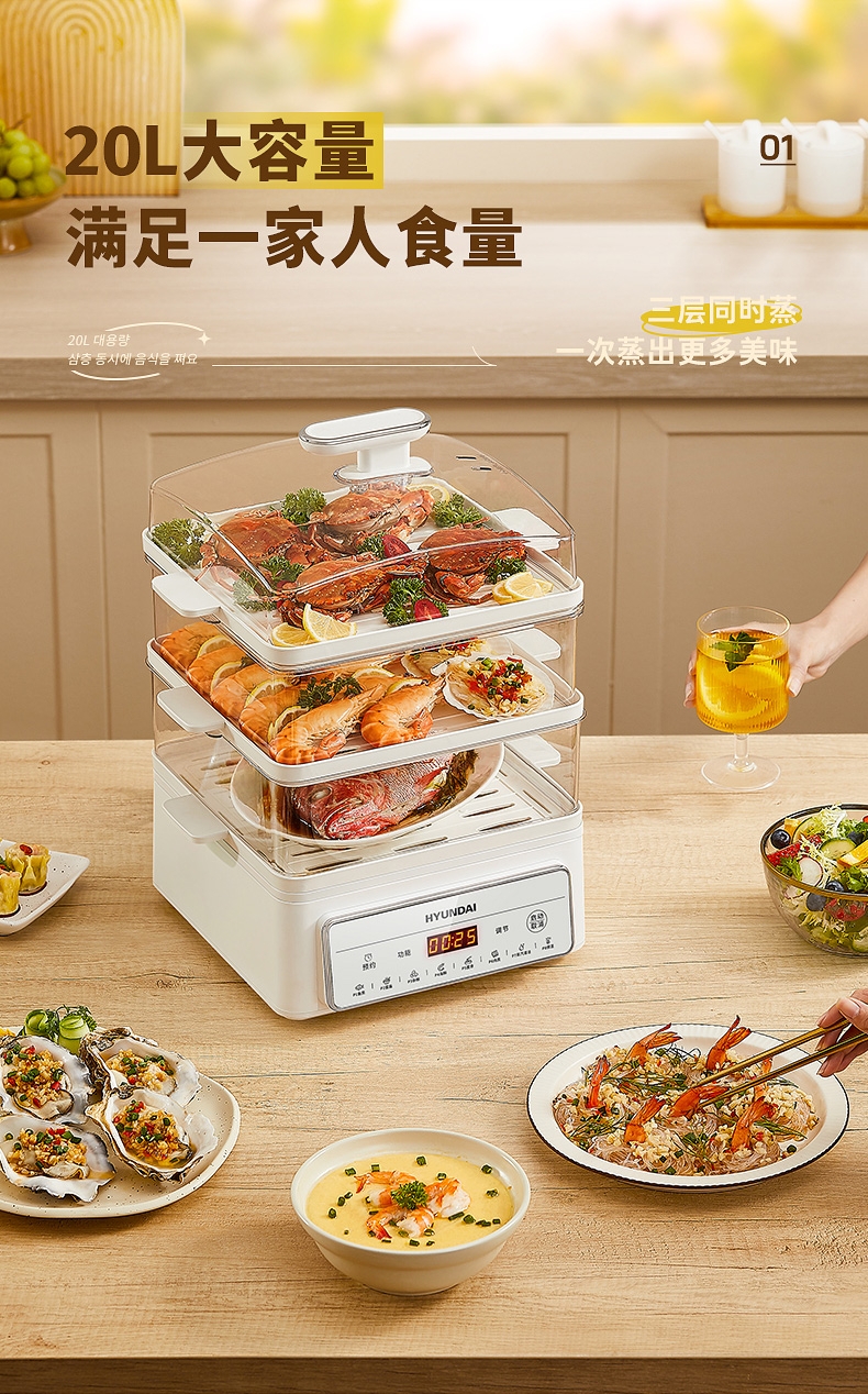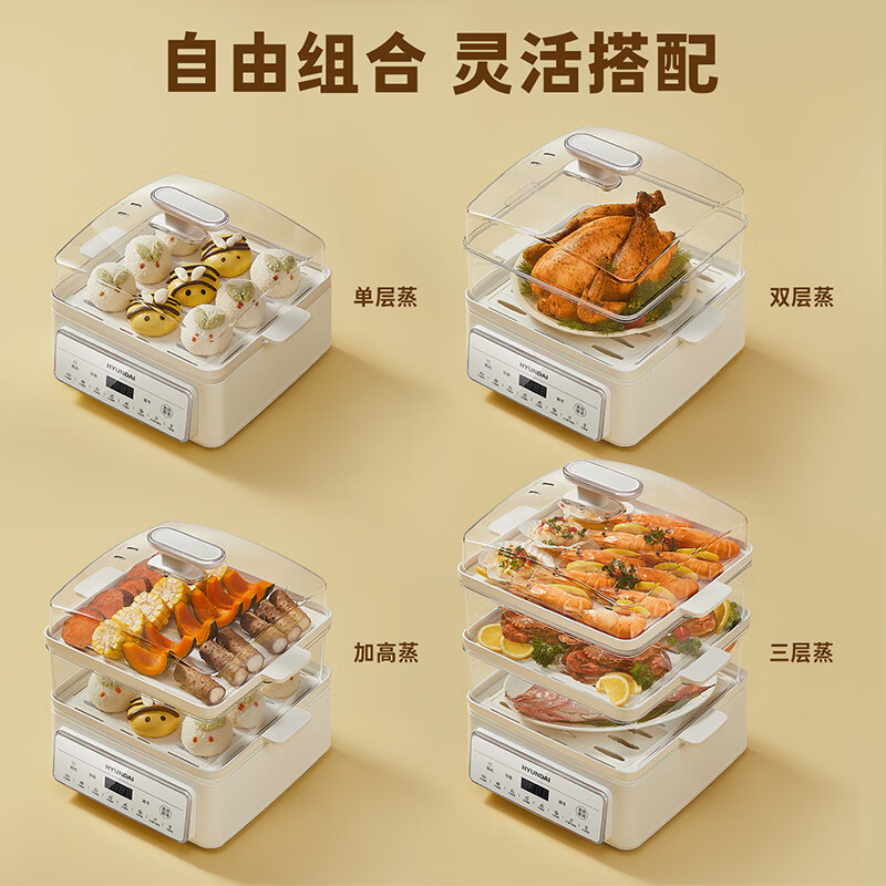 三层自由组合蒸笼,20L大容量,三层蒸格;带保温功能,8小时保温;智能干烧保护功能,安全省心
