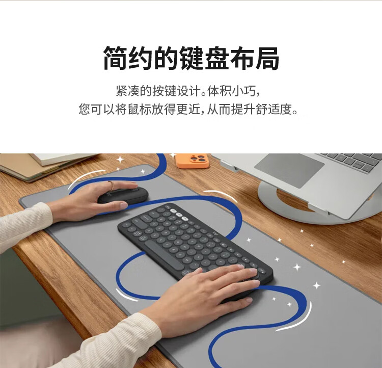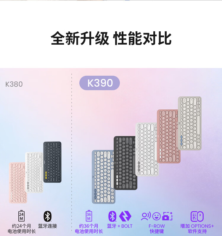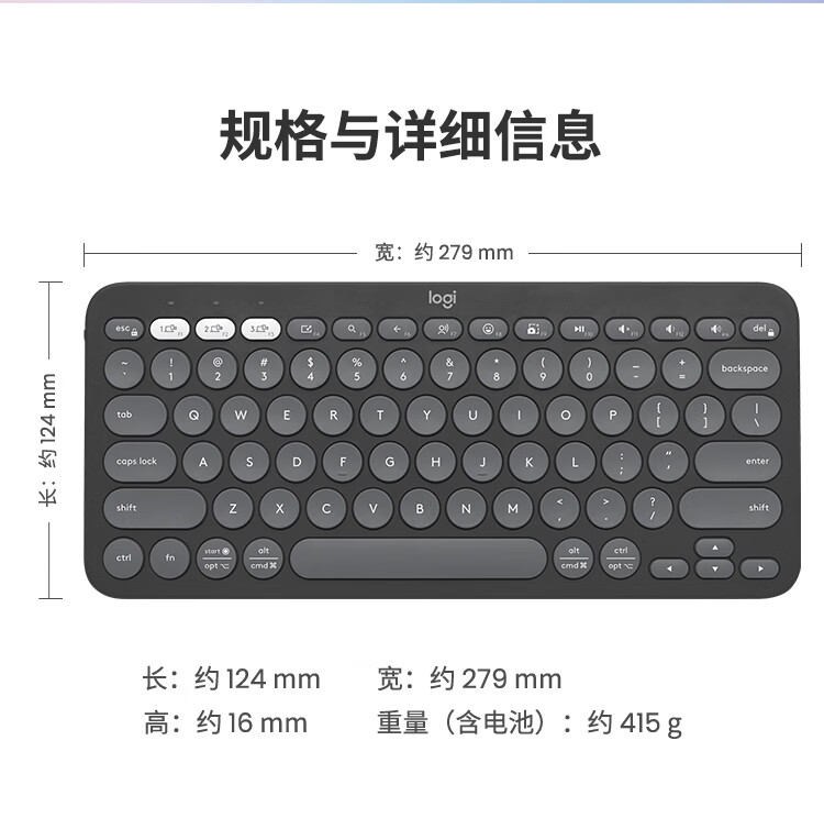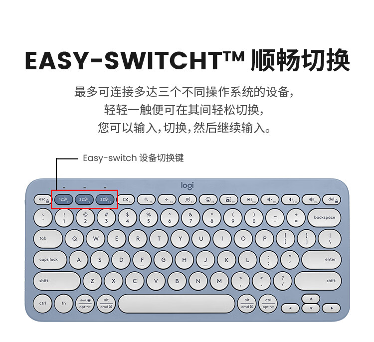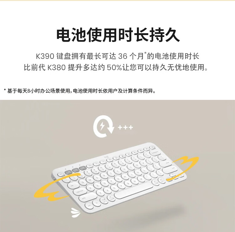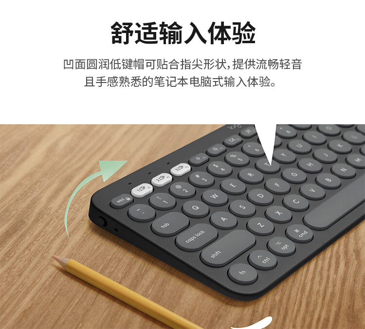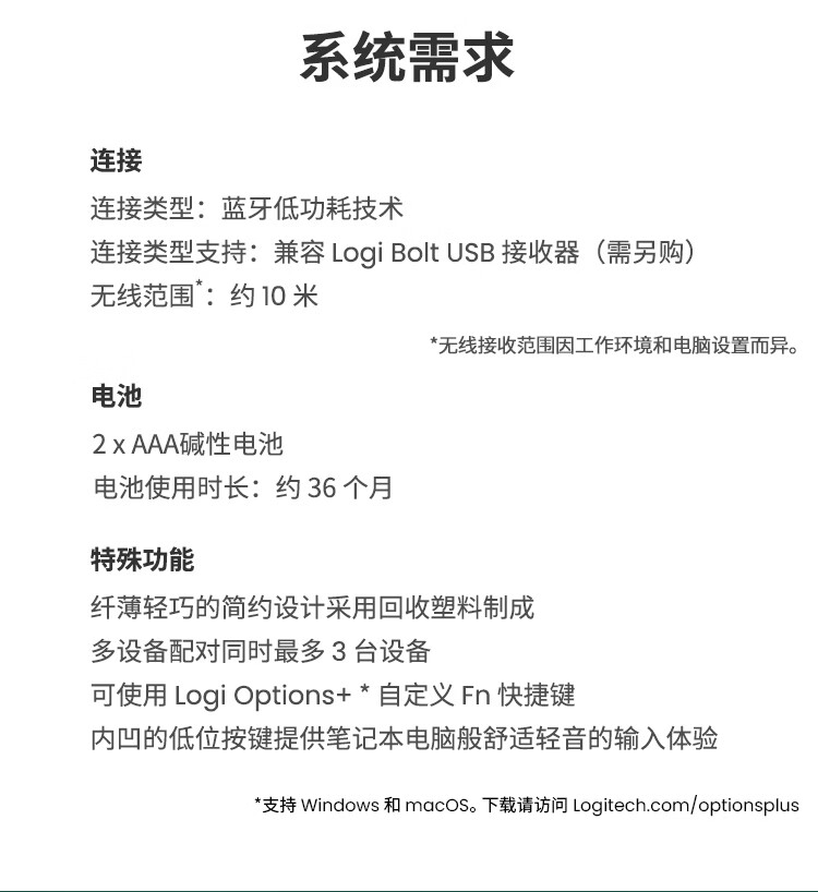 轻薄环保:极简纤薄设计,含回收塑料材质;多屏切换:Easy-Switch 一键切换三台设备;静音输入:敲击安静舒适,专注高效;超长续航:电池寿命长达36个月;logi options+支持:为特定应用程序或操