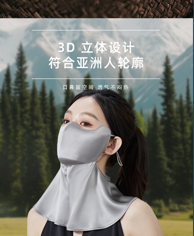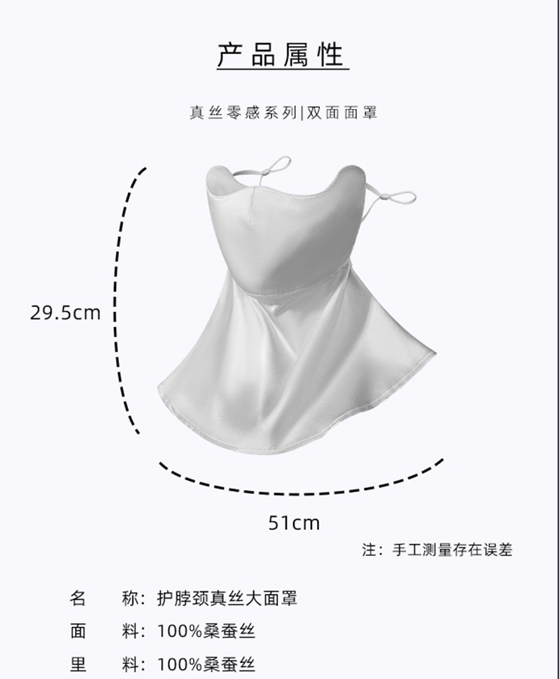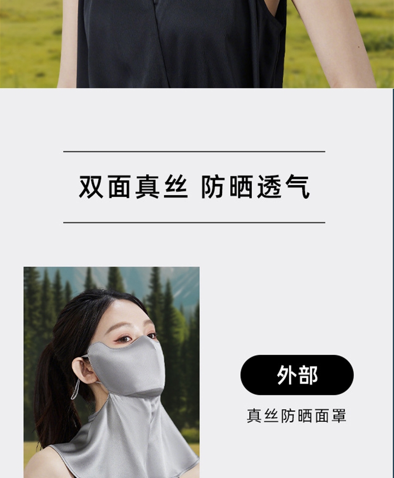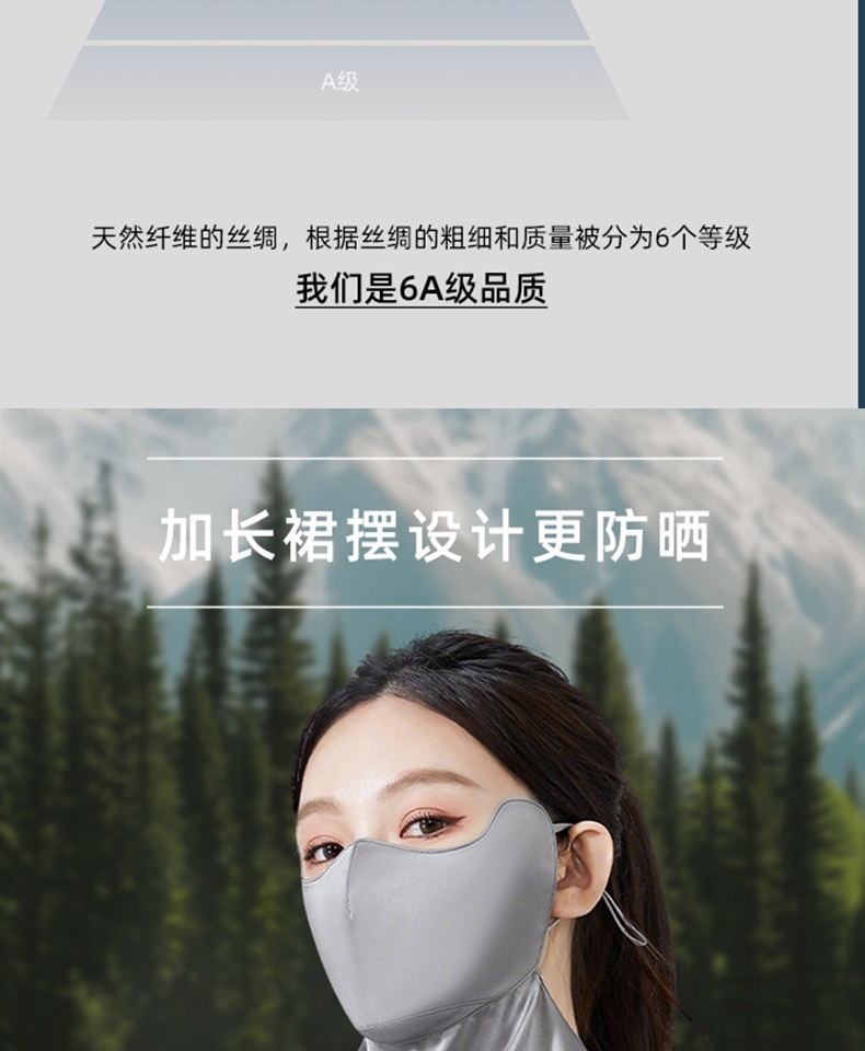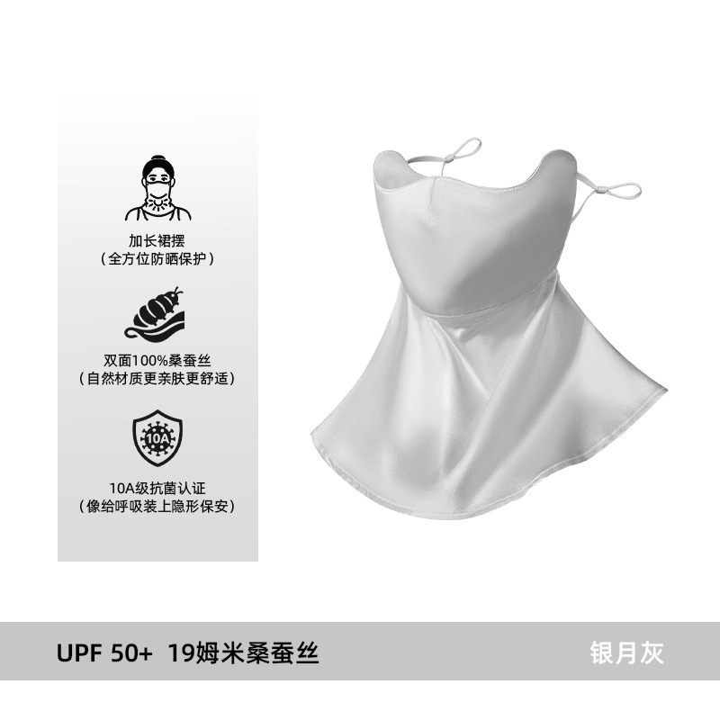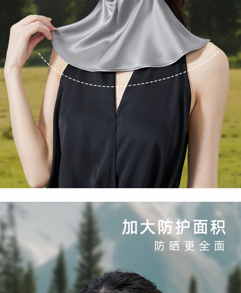 19姆米高奢真丝面料,呵护娇嫩面部;6A抗菌,99%防紫外线;加长裙摆设计,防晒护脖颈防晒保湿