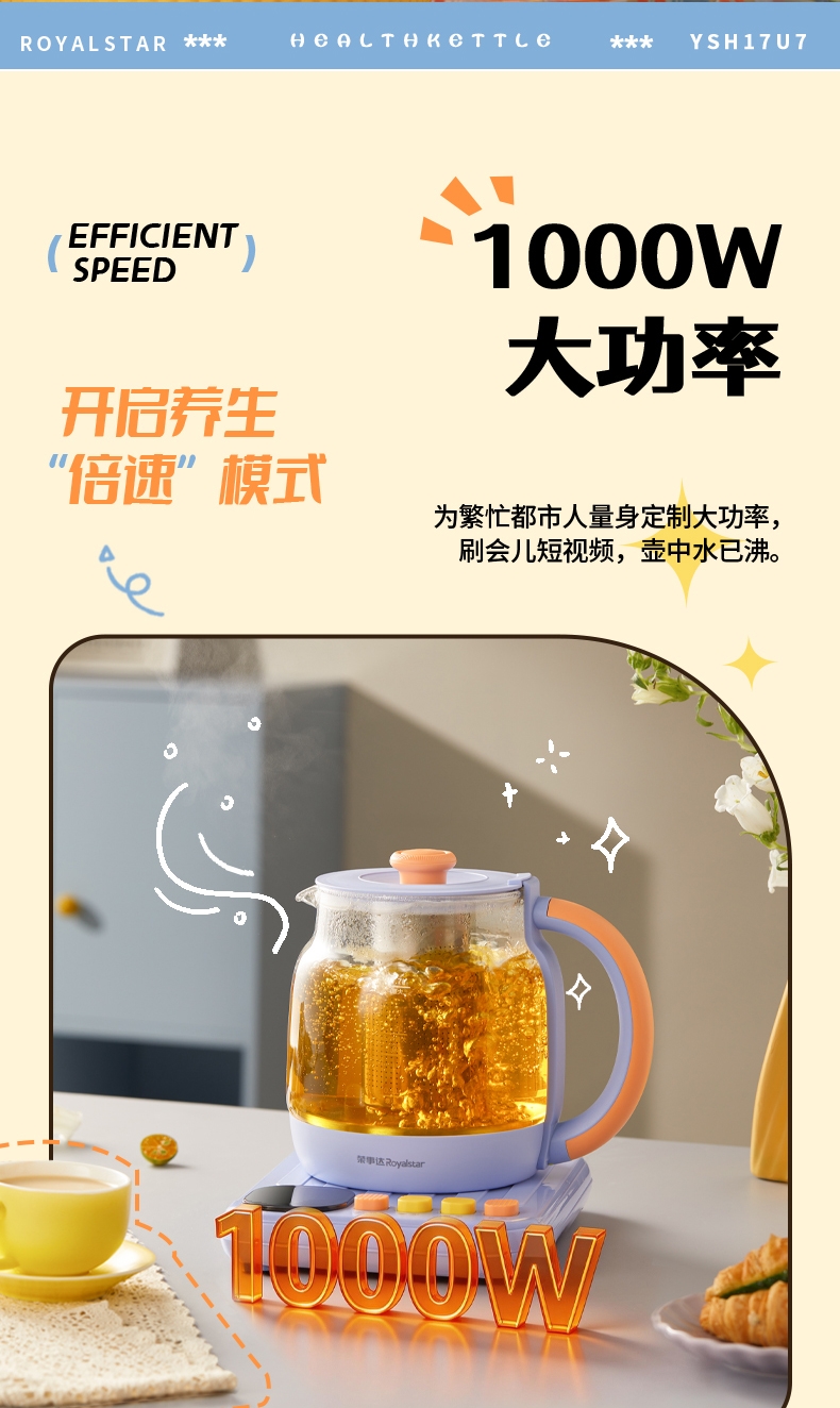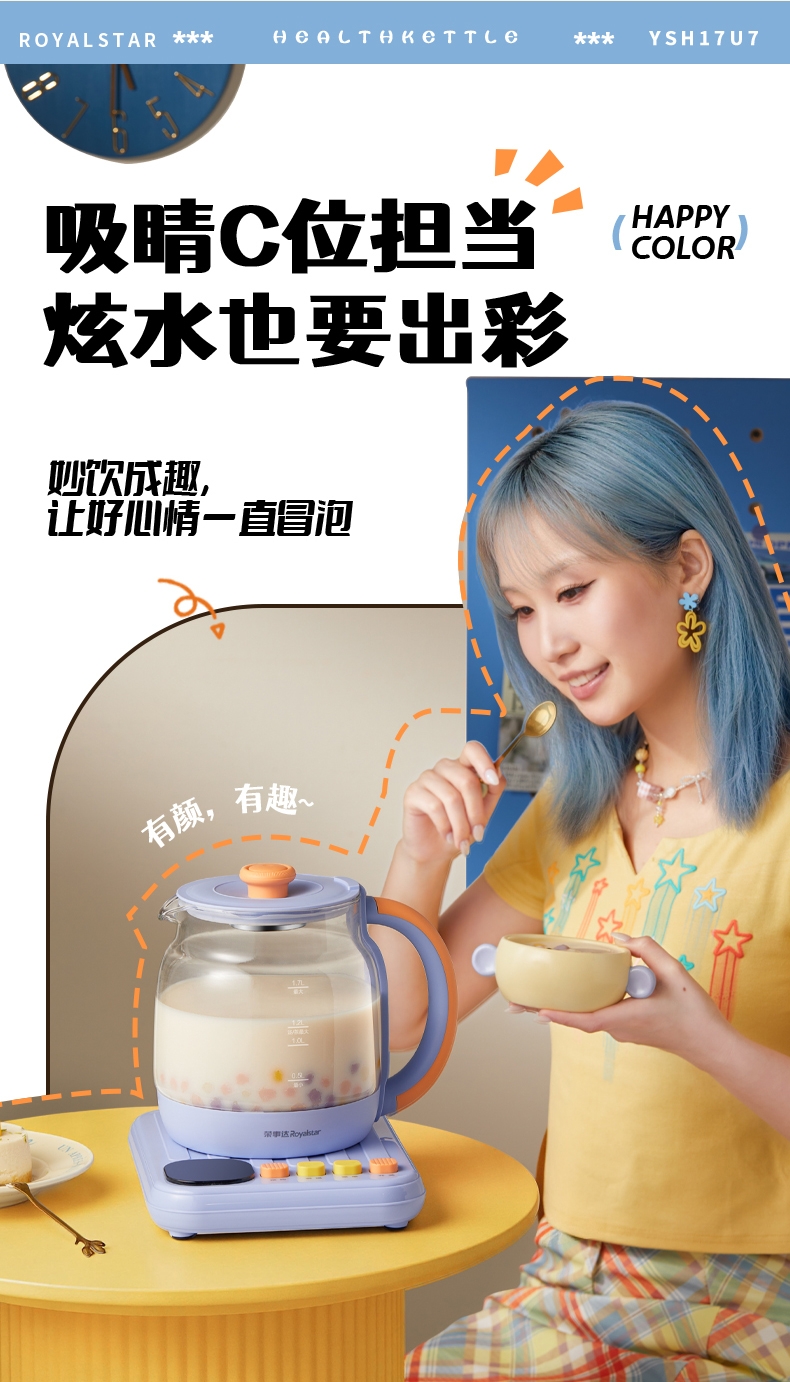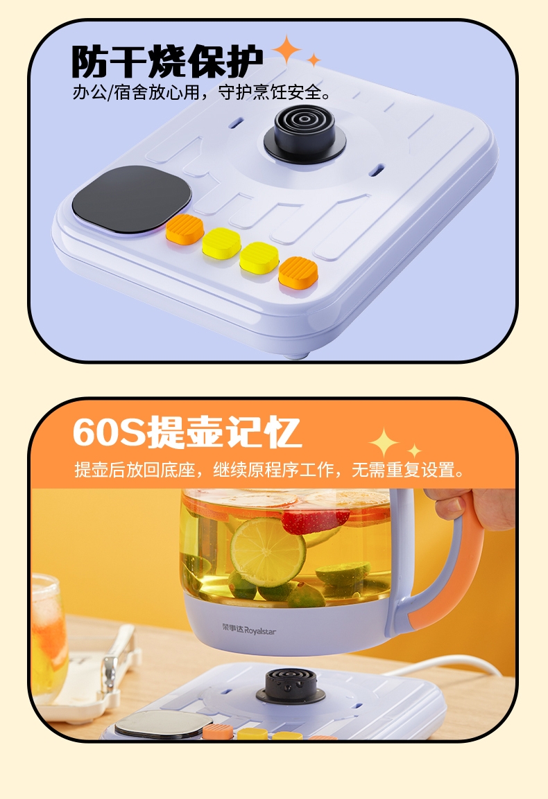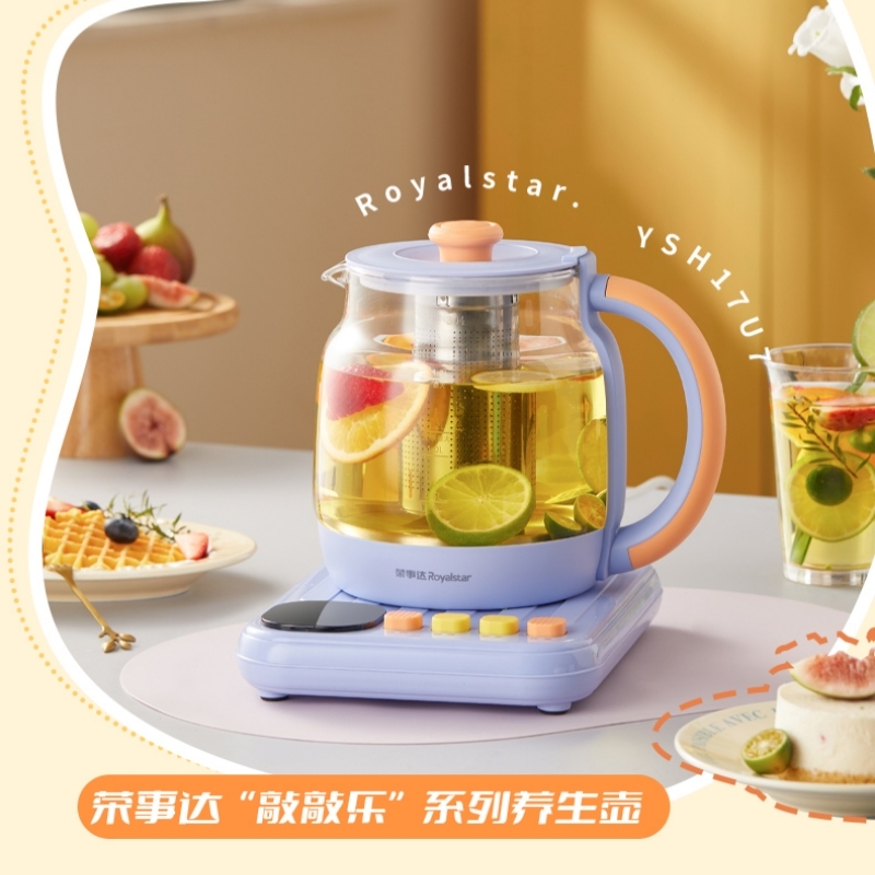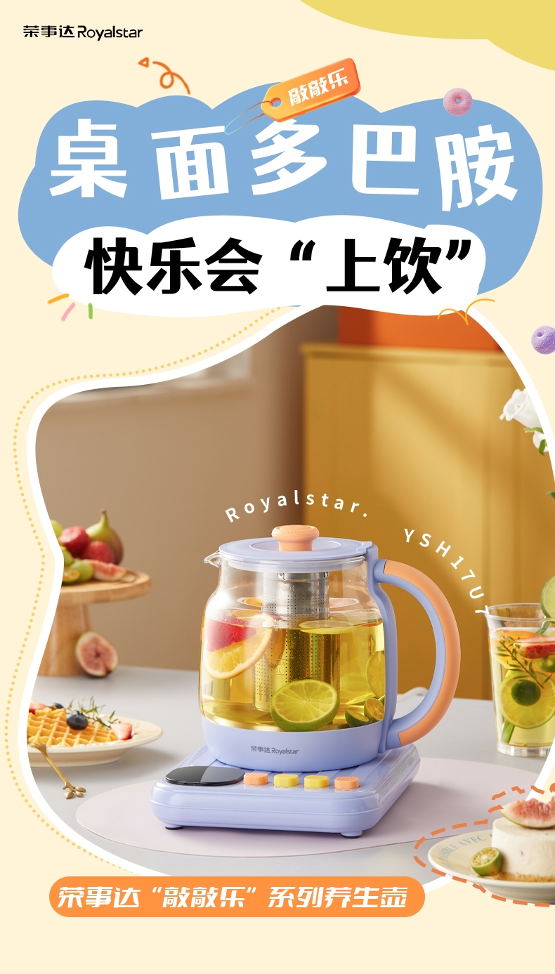 荣事达“敲敲乐”系列养生壶,注入多巴胺元素;提升产品视觉吸引力,更能激发积极情绪,创造情感连接;隐藏式高端屏幕通电显示功能,按键操控,简单方便;1.7L大容量+1000W大功率,效率高;符合现在年轻人审美调性、增加情绪价值,带来好心情