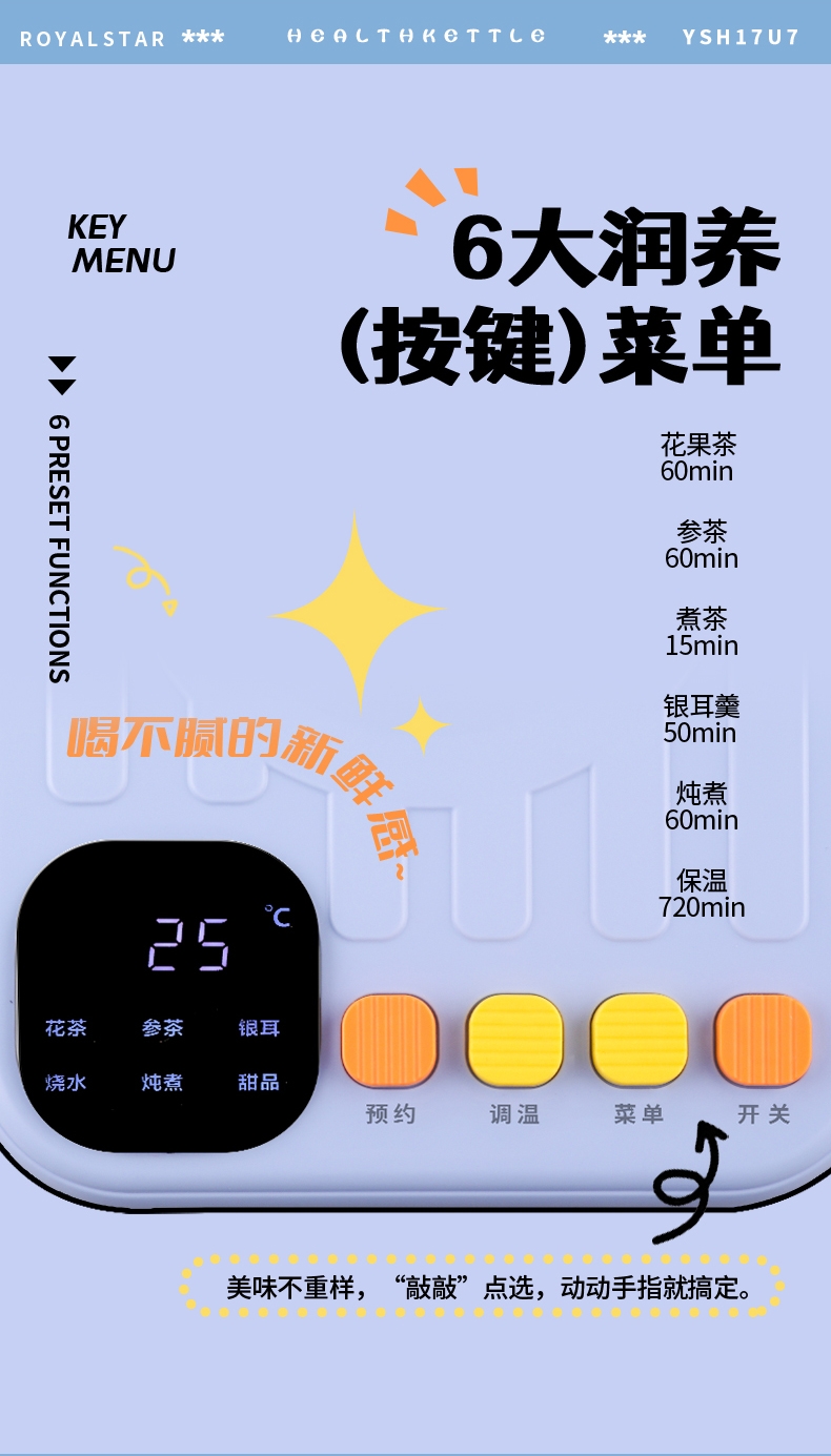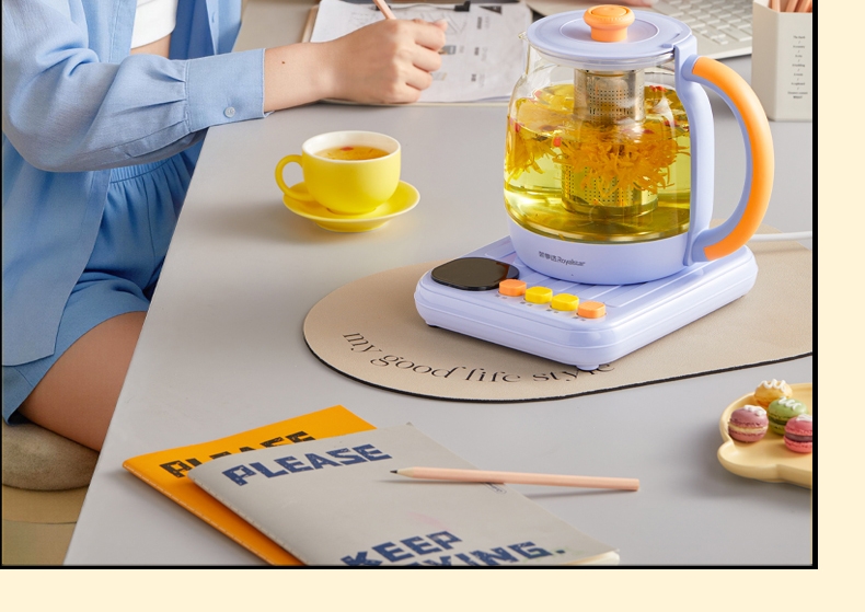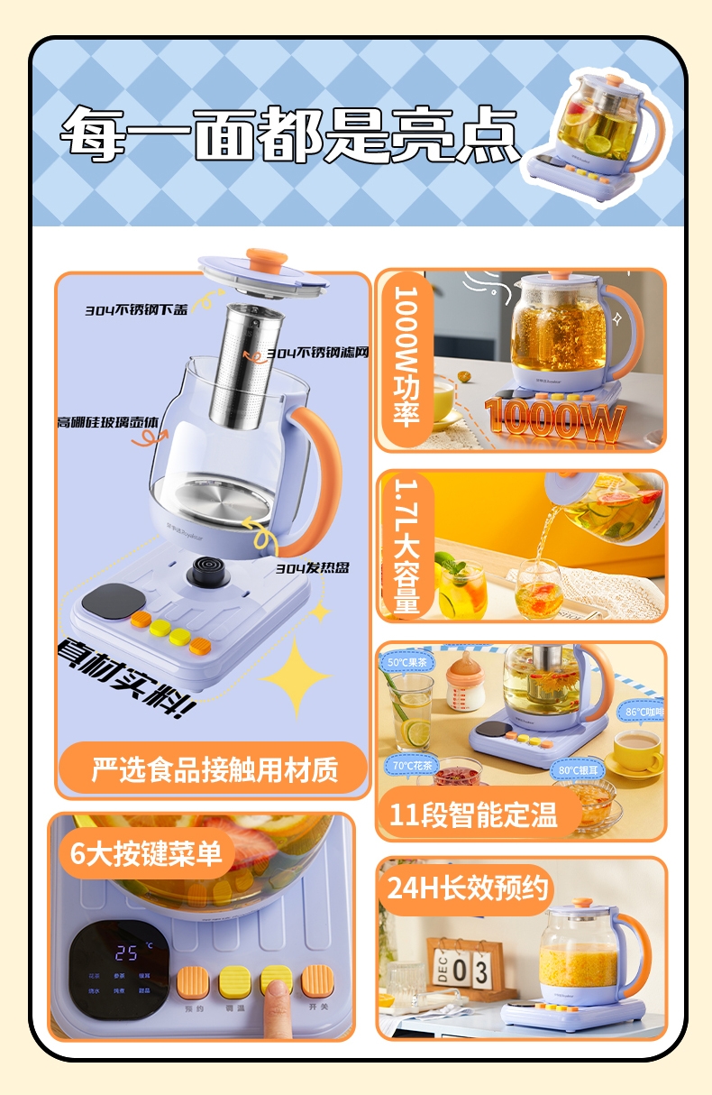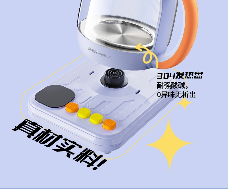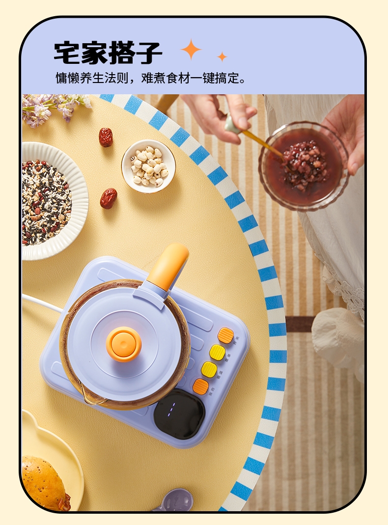 荣事达“敲敲乐”系列养生壶,注入多巴胺元素;提升产品视觉吸引力,更能激发积极情绪,创造情感连接;隐藏式高端屏幕通电显示功能,按键操控,简单方便;1.7L大容量+1000W大功率,效率高;符合现在年轻人审美调性、增加情绪价值,带来好心情