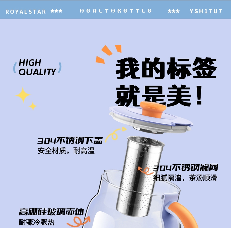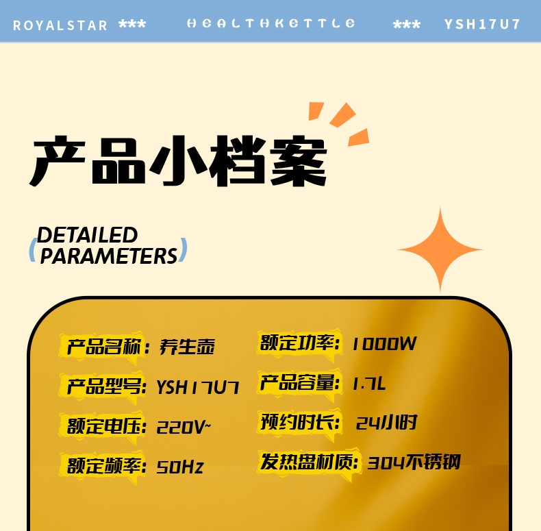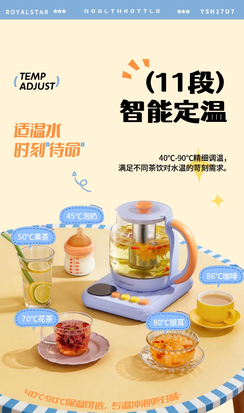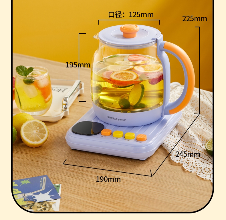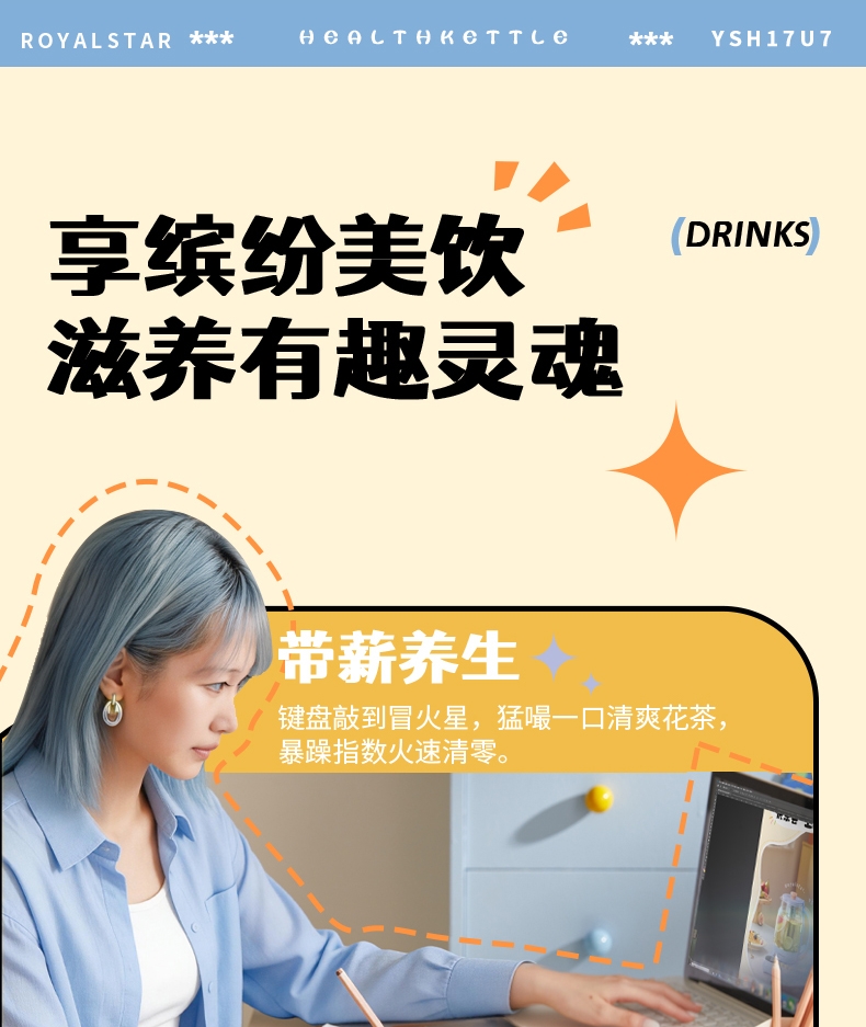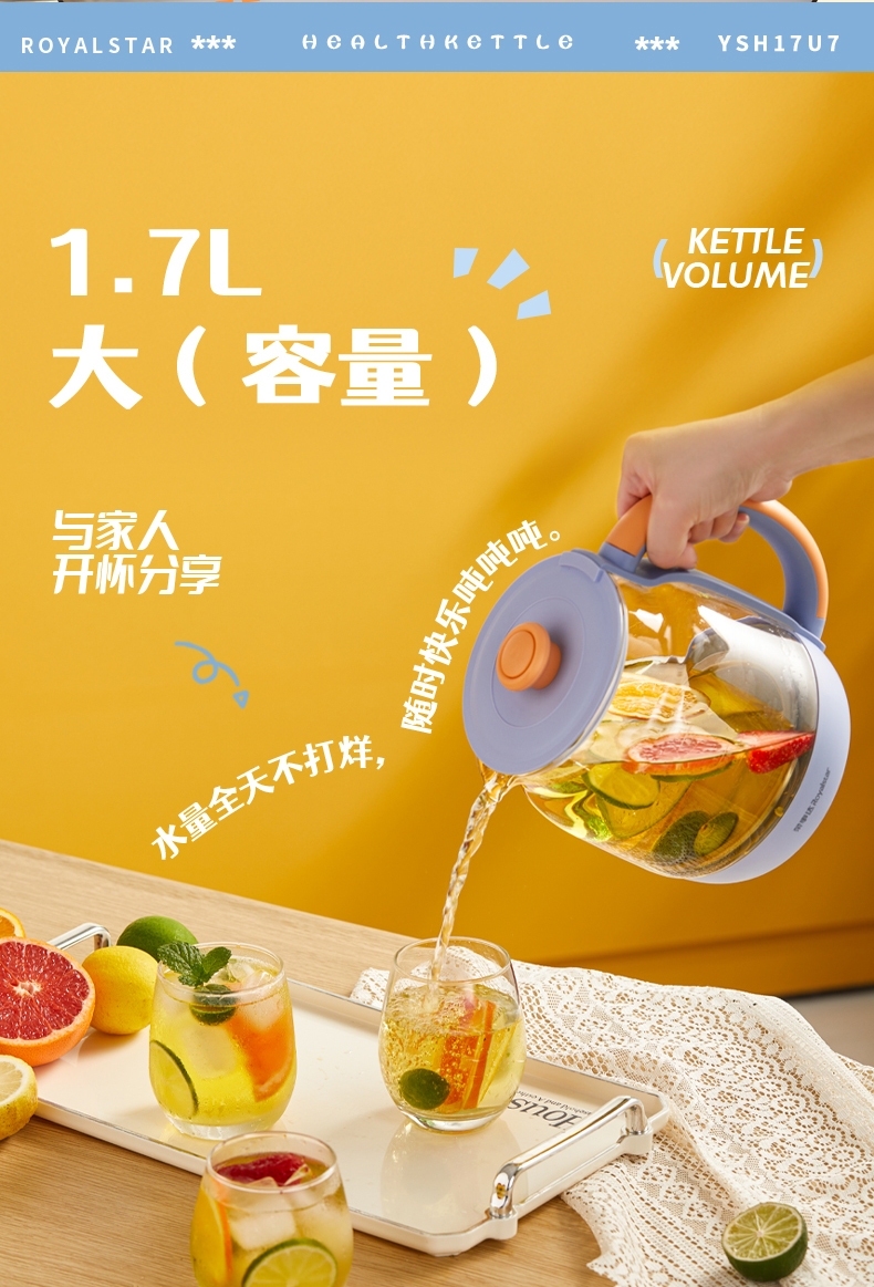 荣事达“敲敲乐”系列养生壶,注入多巴胺元素;提升产品视觉吸引力,更能激发积极情绪,创造情感连接;隐藏式高端屏幕通电显示功能,按键操控,简单方便;1.7L大容量+1000W大功率,效率高;符合现在年轻人审美调性、增加情绪价值,带来好心情