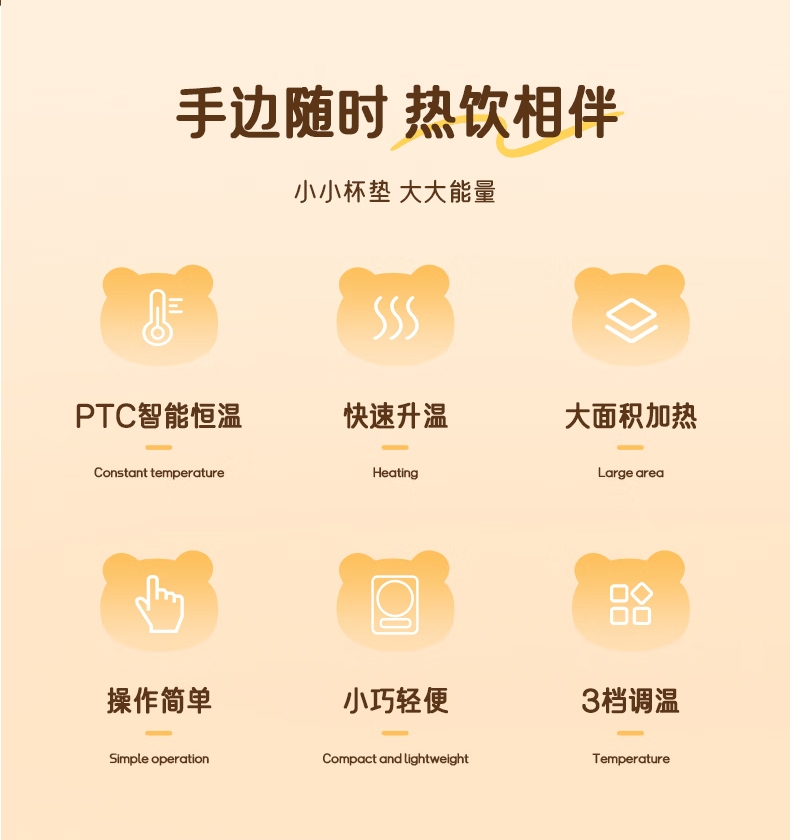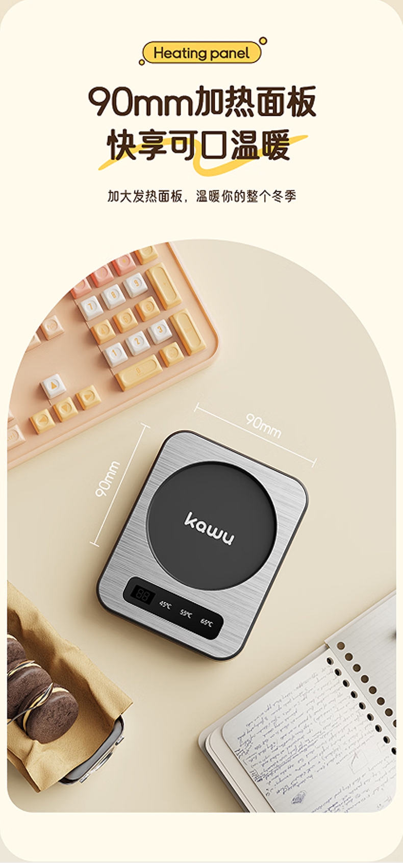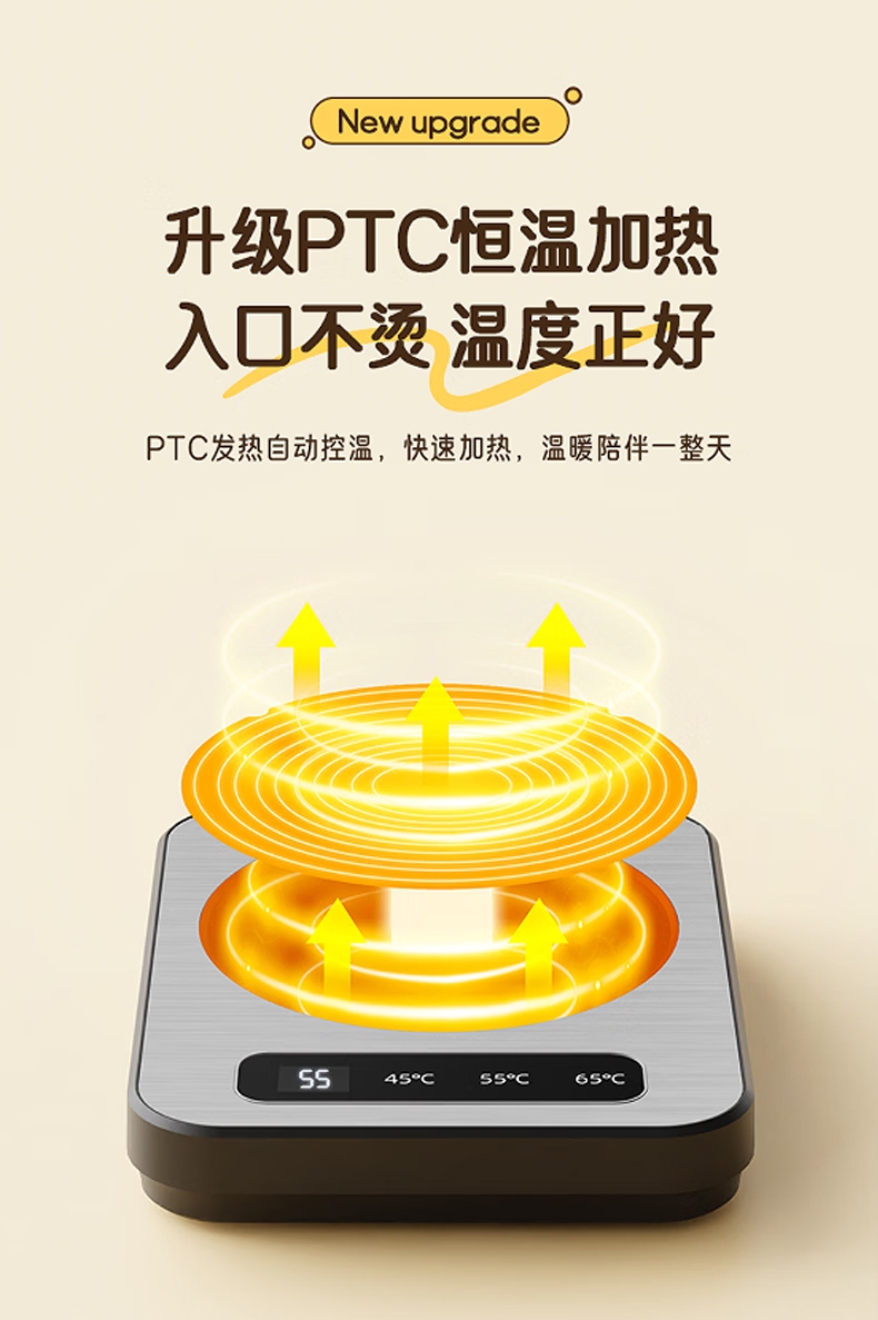 PTC发热自动控温,90mm加大发热面板;3档恒温随心选,小巧轻便不占地;小功率不跳闸,宿舍/办公室/公寓安心用;智能数显屏幕,防滑脚垫,圆润边缘设计