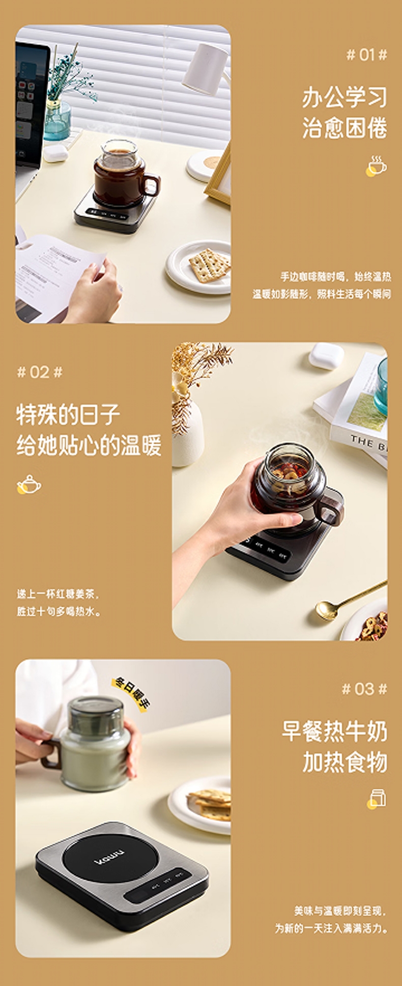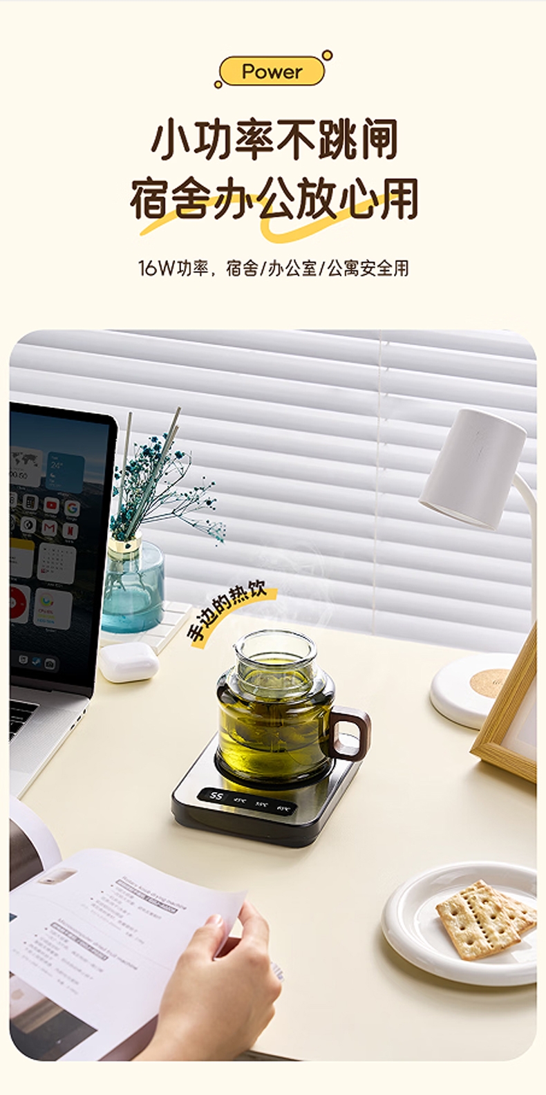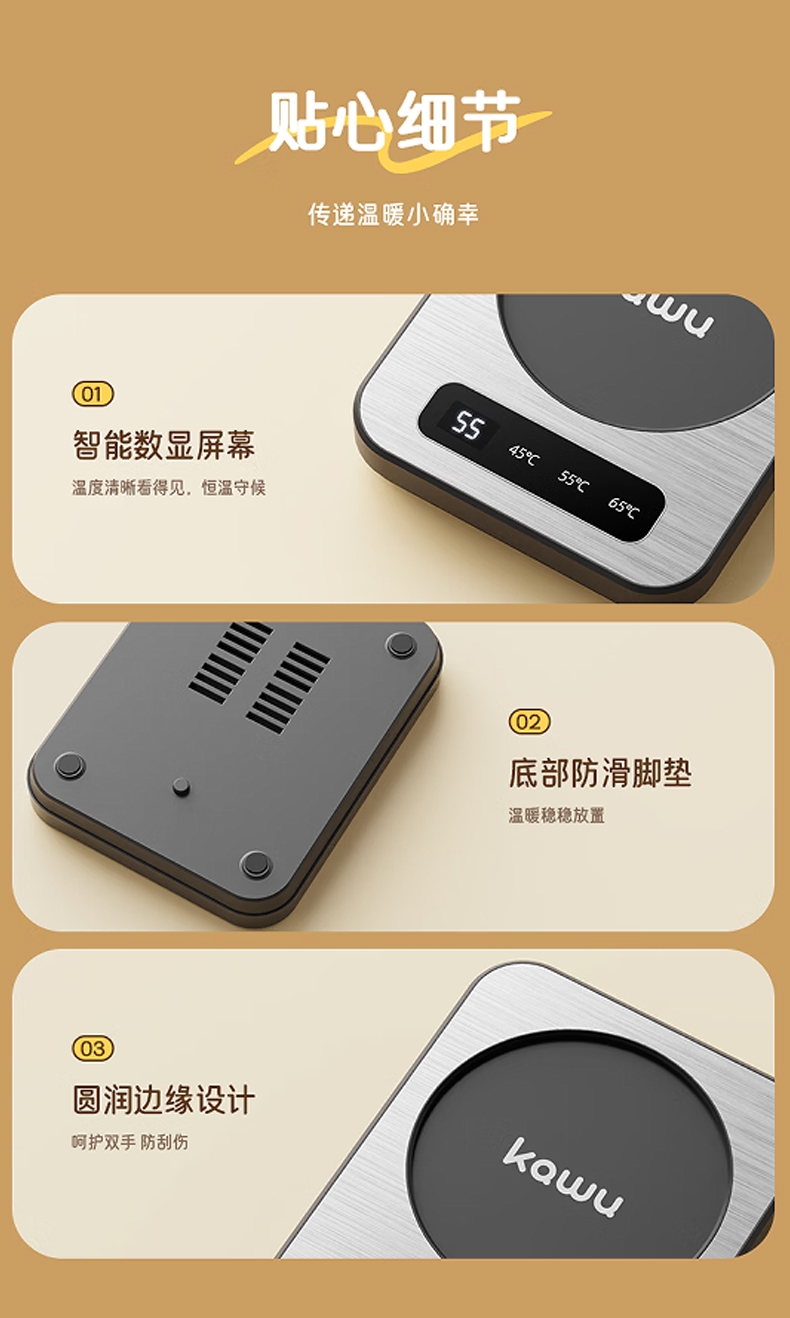 PTC发热自动控温,90mm加大发热面板;3档恒温随心选,小巧轻便不占地;小功率不跳闸,宿舍/办公室/公寓安心用;智能数显屏幕,防滑脚垫,圆润边缘设计