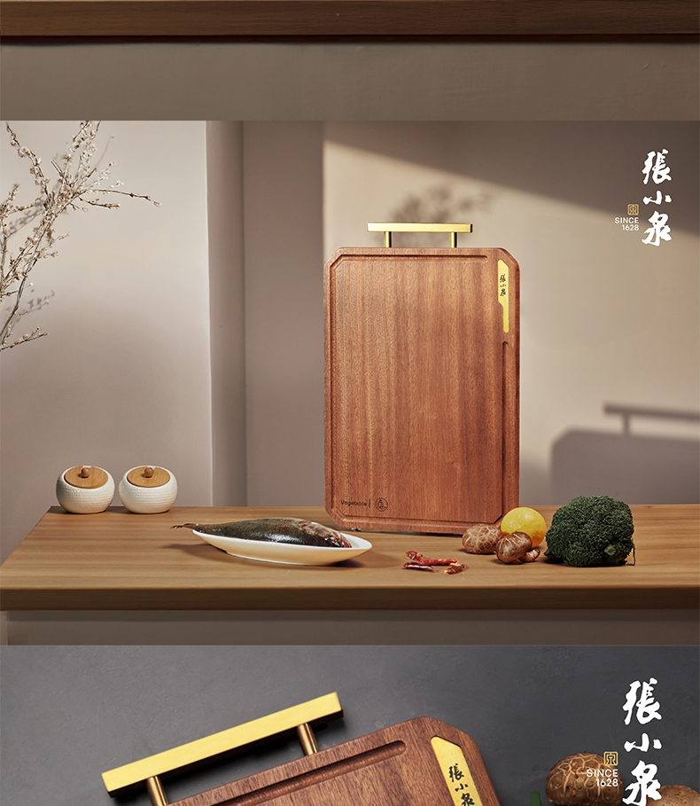 乌檀天然整木砧板,耐砍耐剁,不易裂开;;牢固不锈钢提手,圆润顺手,可提可挂;;无漆无蜡,一冲即净; 高温脱脂干燥,不易发霉