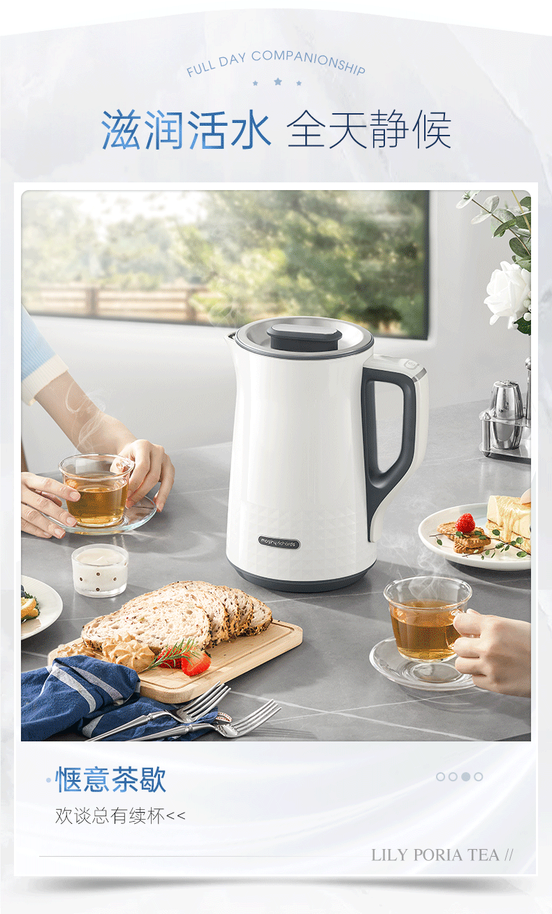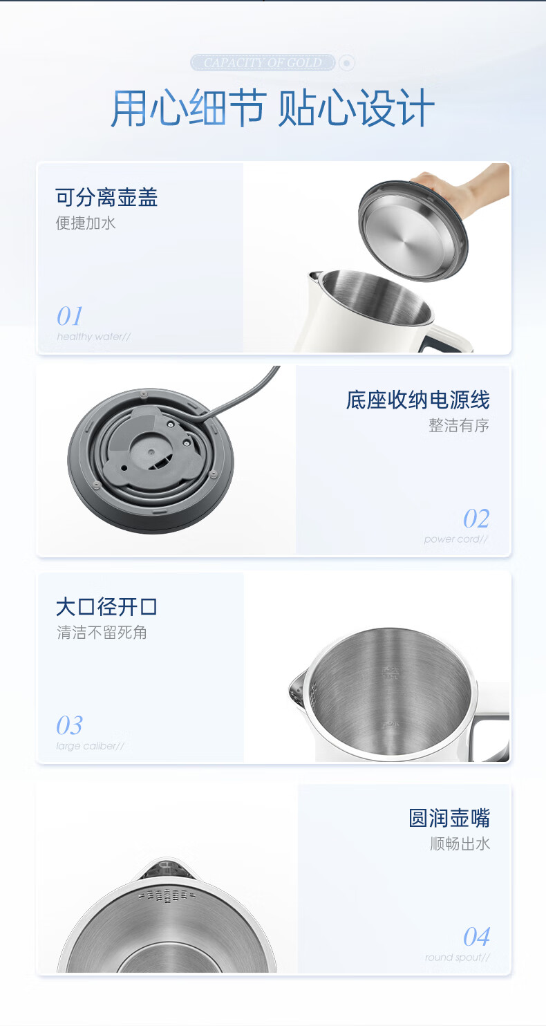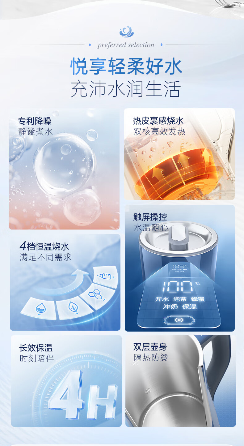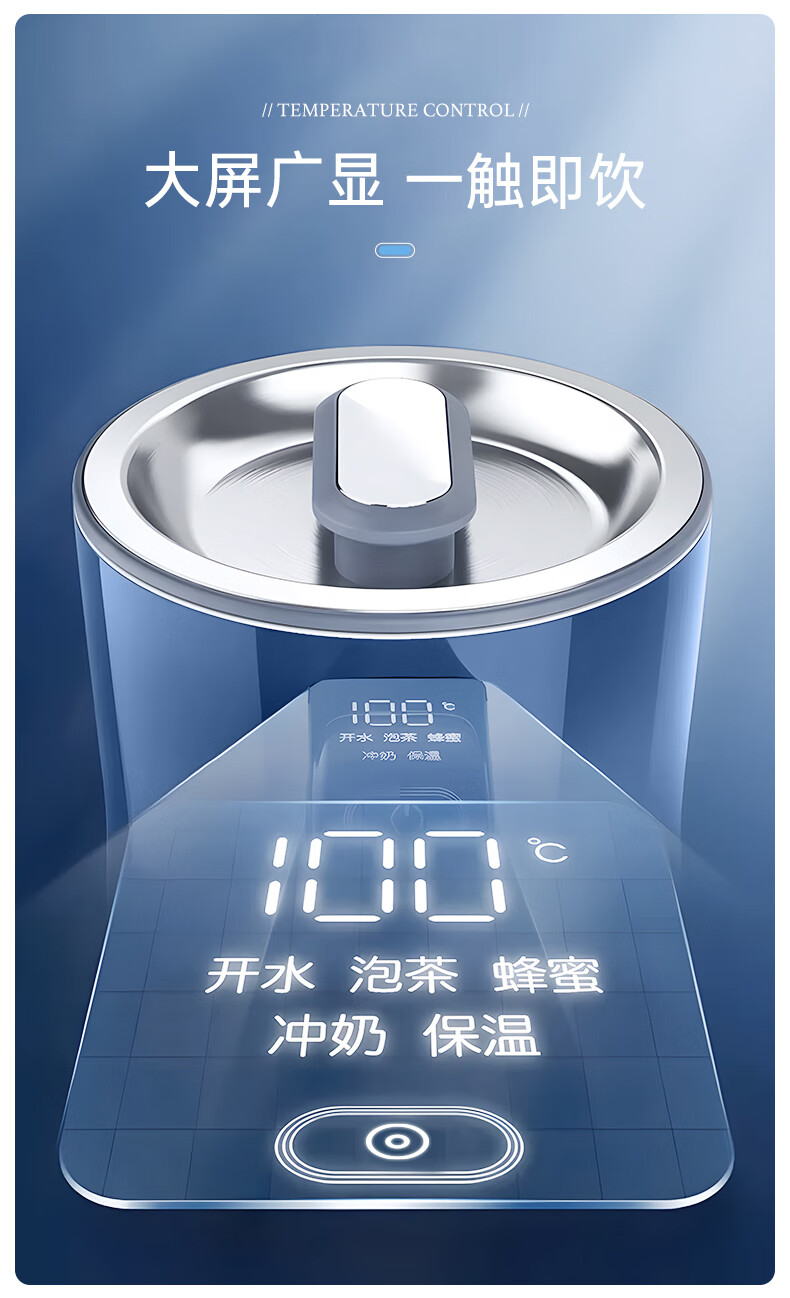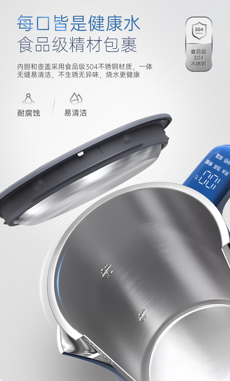 4档精准控温,恒温烧水;食品级SUS304不锈钢内胆,保证饮水安全;实时屏幕显示温度与选择程序,轻触开启