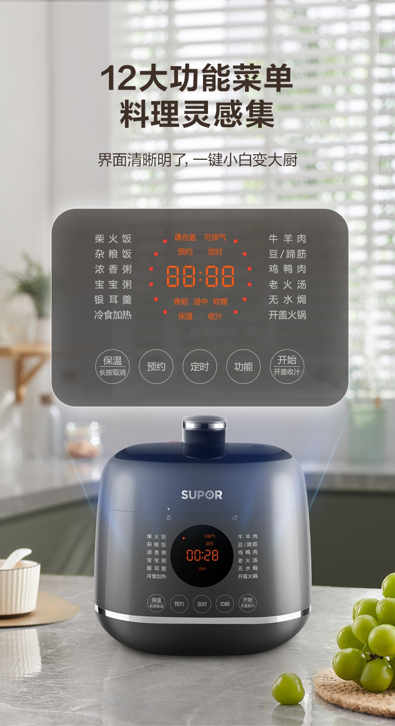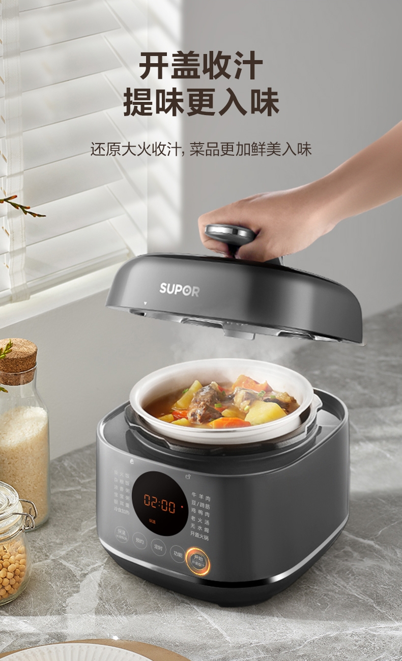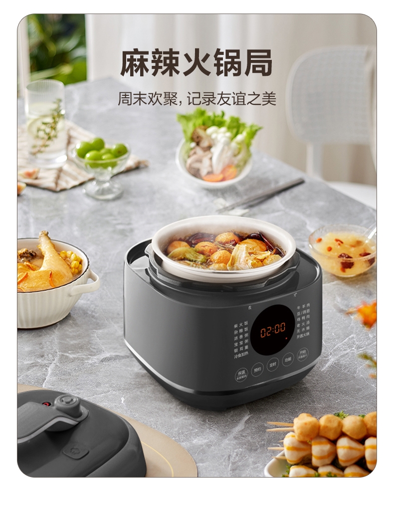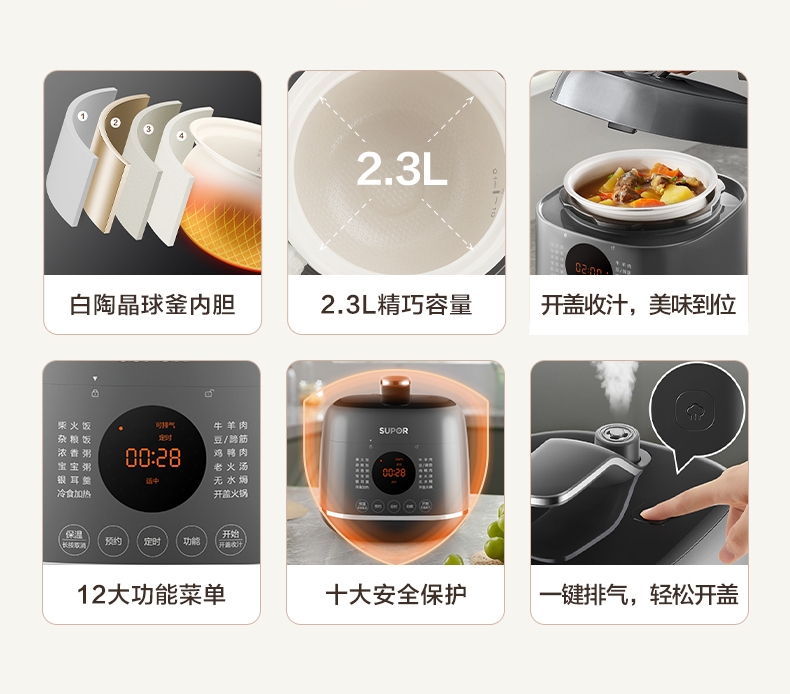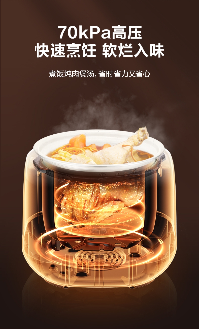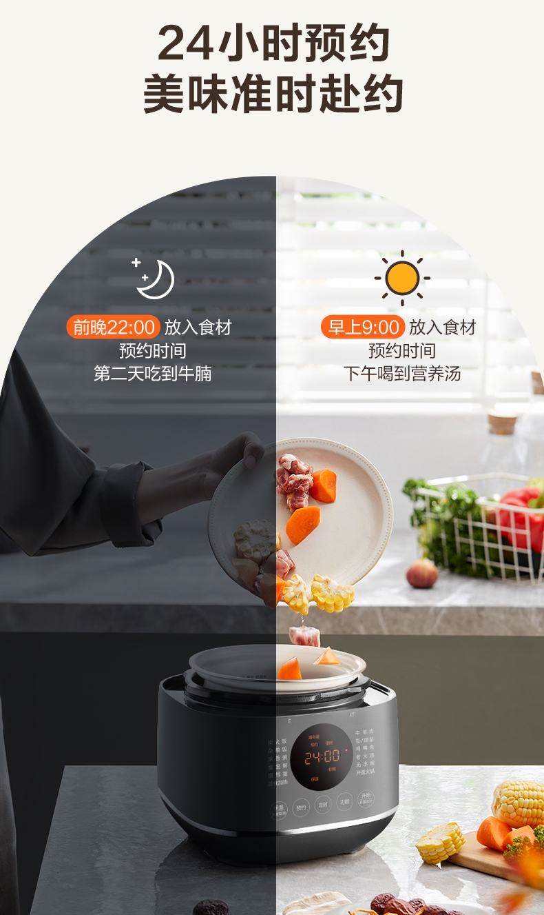 旋钮易操作出菜快人一步,一旋一按快启美味食刻;球釜内胆环流大沸腾,高温高压猛火炖骨肉分离尽兴吃;13大功能菜单触控面板和精控旋钮,轻旋美味即享;24小时预约可定时设计时间口感自主掌控