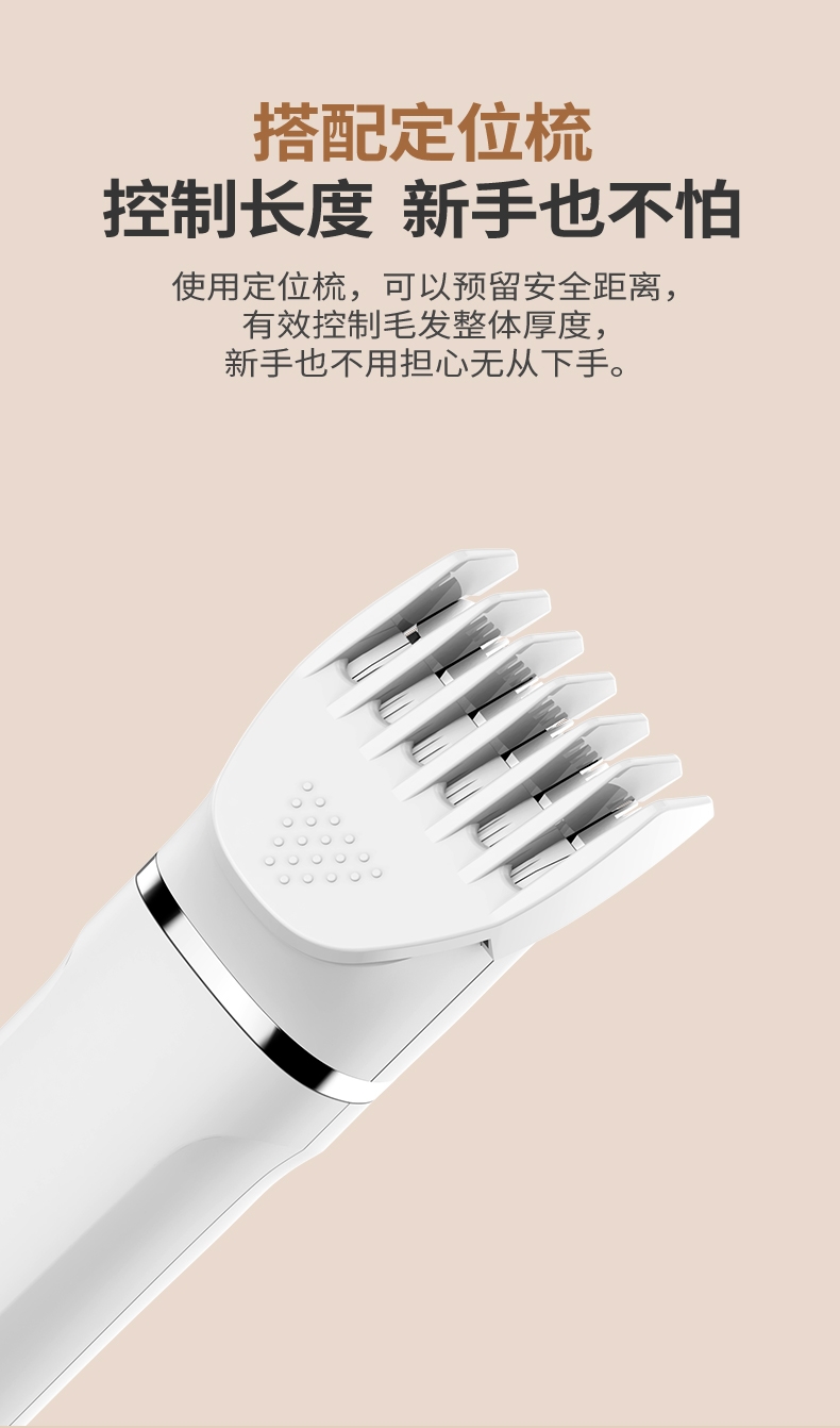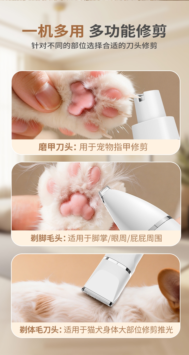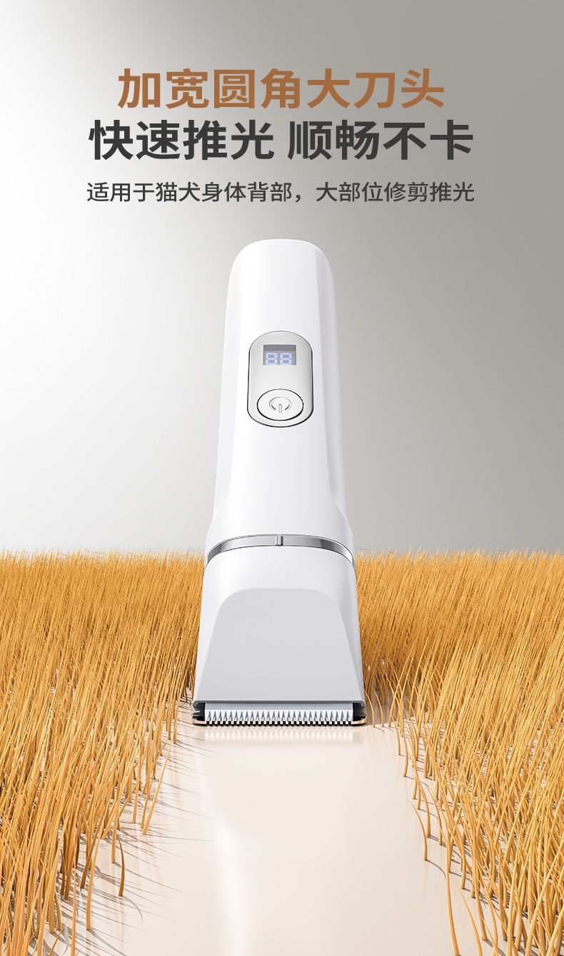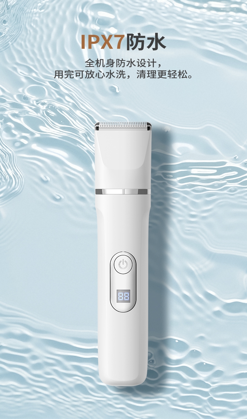 多刀头配件可全面剃毛,适用宠物全身部位;低音低噪,宠物更配合;7级防水,机器水洗更轻松;液晶显示