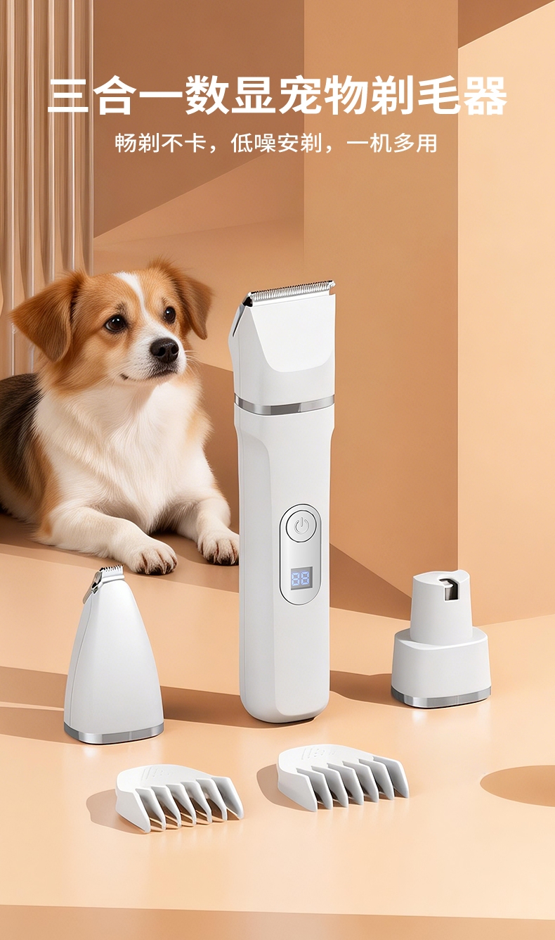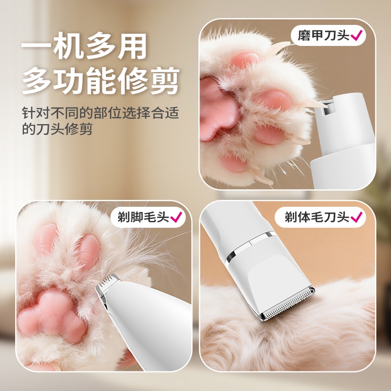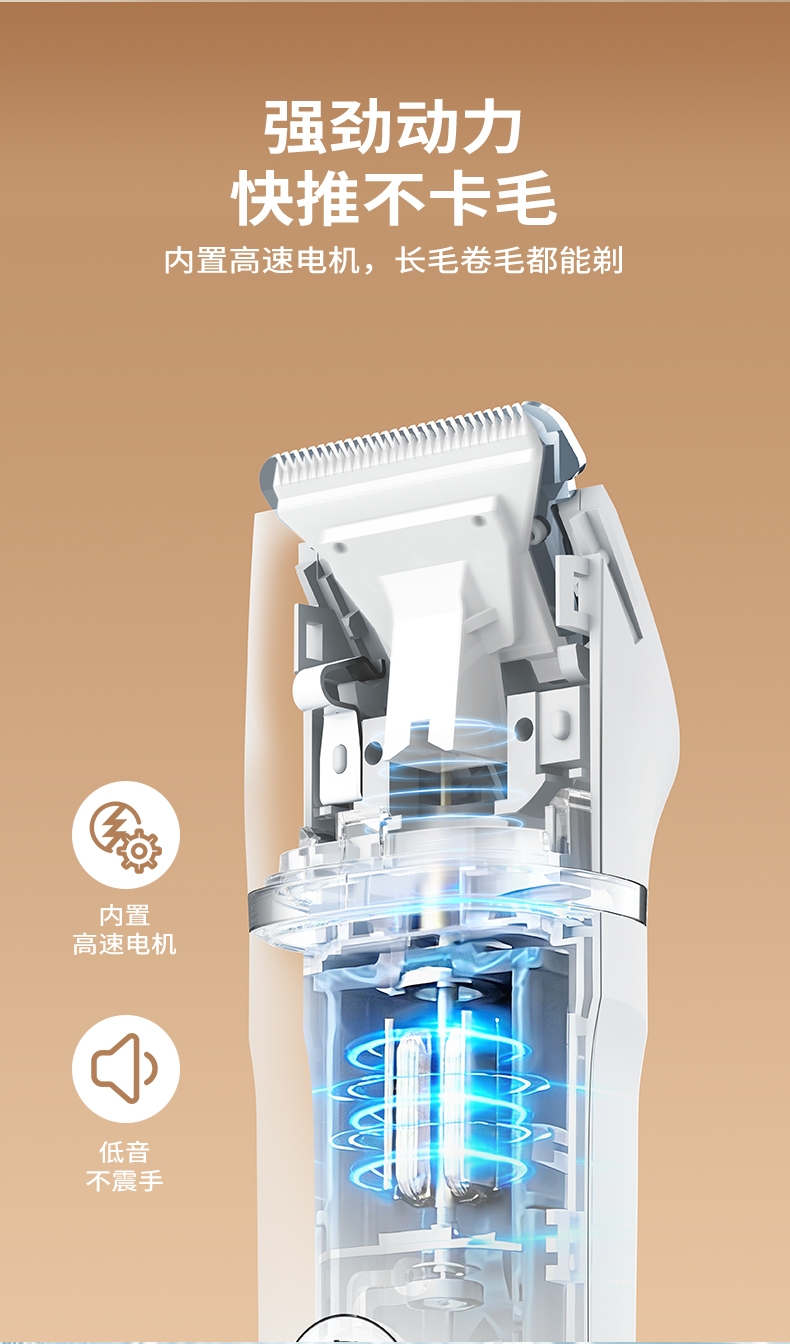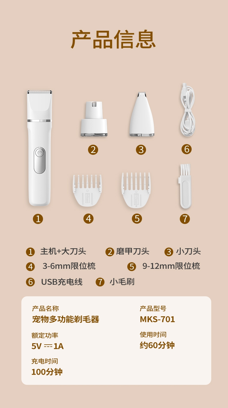 多刀头配件可全面剃毛,适用宠物全身部位;低音低噪,宠物更配合;7级防水,机器水洗更轻松;液晶显示