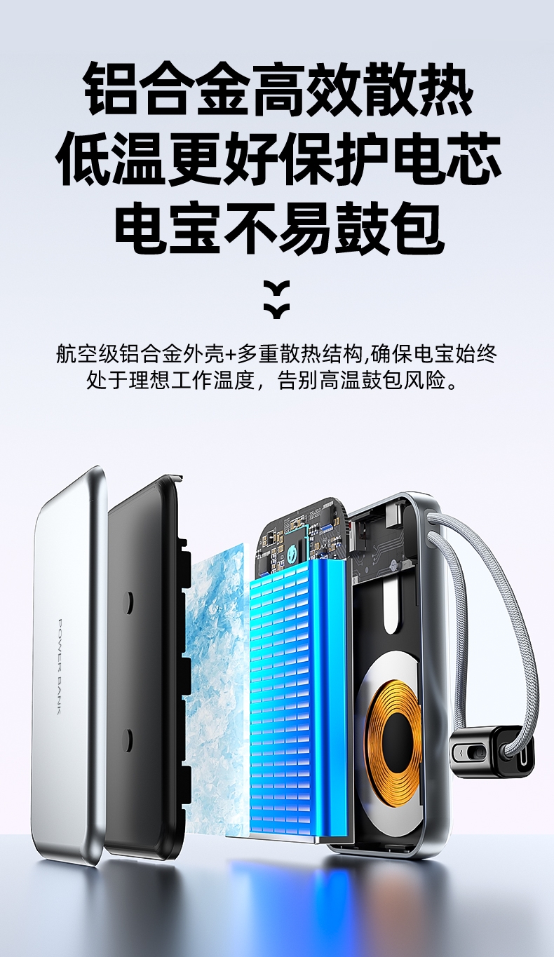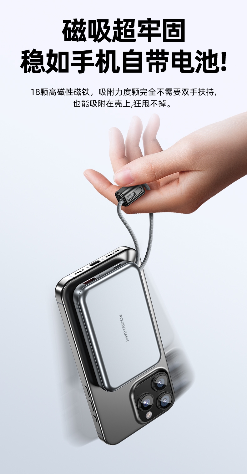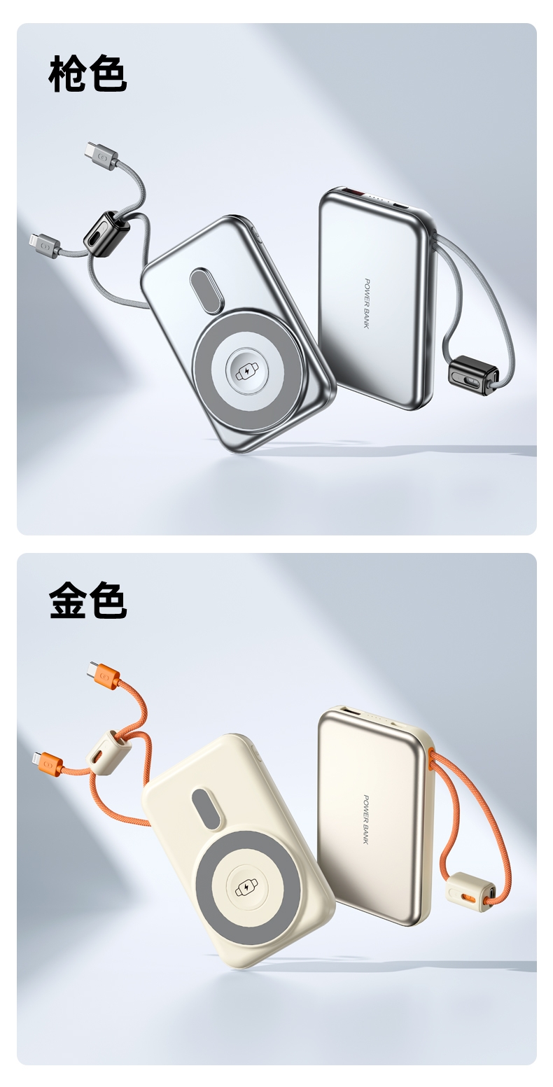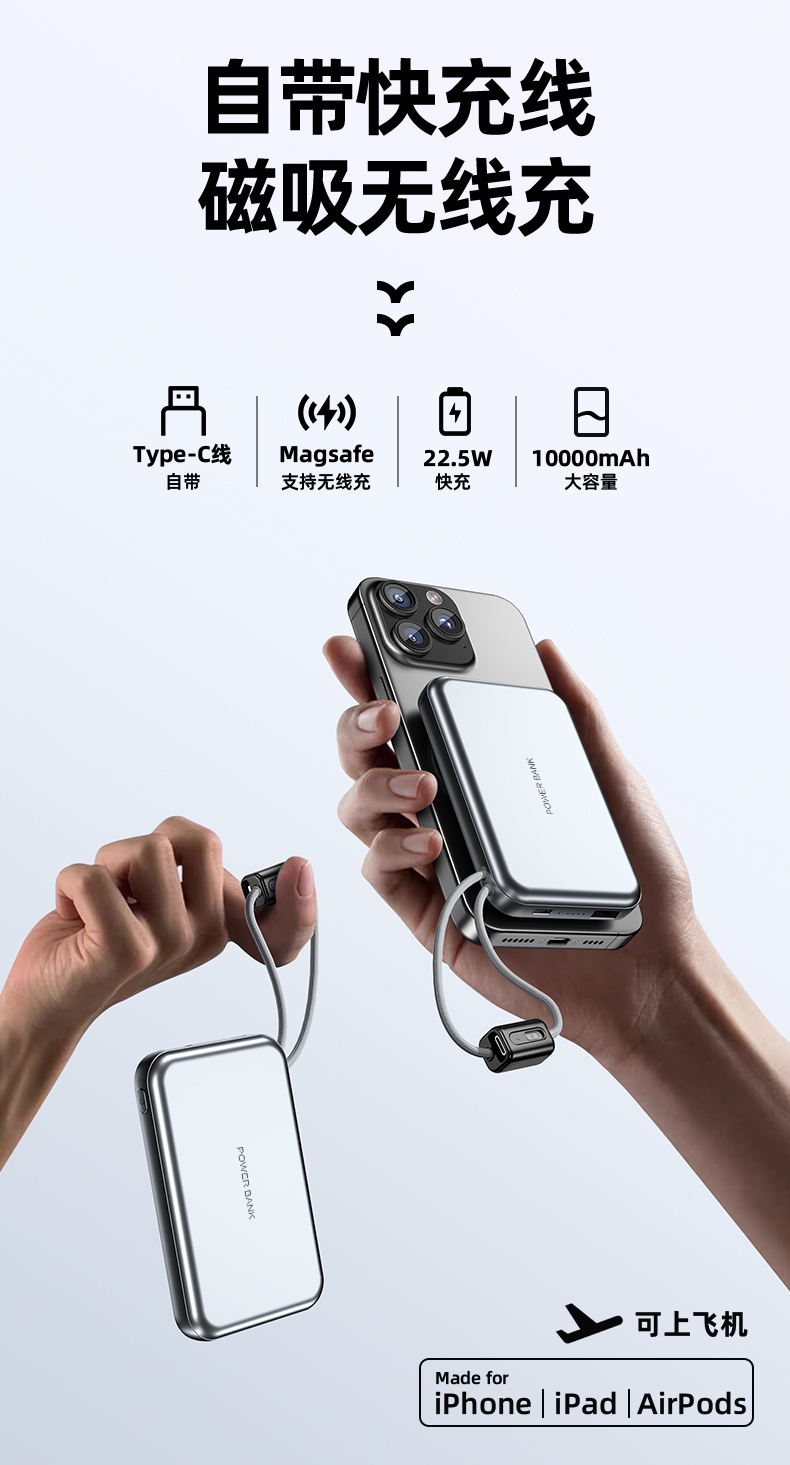 10000毫安容量,3C安全认证,二维码数字标识;15W磁吸无线充,兼容苹果华为手表;22.5W超级快充,兼容PD20W;自带苹果/Type-C接口满足各种手机充电;挂绳设计,携带方便 符合民航局标准,可随身携带