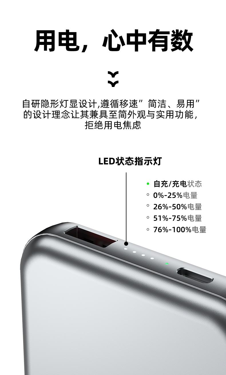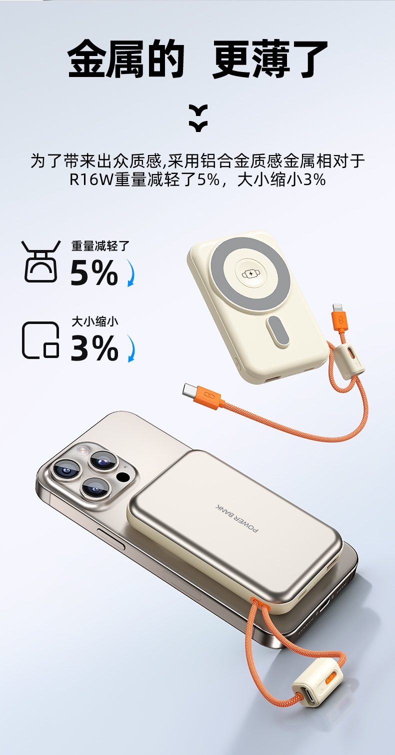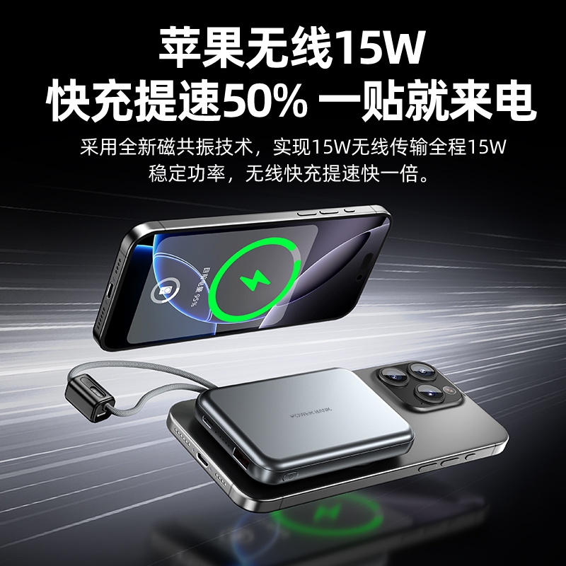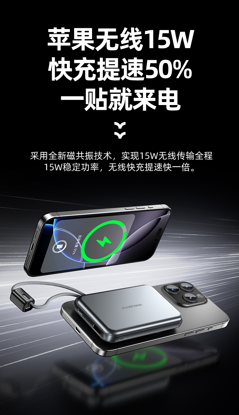 10000毫安容量,3C安全认证,二维码数字标识;15W磁吸无线充,兼容苹果华为手表;22.5W超级快充,兼容PD20W;自带苹果/Type-C接口满足各种手机充电;挂绳设计,携带方便 符合民航局标准,可随身携带