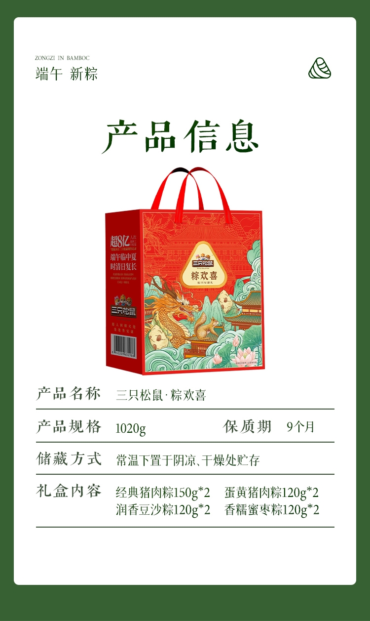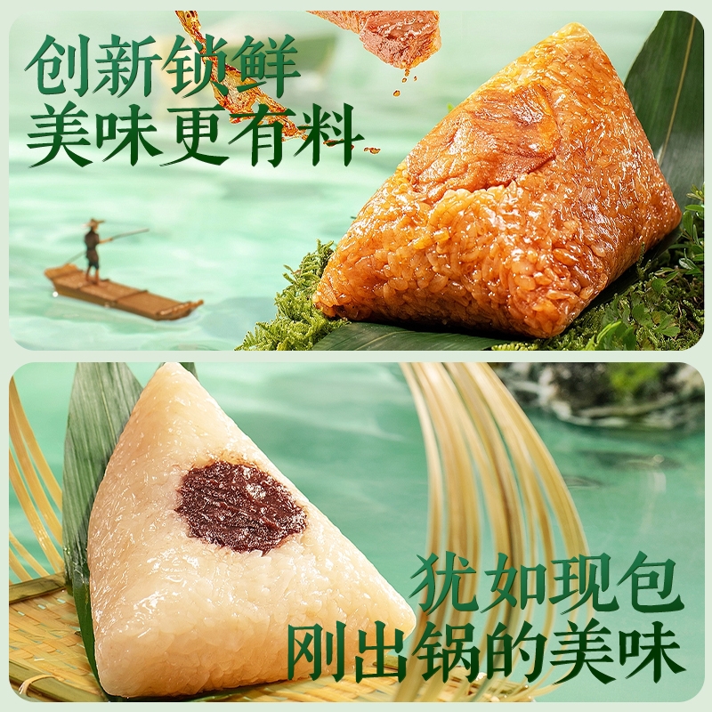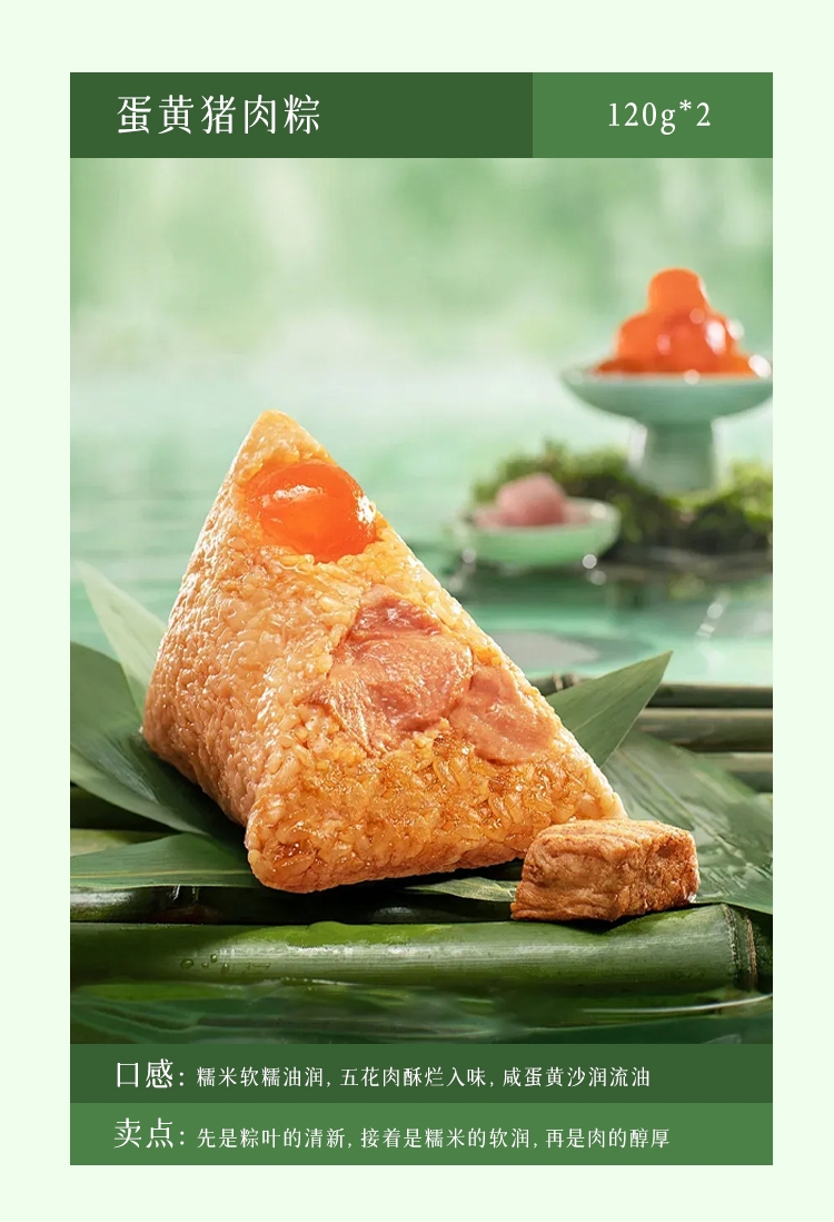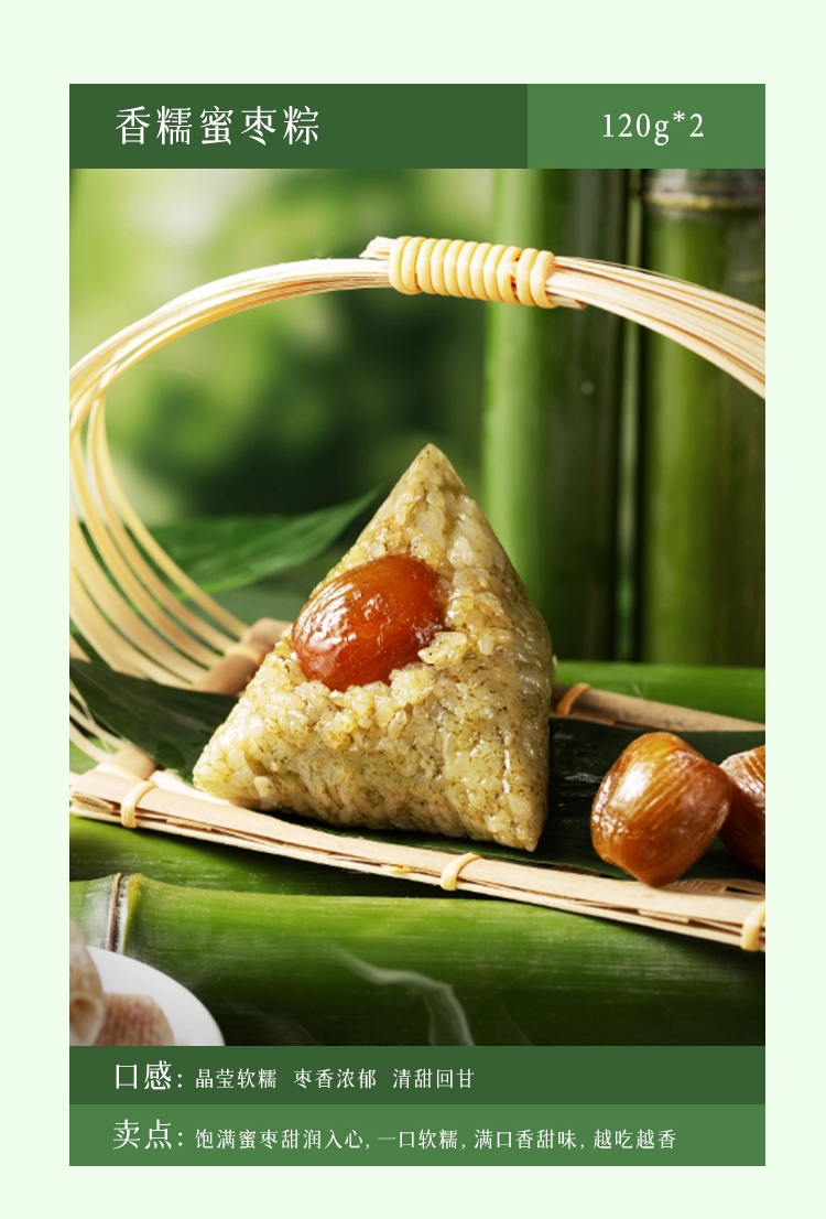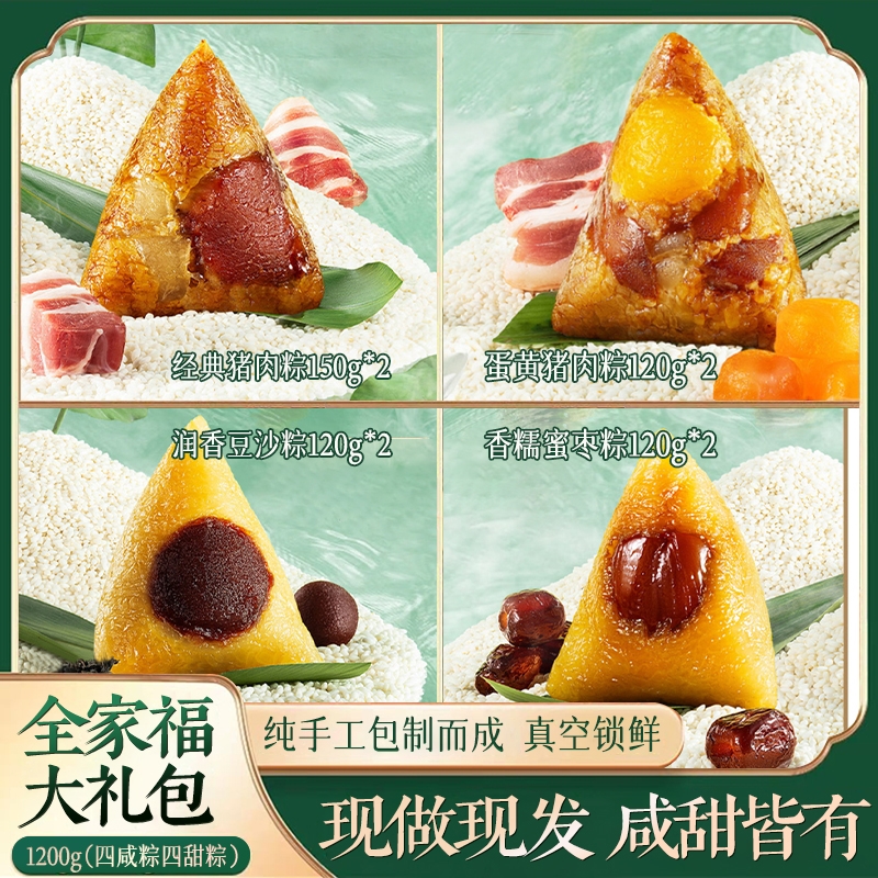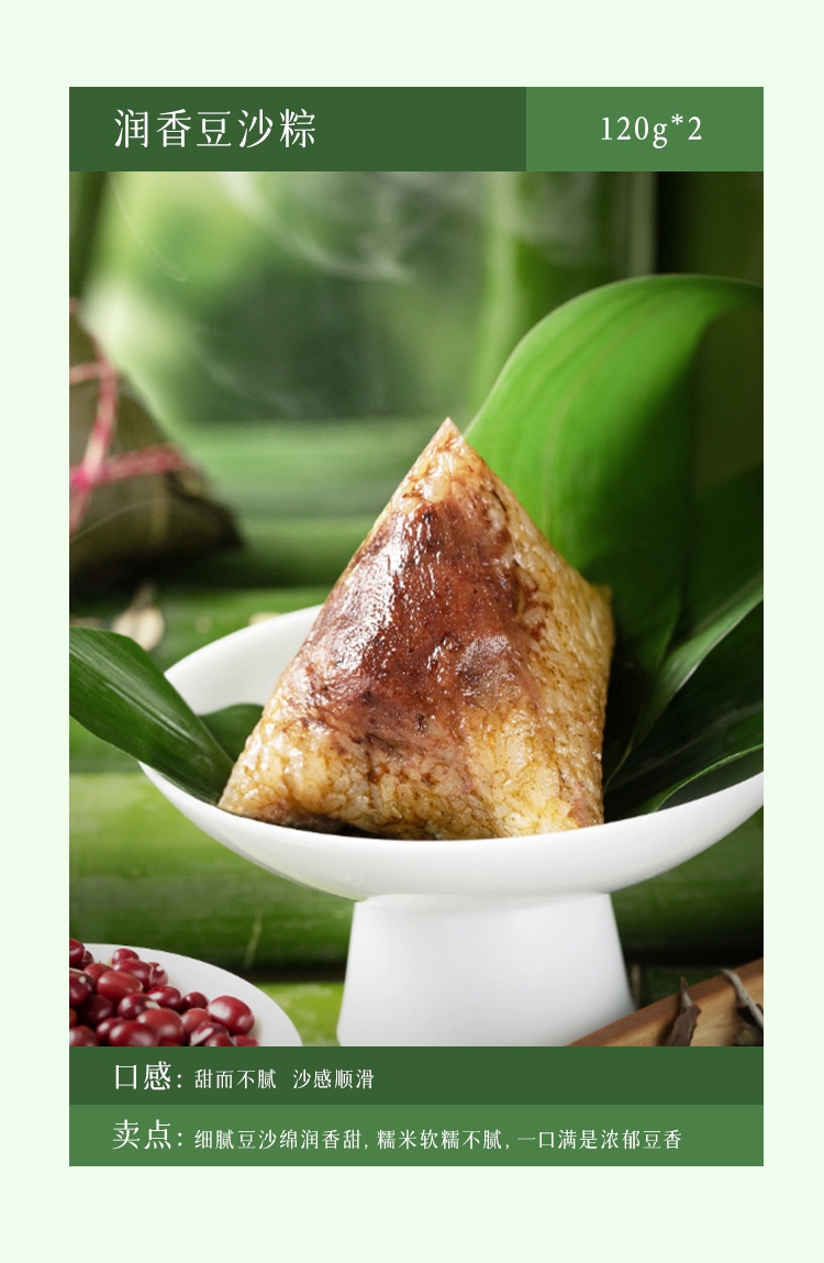 配置:经典猪肉粽150g*2 蛋黄猪肉粽120g*2 润香豆沙粽120g*2 香糯蜜枣粽120g*2