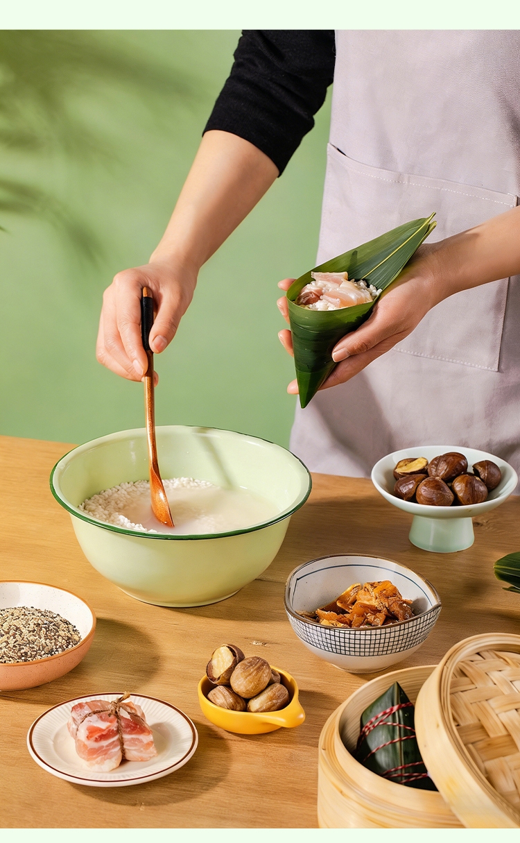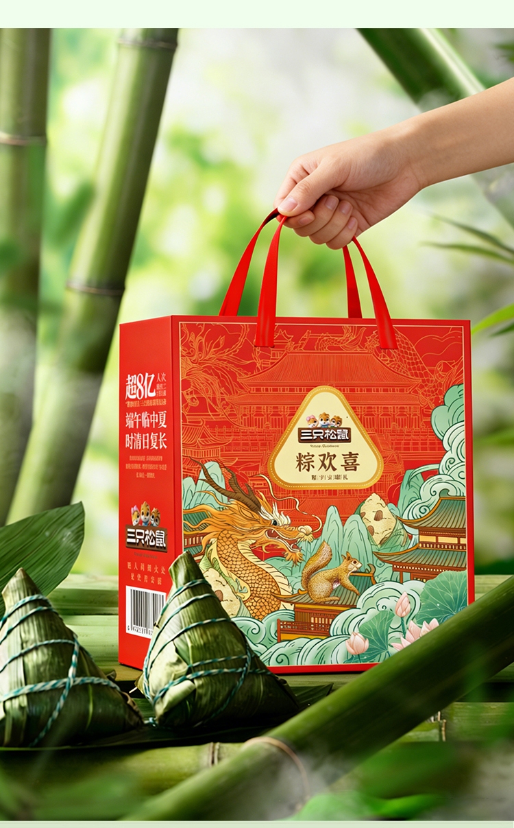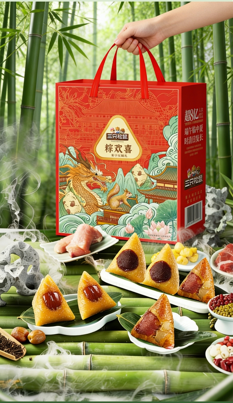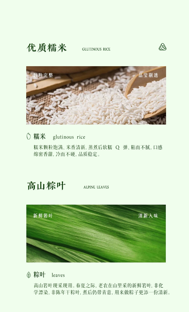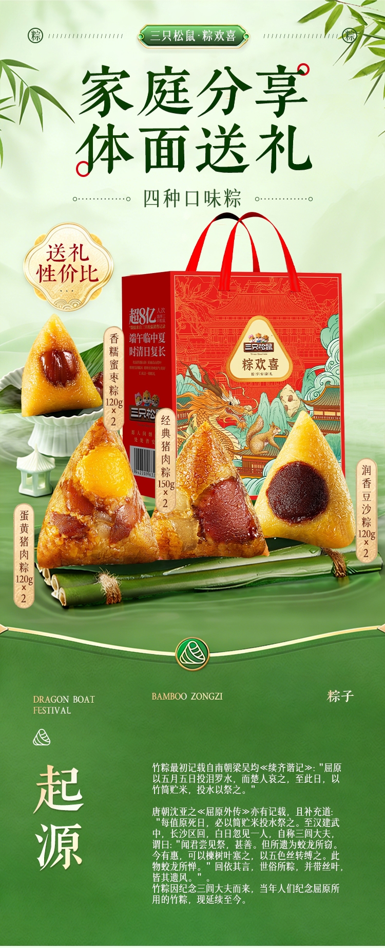配置:经典猪肉粽150g*2 蛋黄猪肉粽120g*2 润香豆沙粽120g*2 香糯蜜枣粽120g*2
