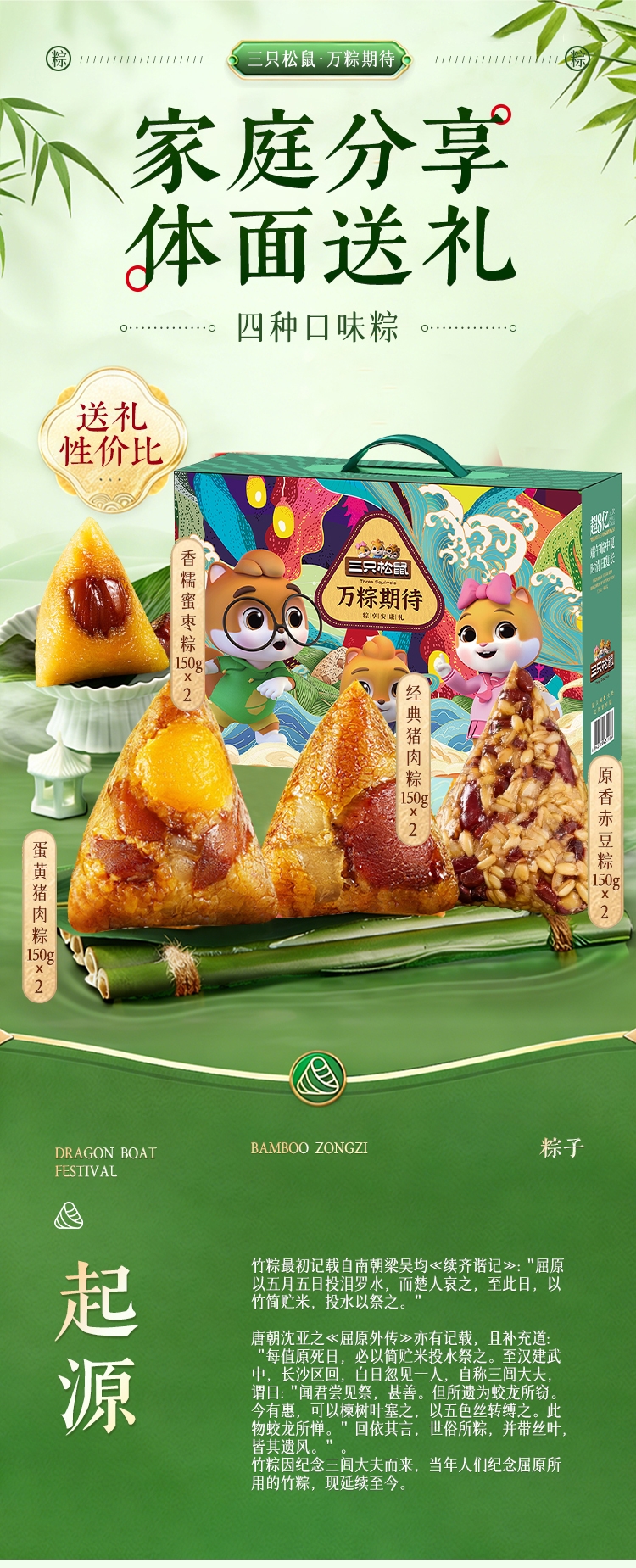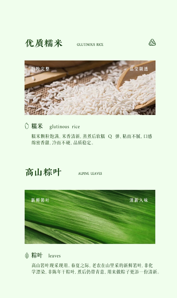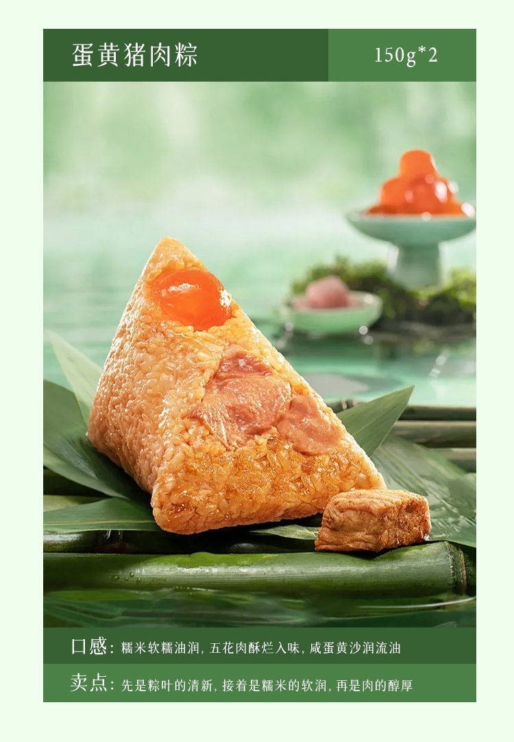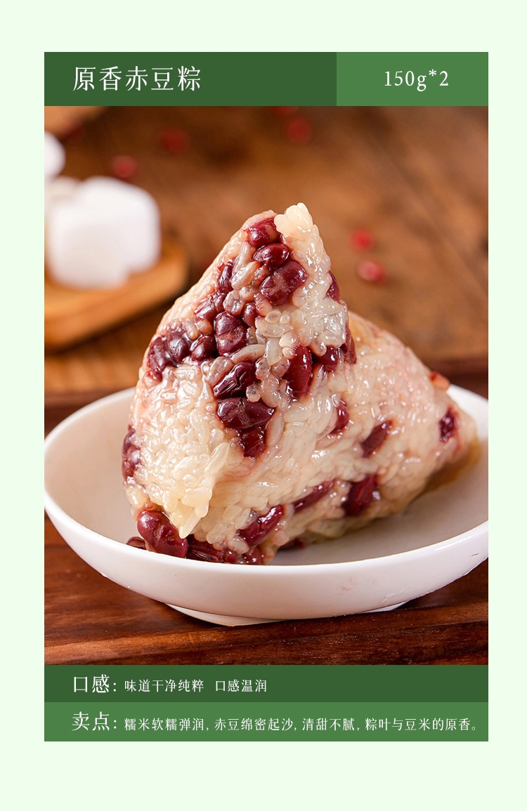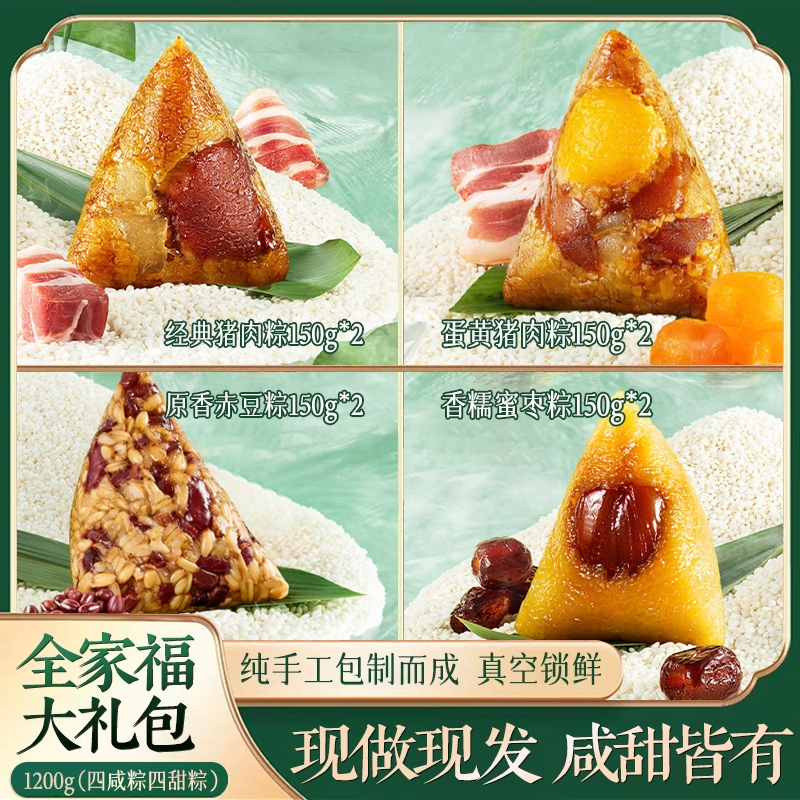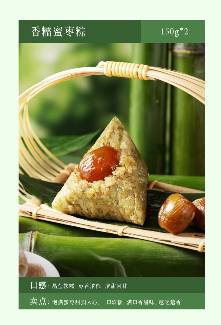 配置:经典猪肉粽150g*2 蛋黄猪肉粽150g*2 香糯蜜枣粽150g*2 原香赤豆粽150g*2