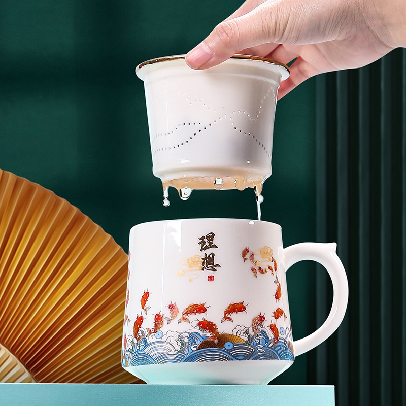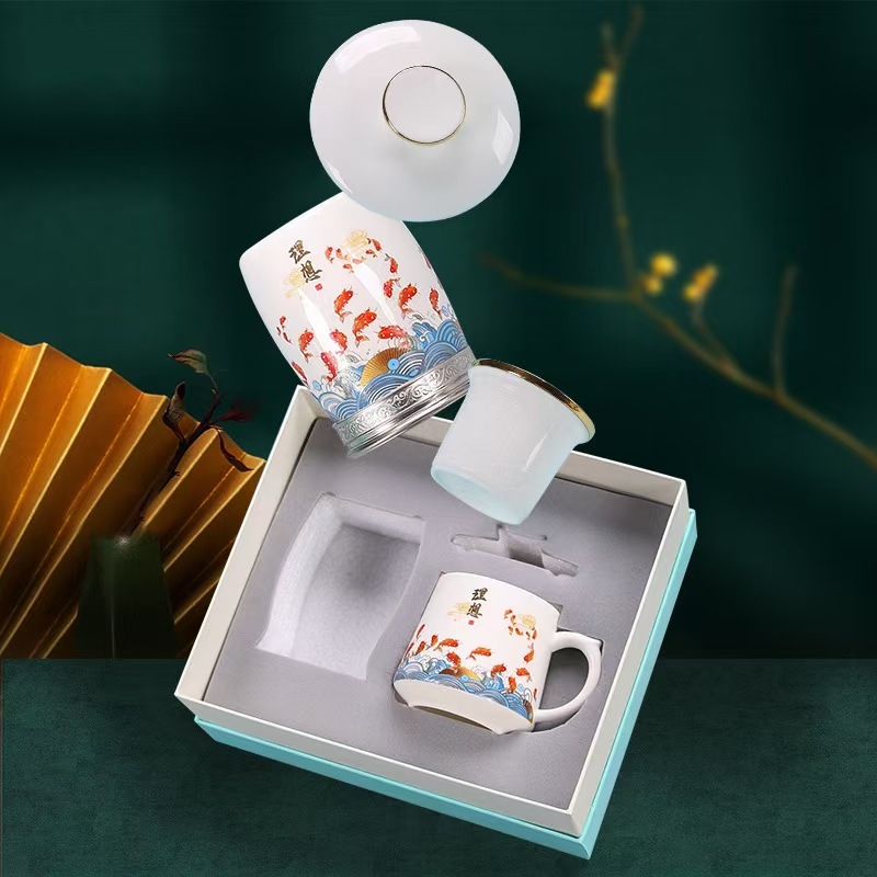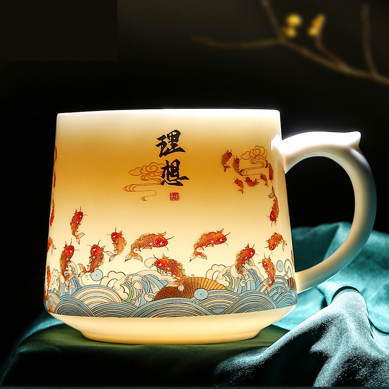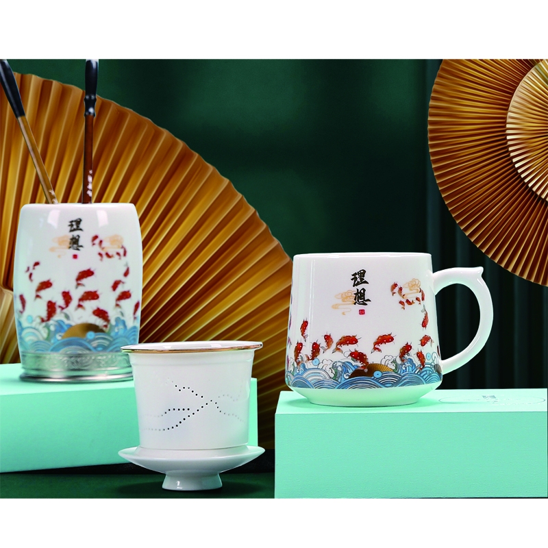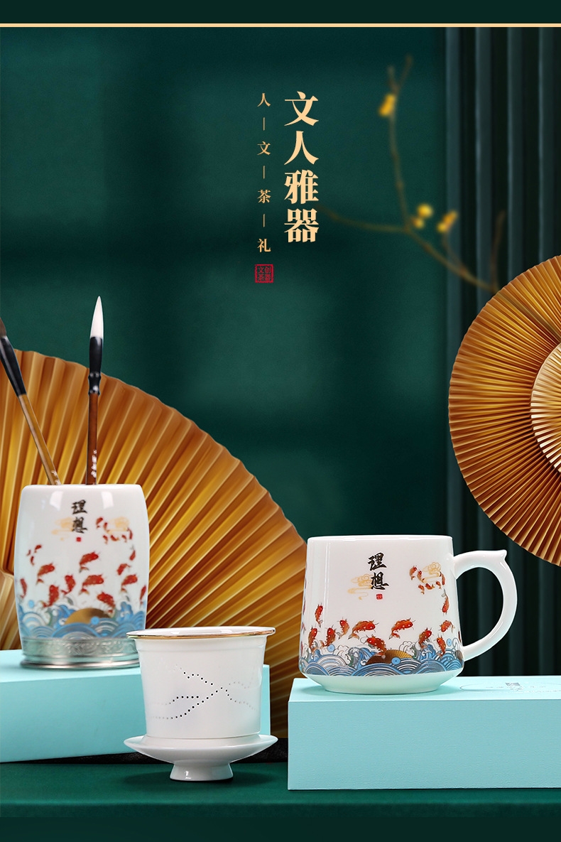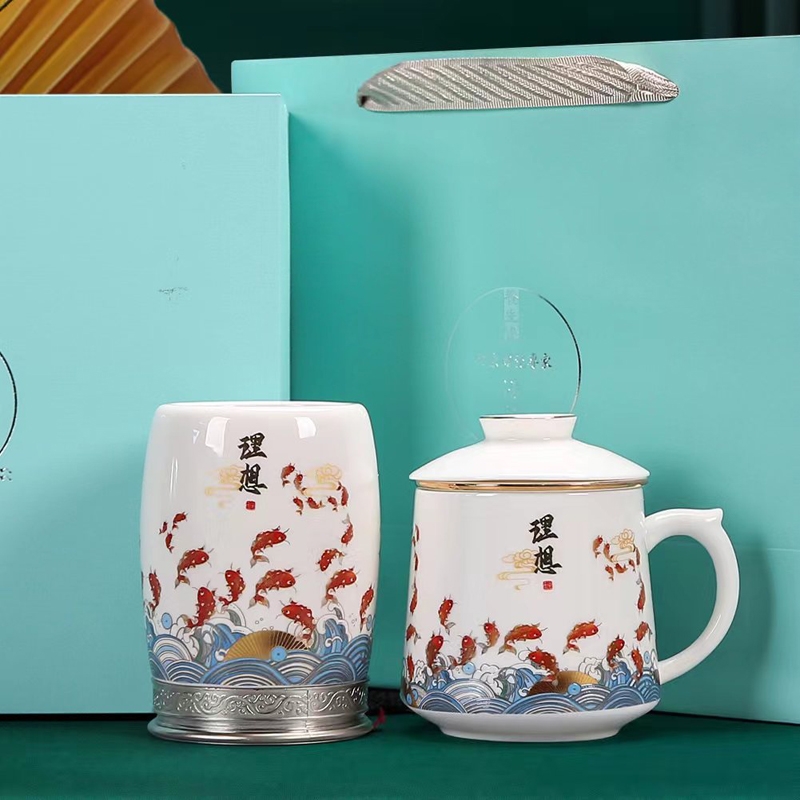 奢华羊脂玉瓷茶具,描金装饰,做工精致;品质高档非凡。鱼跃龙门,为理想而奋斗。;杯身可定制图案LOGO,盖顶可激光雕刻。