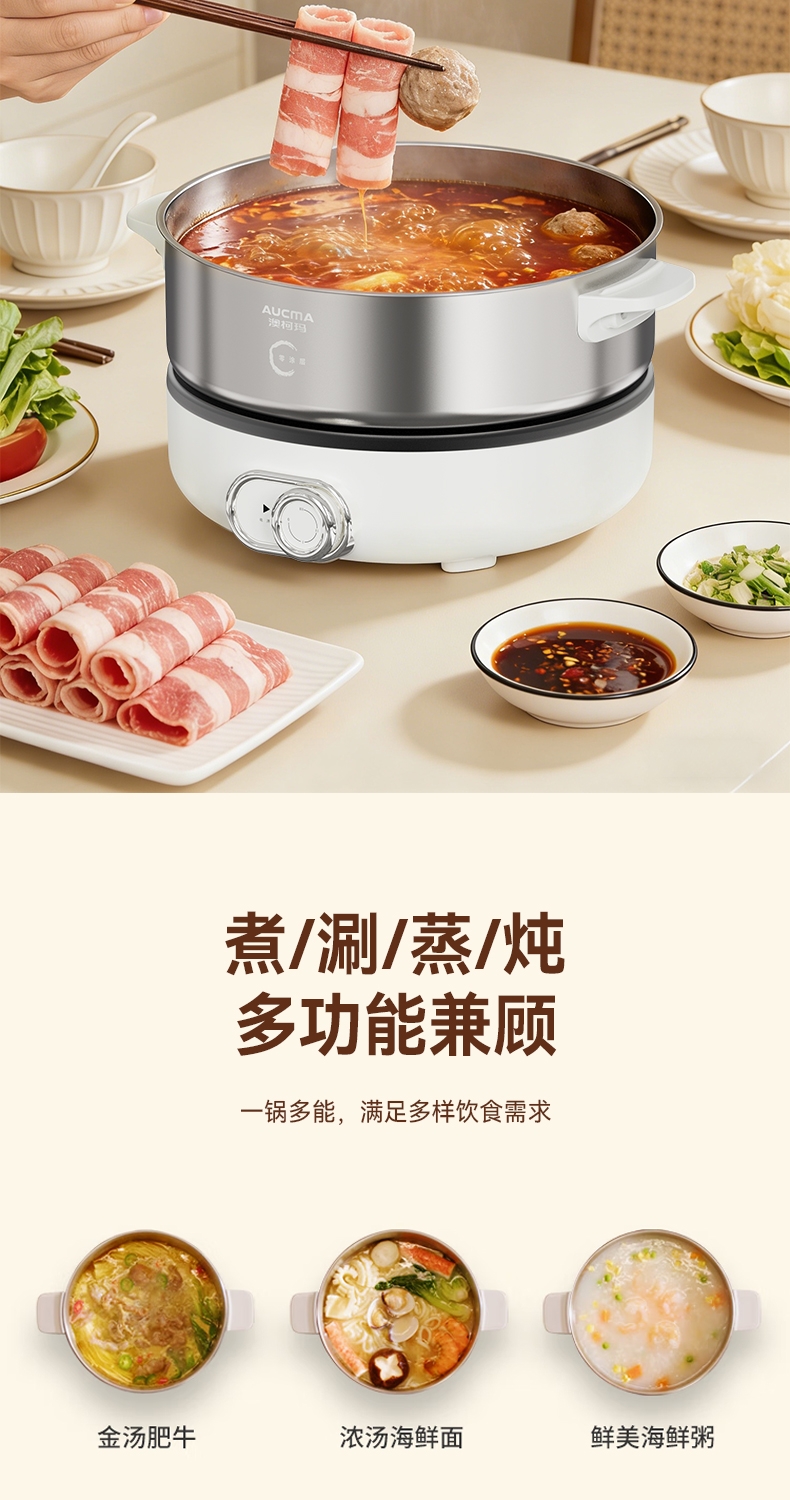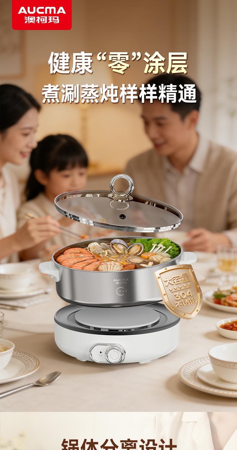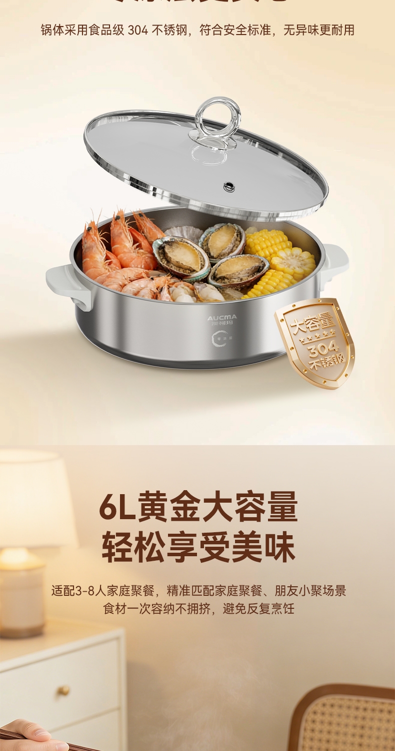 锅体分离设计美食轻松端上桌;6L黄金大容量轻松享受美味;煮/涮/蒸/炖多功能兼顾