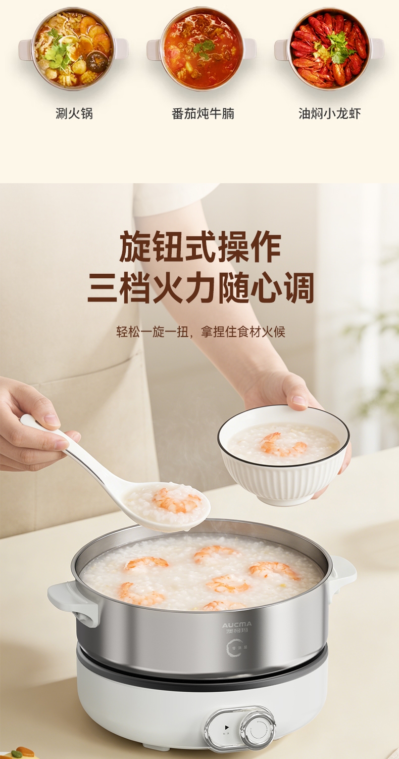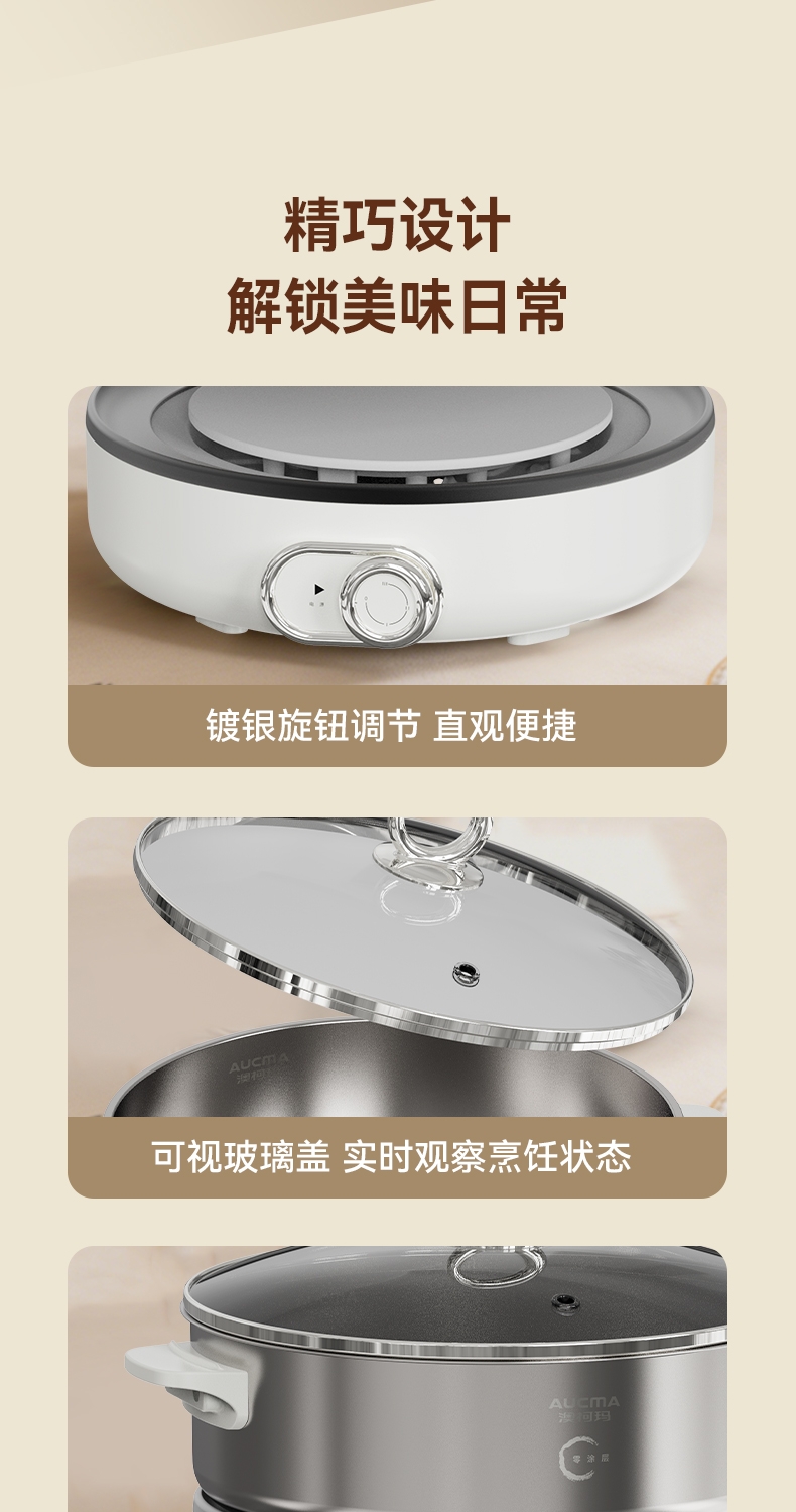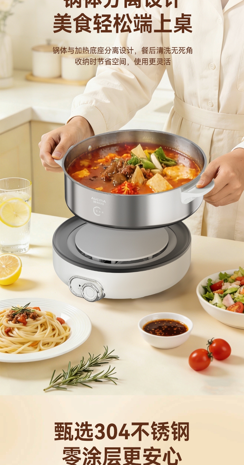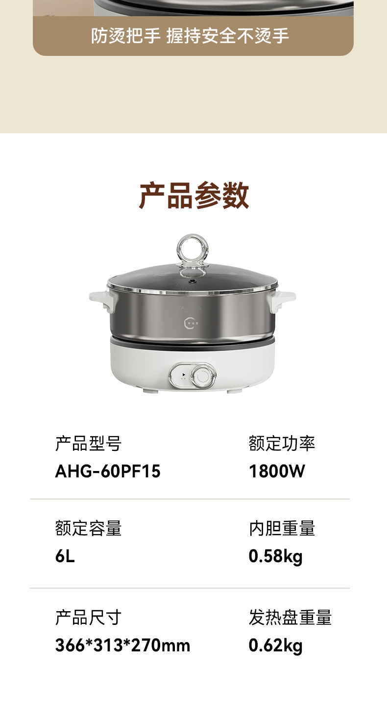 锅体分离设计美食轻松端上桌;6L黄金大容量轻松享受美味;煮/涮/蒸/炖多功能兼顾