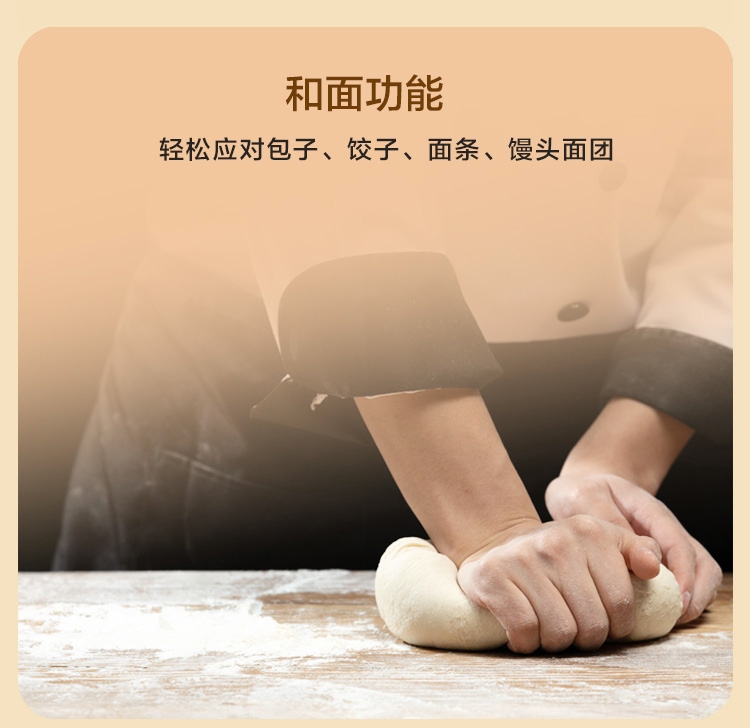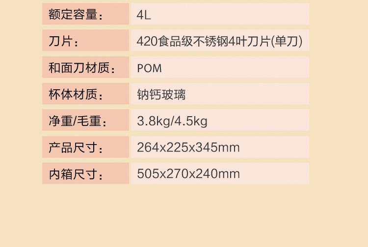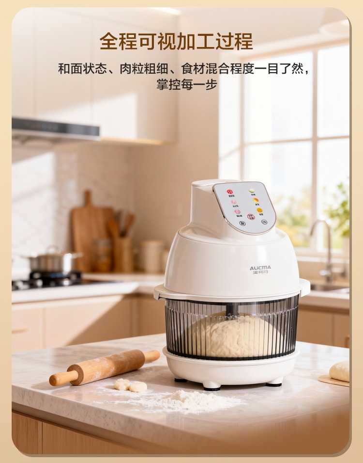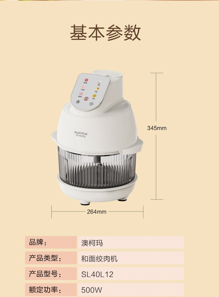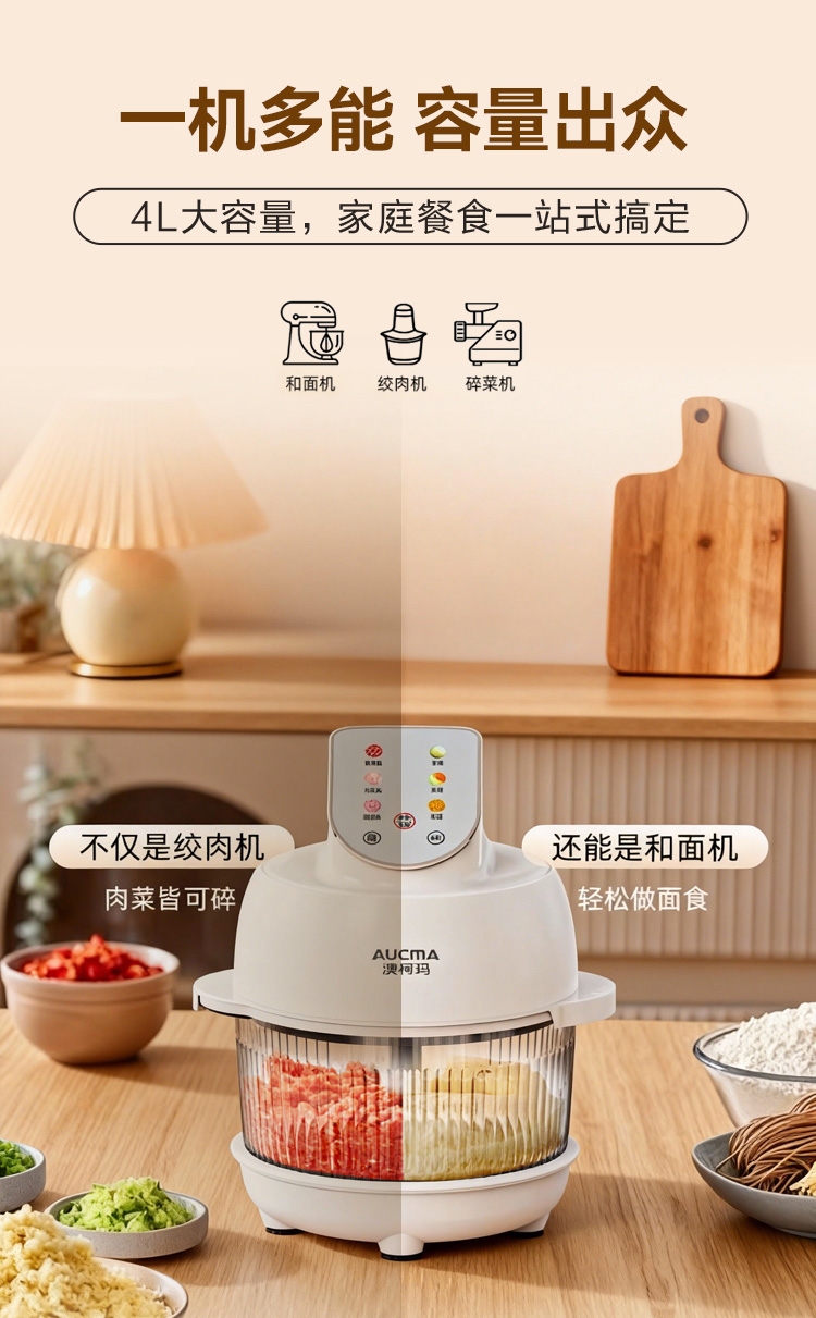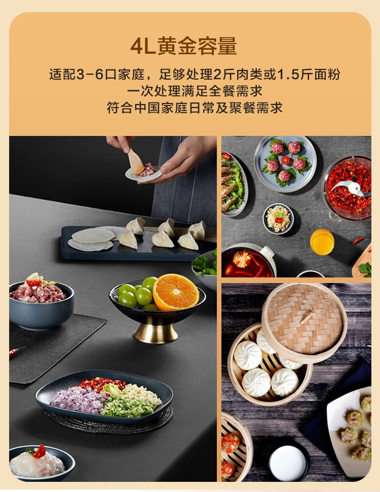 4L大容量满足全家需求;电动操作省时省力;双刀组(和面、绞肉),颜值实用兼顾