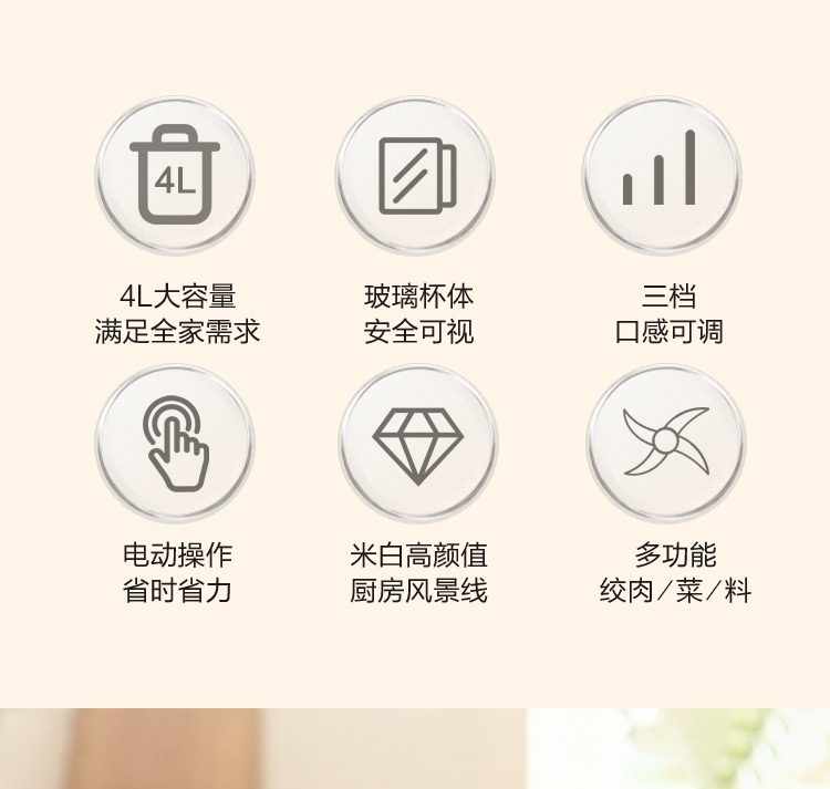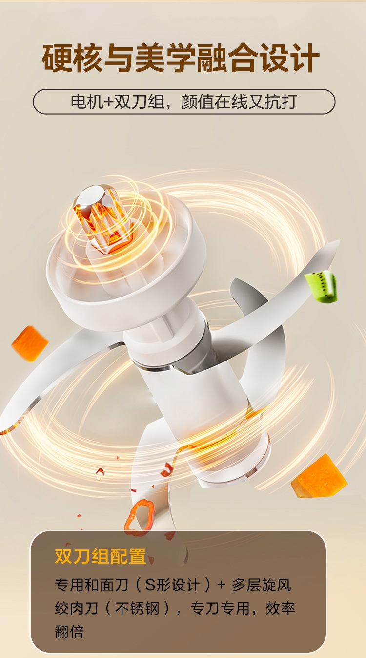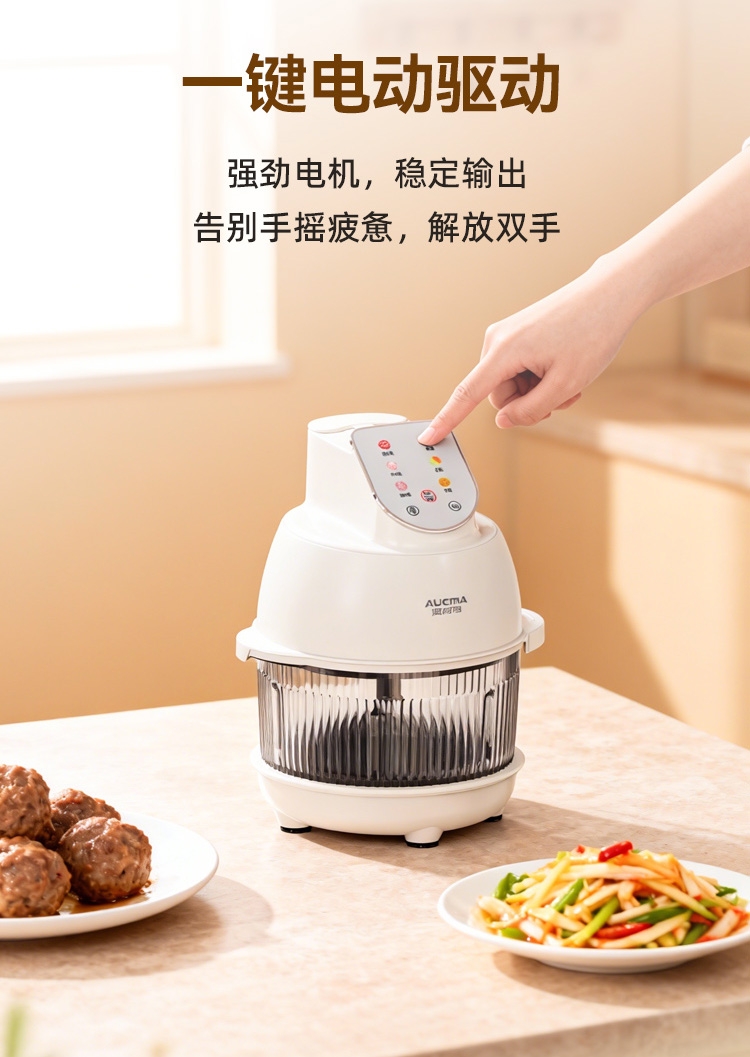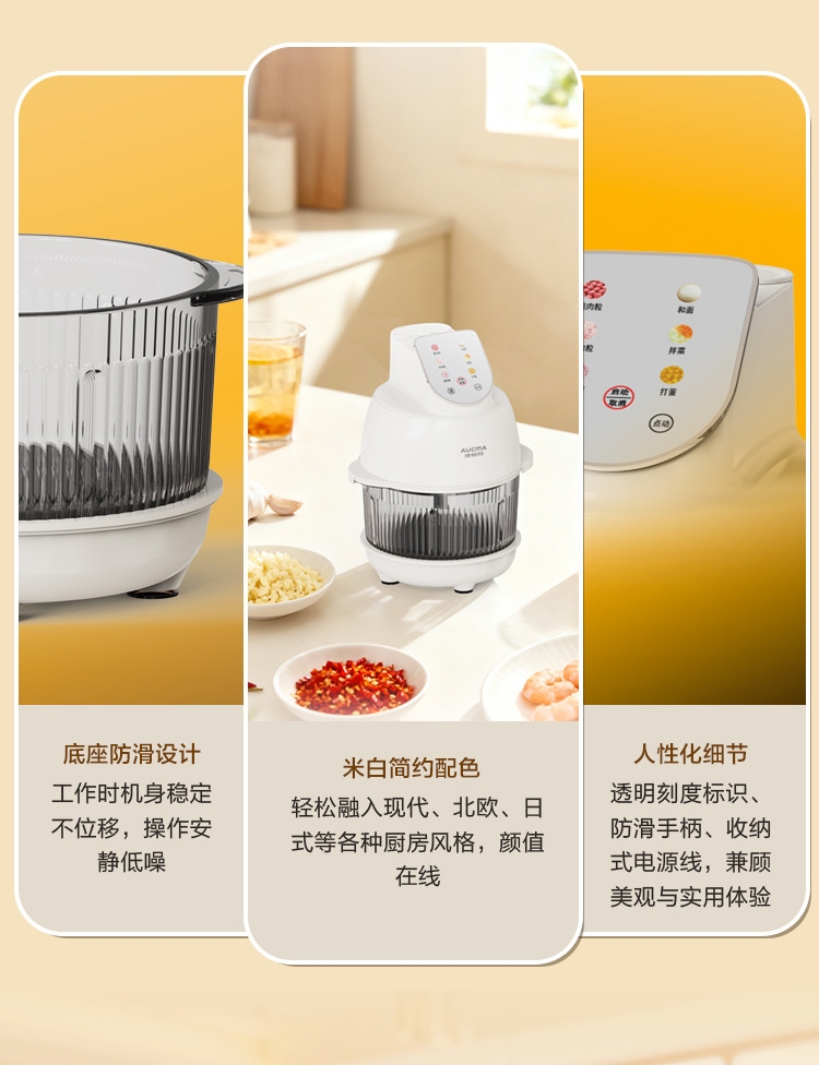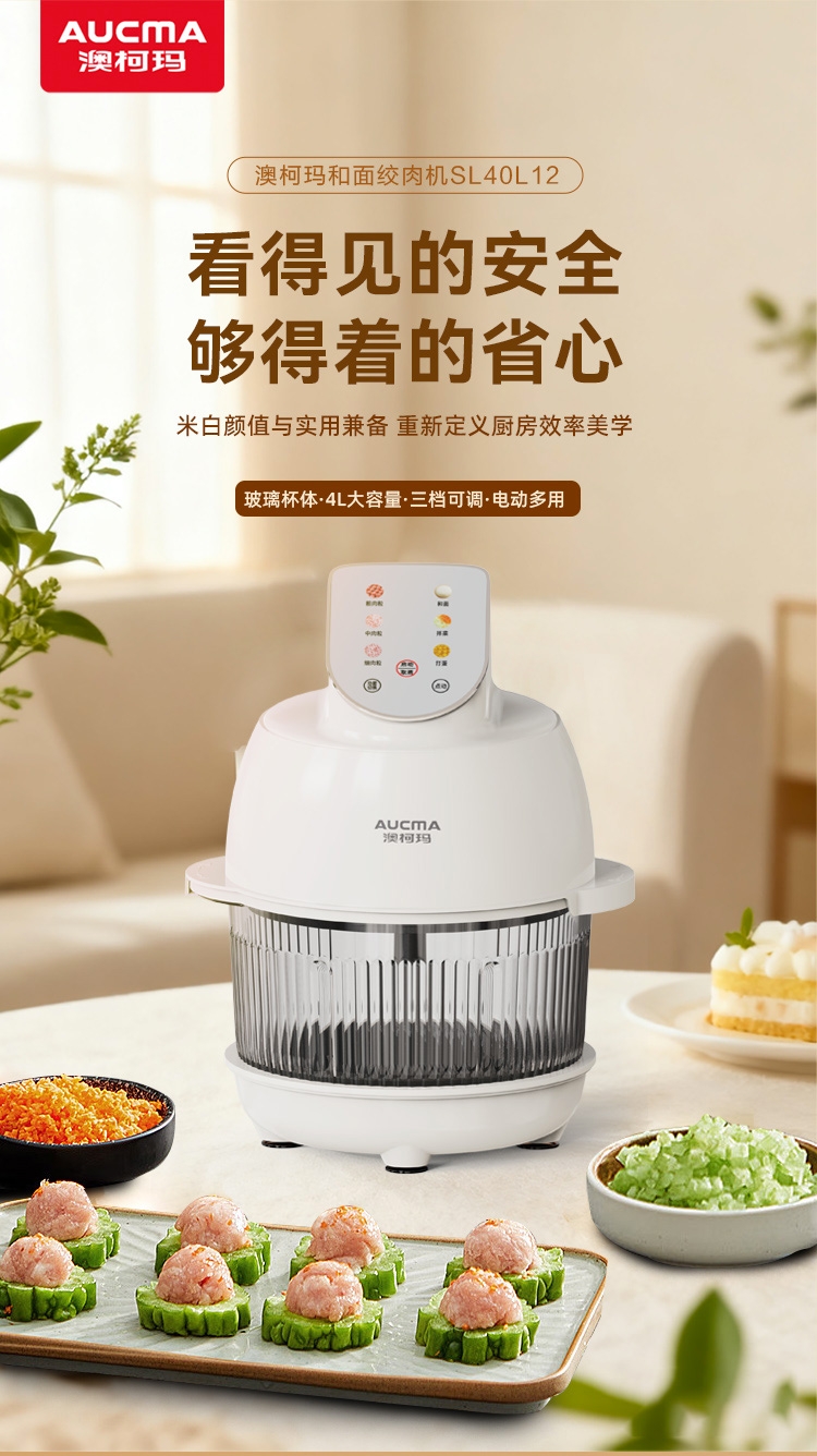 4L大容量满足全家需求;电动操作省时省力;双刀组(和面、绞肉),颜值实用兼顾