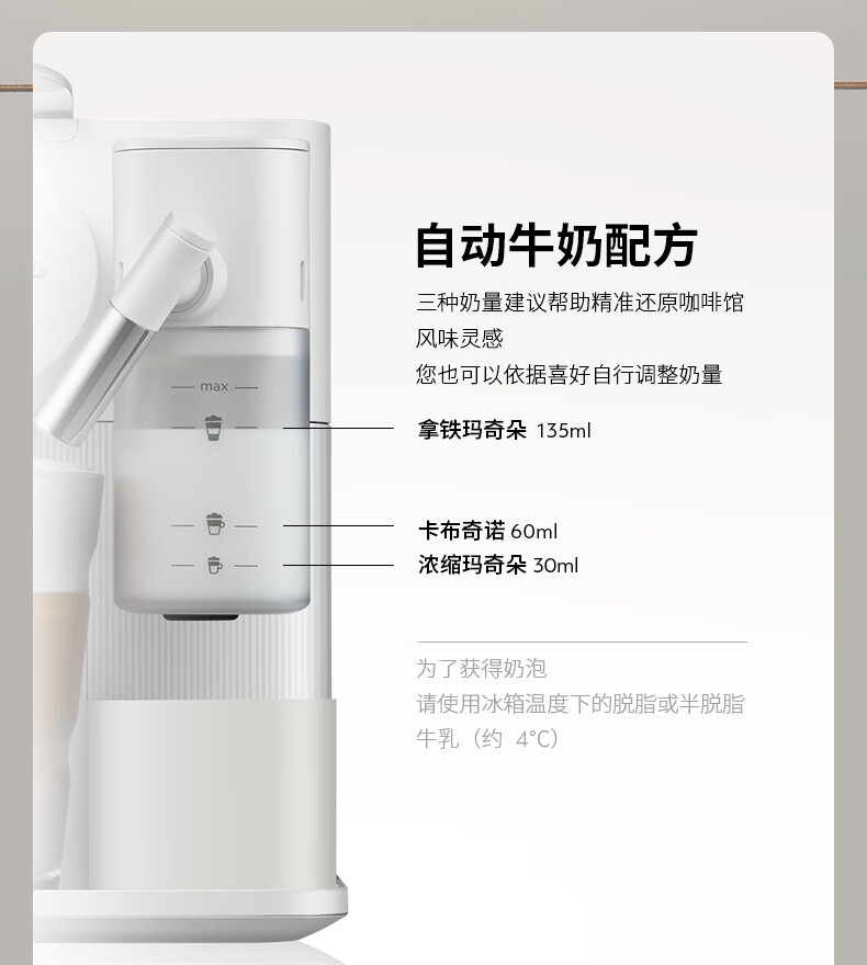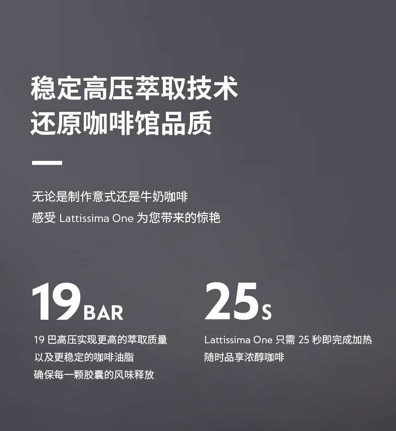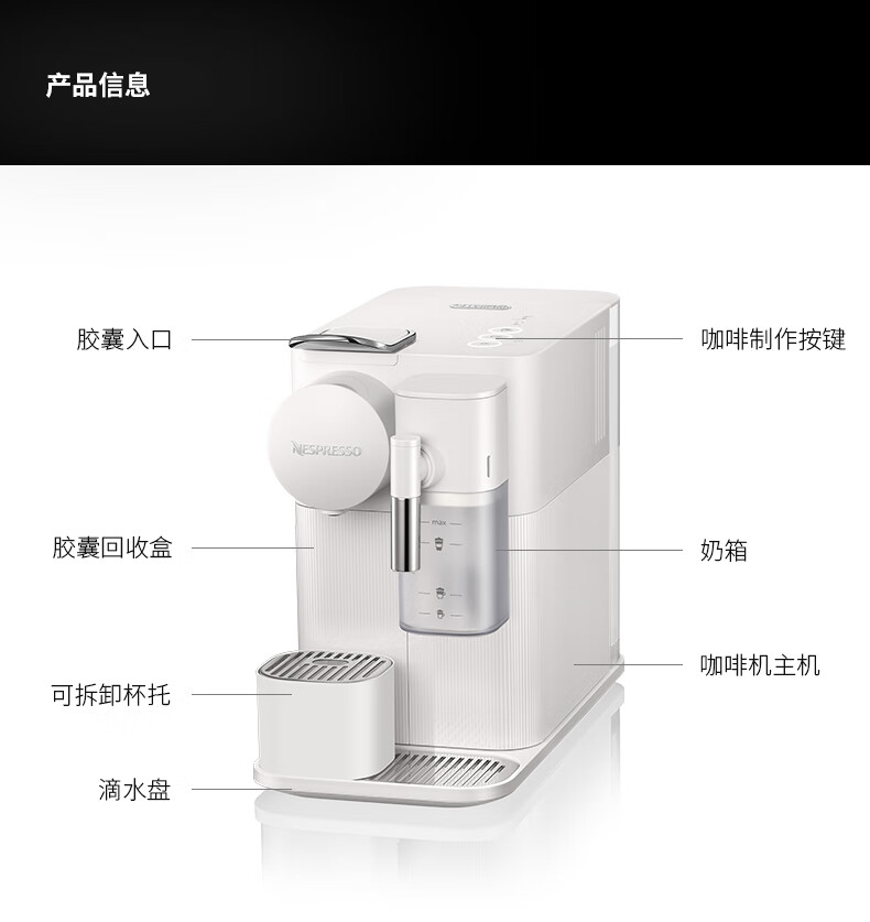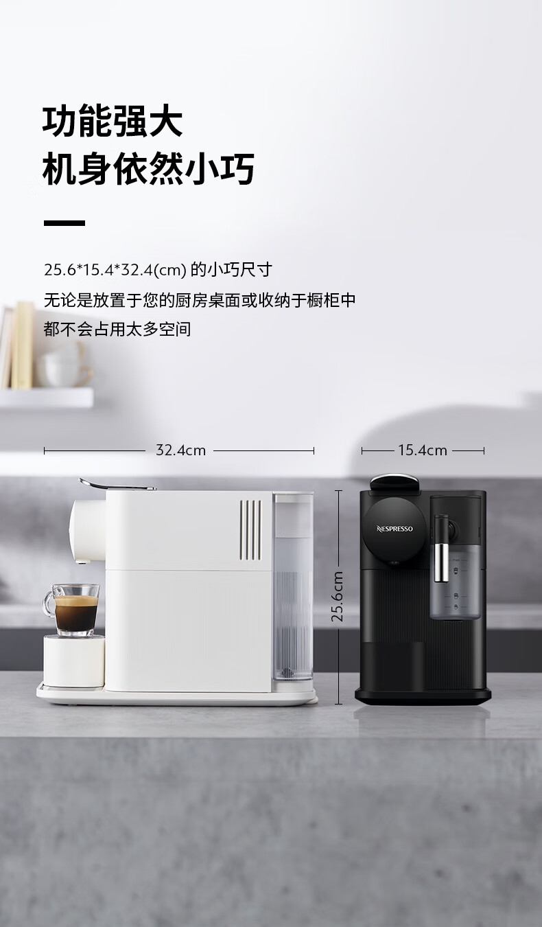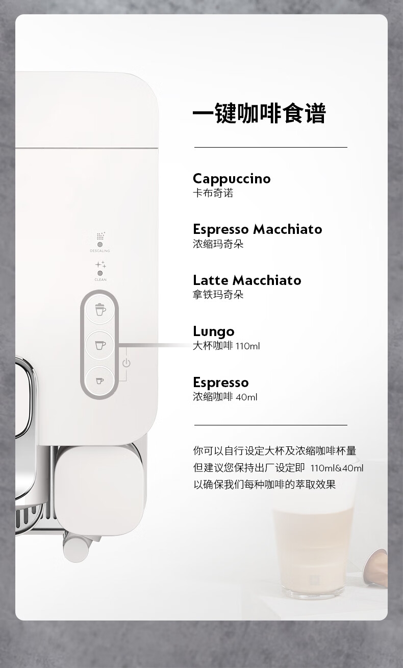 大容量奶泡一体高压萃取;强劲黑咖、香浓奶咖,一键搞定;功能强大机身小巧
