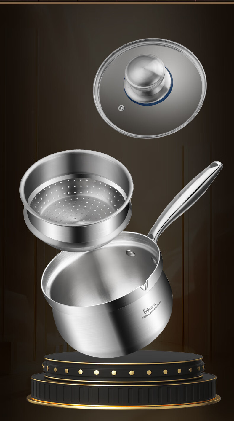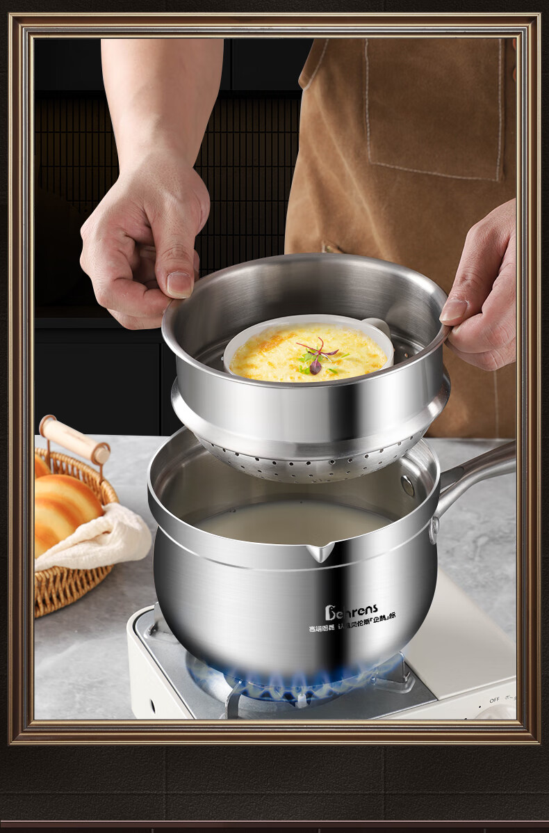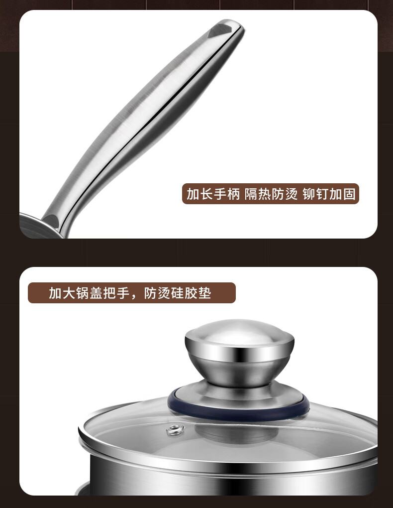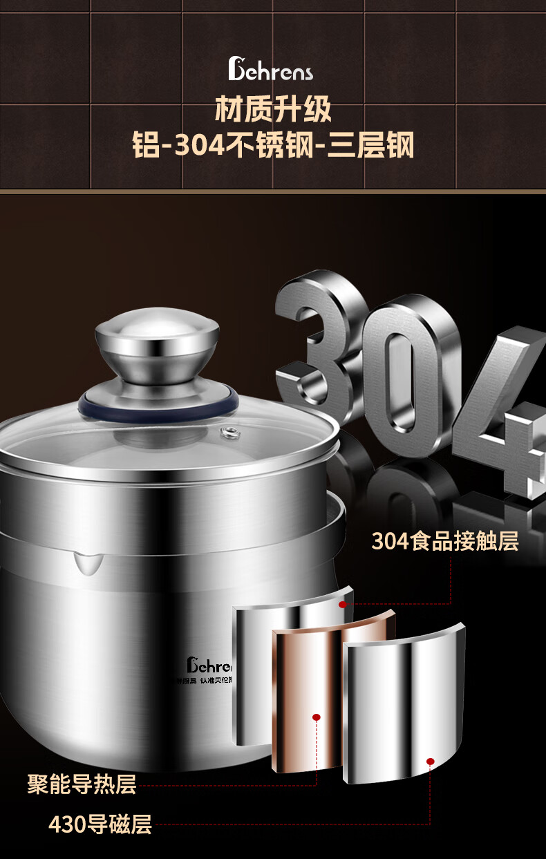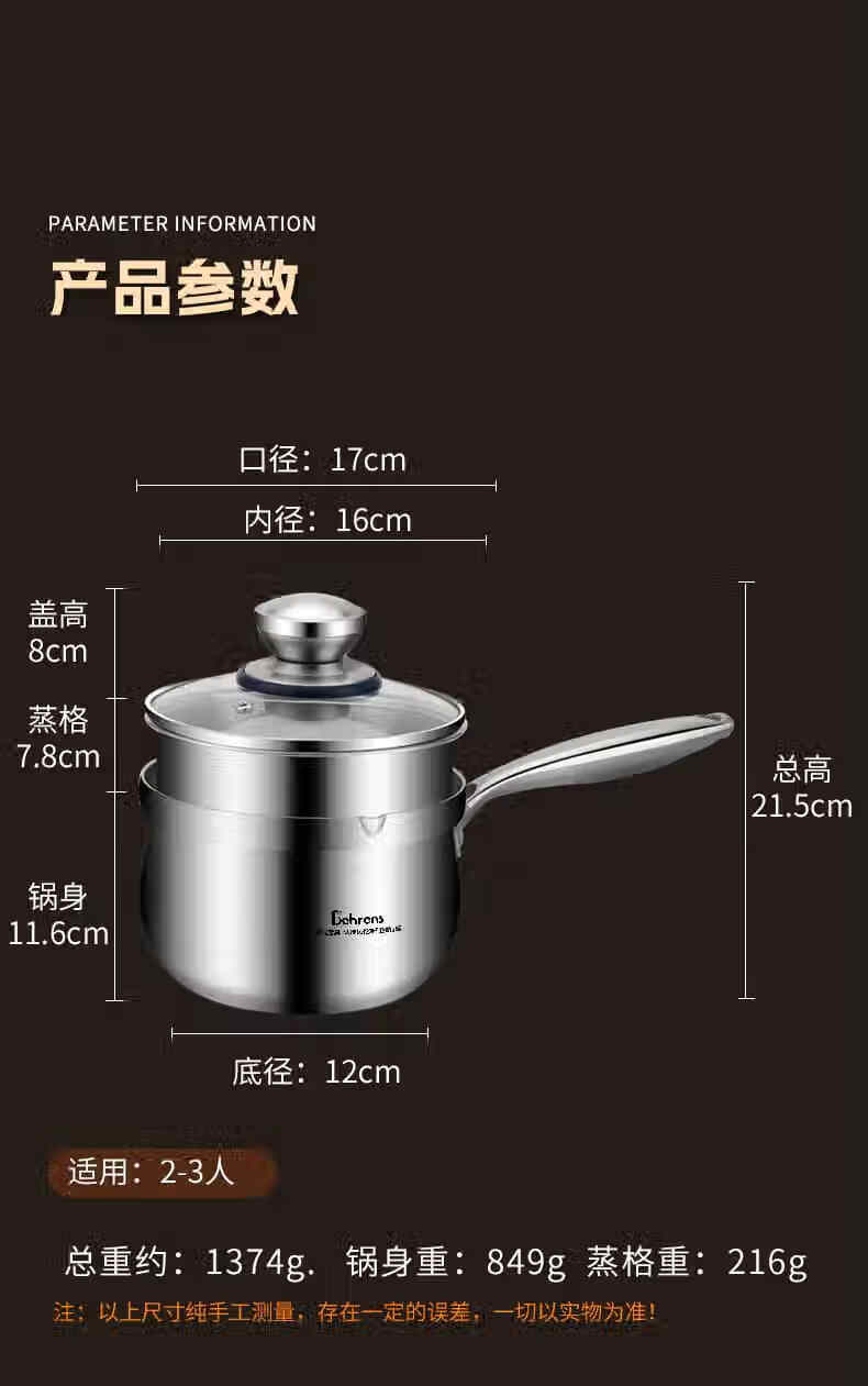 加厚SUS304三层钢一体成型,受热均匀,导热快;可视钢化玻璃盖,烹饪过程随时可视;可热奶、煮面、煮汤、蒸蛋、蒸包子等,一锅多用