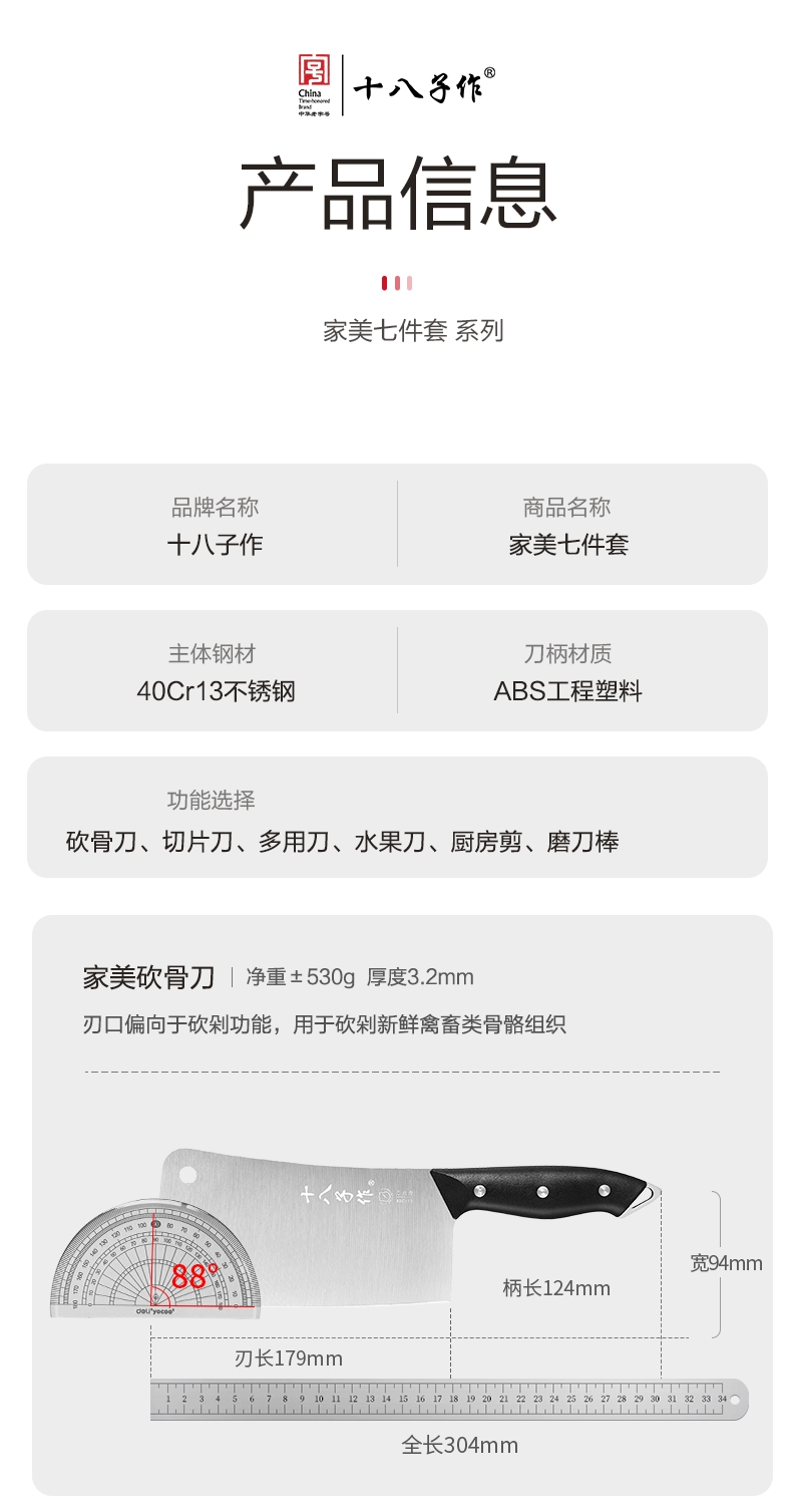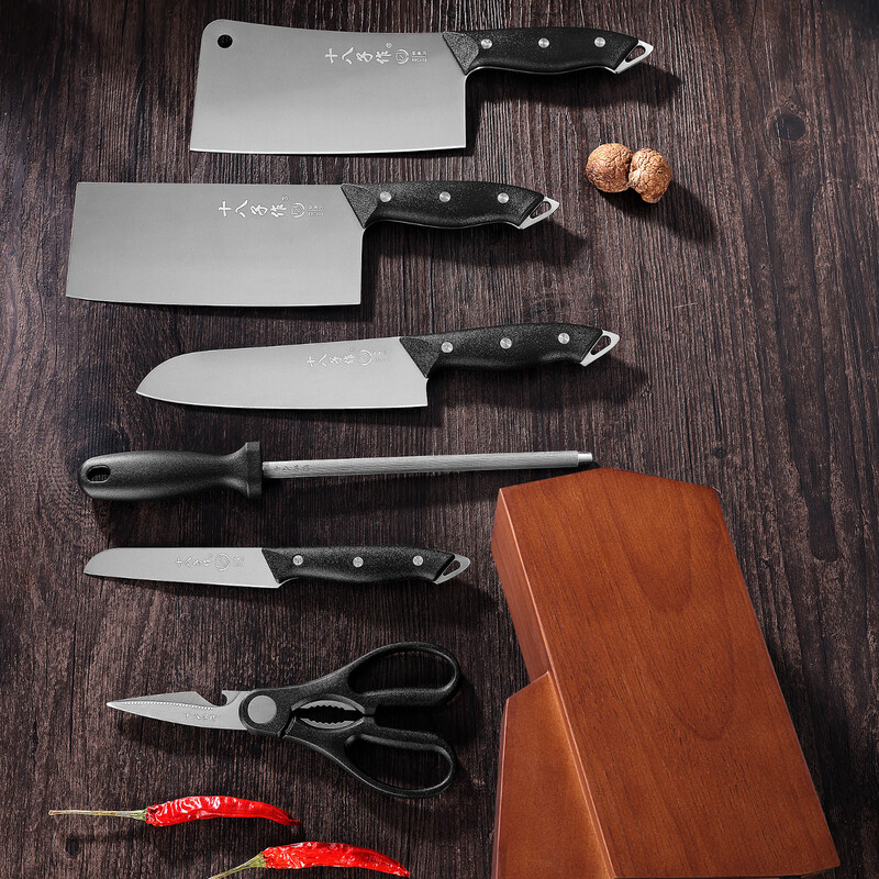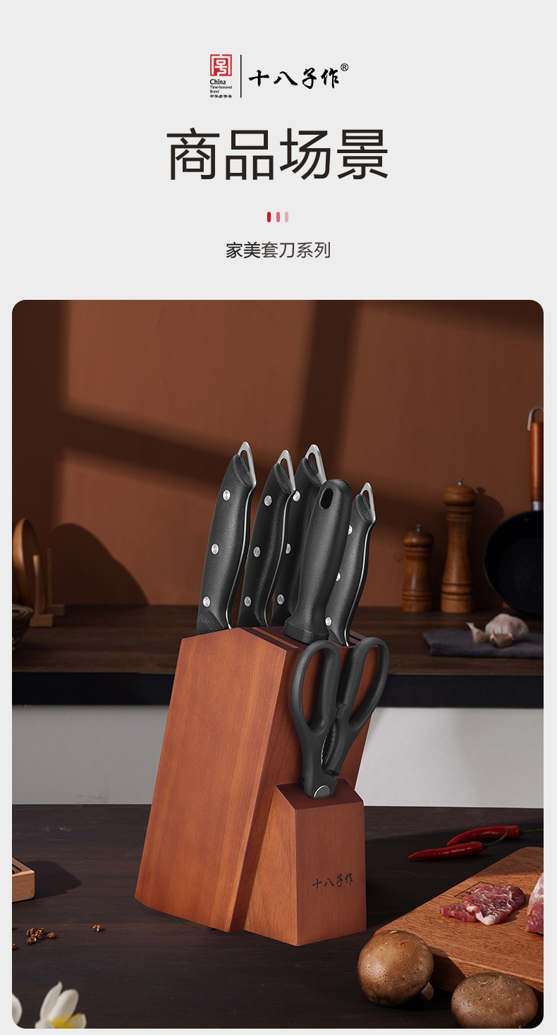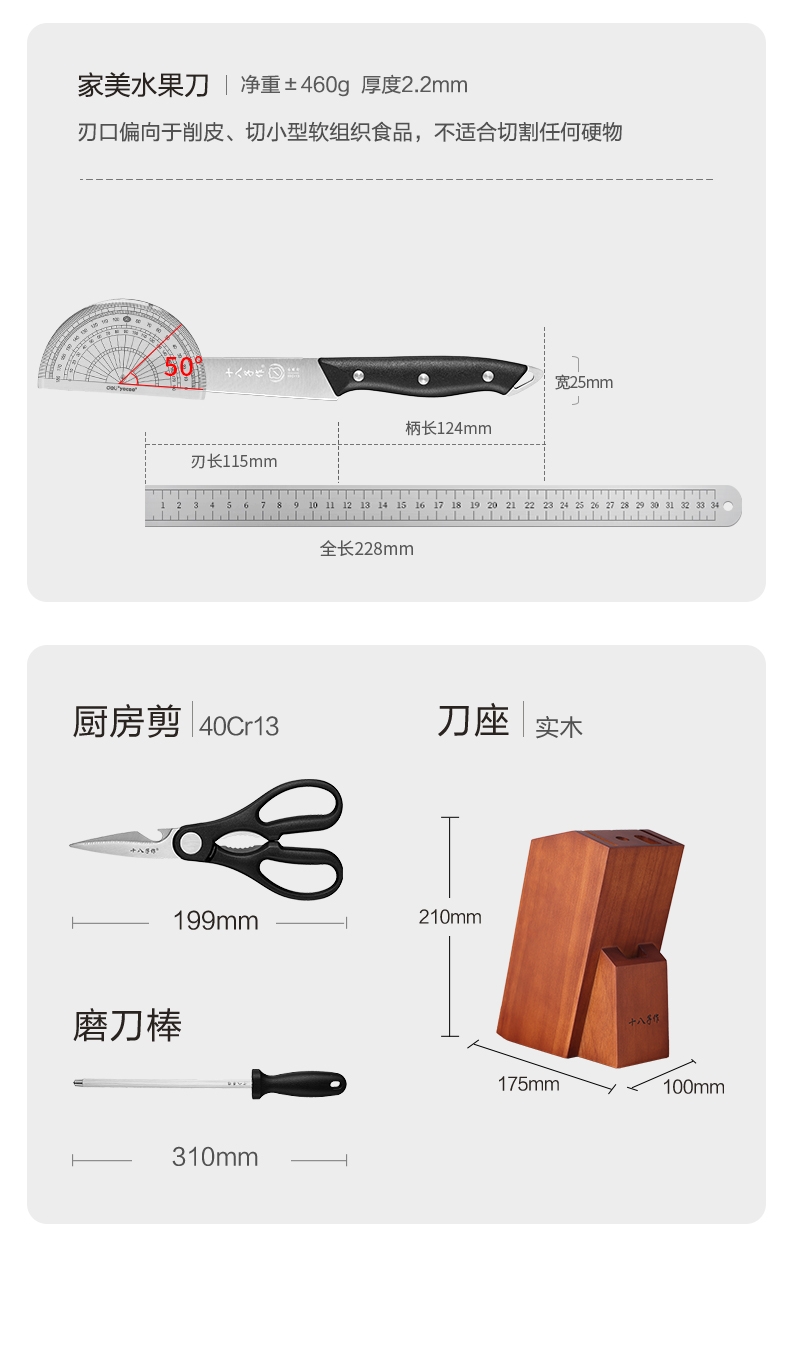 配置清单:砍骨刀,切片刀,多用刀,水果刀、剪刀,刀座、磨刀棒