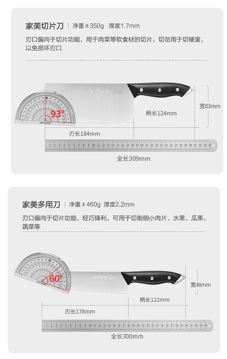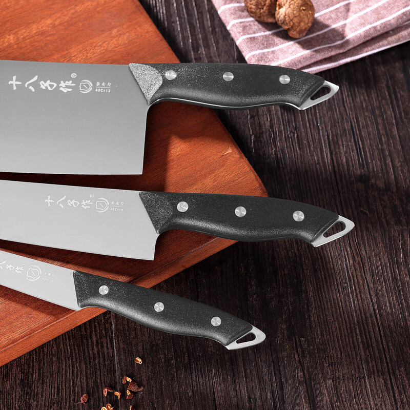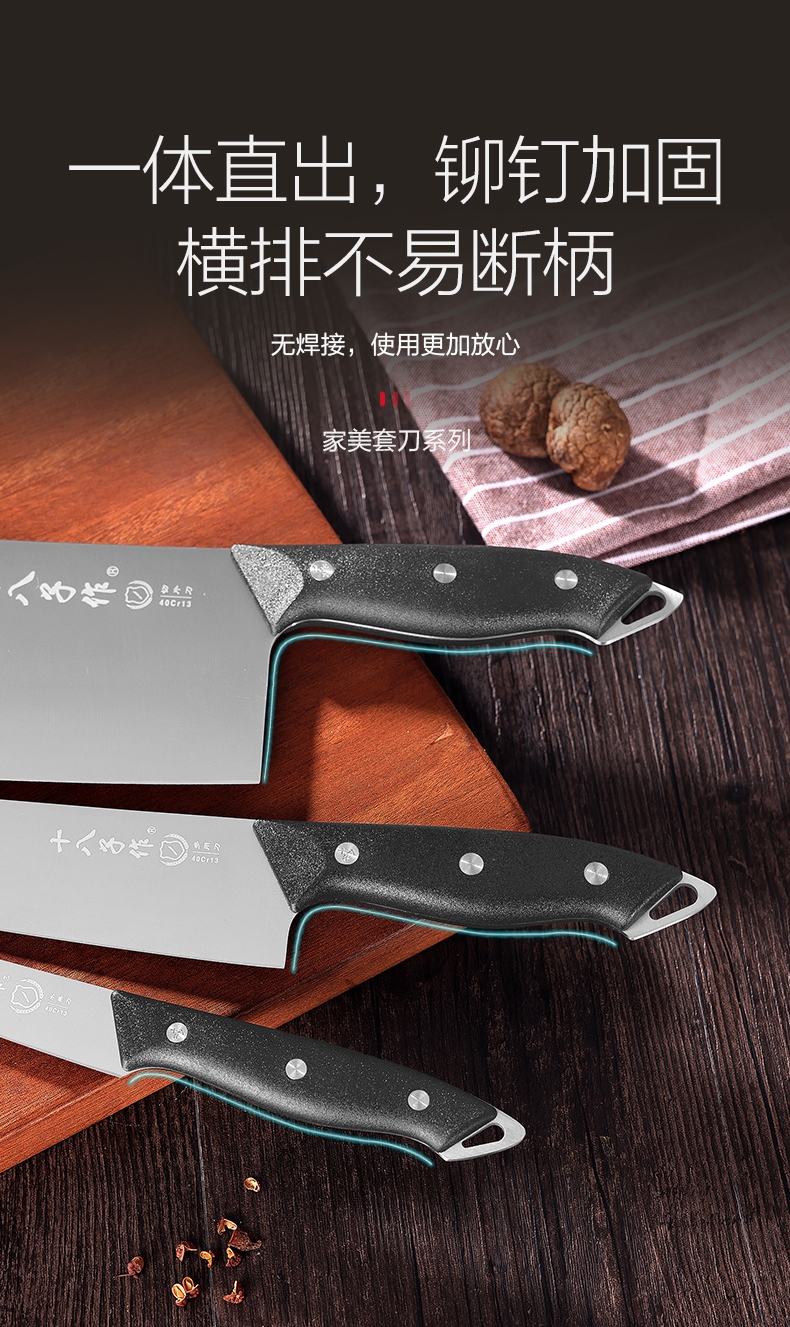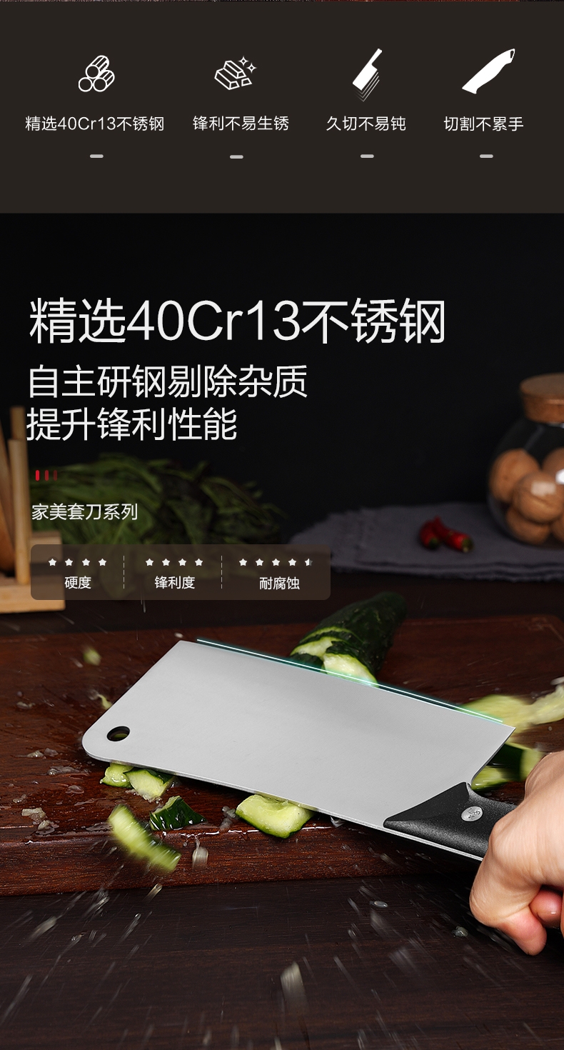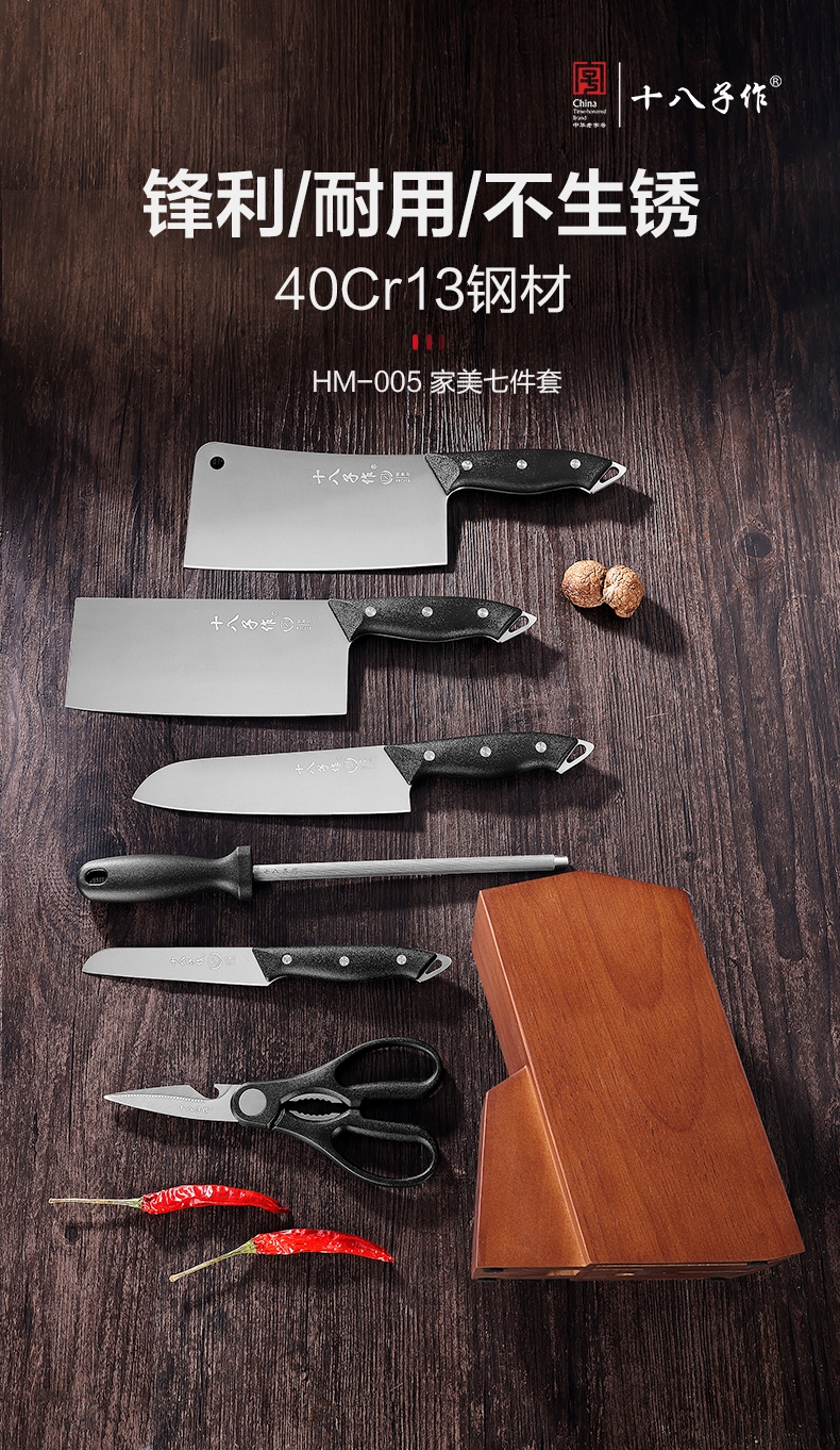 配置清单:砍骨刀,切片刀,多用刀,水果刀、剪刀,刀座、磨刀棒