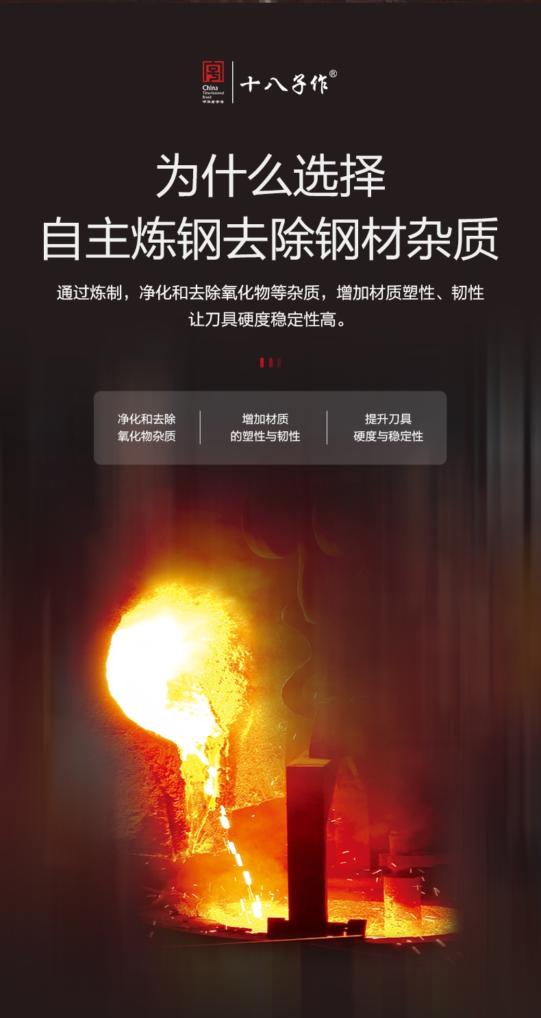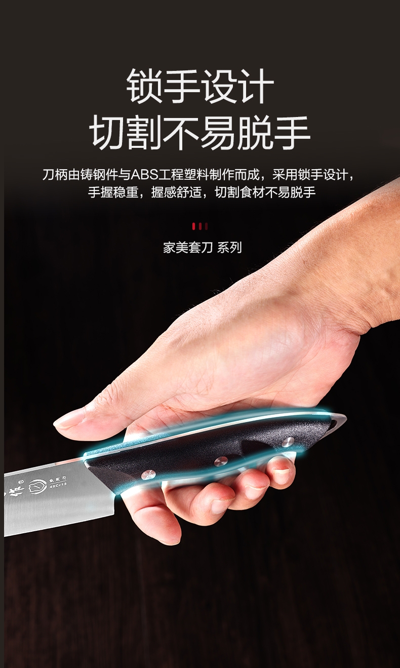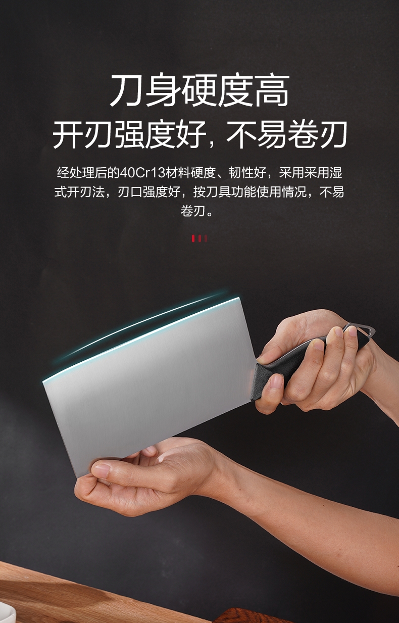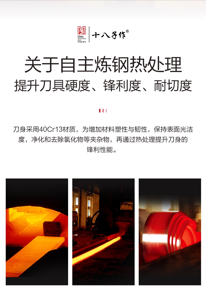 刀身采用40Cr13材质,为增加材料塑性与韧性;净化去除氯化物等夹杂物再通过热处理提升刀身的锋利;采用锁手设计,手握稳重,握感舒适